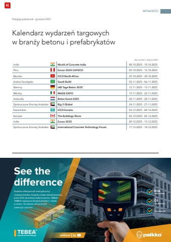 AKTUALNO%u015aCIwww.cpi-worldwide.com%u0009 ZBI %u2013 Zak%u0142ady Betonowe International %u2013 5 | 2025 17Indie World of Concrete India 08.10.2025 - 10.10.2025Peru Excon 2024 CAPECO 09.10.2025 - 12.10.2025Maroko ICCX North Africa 29.10.2025 - 30.10.2025Arabia Saudyjska Saudi Build 03.11.2025 - 06.11.2025Niemcy IAB Tage Beton 2025 12.11.2025 - 13.11.2025W%u0142ochy MADE EXPO 19.11.2025 - 22.11.2025Holandia Beton Event 2025 20.11.2025 - 20.11.2025Zjednoczone Emiraty Arabskie Big 5 Global 24.11.2025 - 27.11.2025Kazachstan ICCX Eurasia 03.12.2025 - 04.12.2025Kanada The Buildings Show 03.12.2025 - 05.12.2025Indie Excon 2025 09.12.2025 - 13.12.2025Zjednoczone Emiraty Arabskie International Concrete Technology Forum 17.12.2025 - 18.12.2025Kalendarz wydarze%u0144 targowych w bran%u017cy betonu i prefabrykat%u00f3wPrzegl%u0105d pa%u017adziernik %u2013 grudzie%u0144 2025Stan na dzie%u0144 1 sierpnia 2025 r.peikko.plZwi%u0119ksz efektywno%u015b%u0107 energetyczn%u0105 i bezpiecze%u0144stwo budynku dzi%u0119ki zatwierdzonemu przez ETA %u0142%u0105cznikowi balkonowemu TEBEA%u00ae. TEBEA%u00ae zapewnia bezpiecze%u0144stwo i ciep%u0142o w domu. To r%u00f3%u017cnica, kt%u00f3r%u0105 mo%u017cna zobaczy%u0107 i poczu%u0107.See the differenceETA zatwierdzonyOgnioodpornycertyfikowany%u0141%u0105cznik termoizolacyjnyTEBEA%u00ae