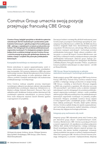 AKTUALNO%u015aCI18 ZBI %u2013 Zak%u0142ady Betonowe International %u2013 5 | 2025 www.cpi-worldwide.comConstrux Group, belgijski specjalista w dziedzinie system%u00f3w szalunkowych dla firm budowlanych i producent%u00f3w prefabrykat%u00f3w betonowych, og%u0142osi%u0142a przej%u0119cie francuskiej grupy CBE %u2013 jednego z najwi%u0119kszych na %u015bwiecie producent%u00f3w szalunk%u00f3w i linii obiegowych do produkcji prefabrykowanych segment%u00f3w tunelowych. To strategiczne przej%u0119cie stanowi kolejny krok w ambitnej strategii wzrostu Construx Group i umacnia pozycj%u0119 tej grupy jako globalnego dostawcy szalunk%u00f3w, maszyn i urz%u0105dze%u0144 dla przemys%u0142u prefabrykat%u00f3w betonowych.Europejska konsolidacja na niszowym rynkuBran%u017ca szalunkowa to wysoce wyspecjalizowany rynek niszowy, zdominowany niemal wy%u0142%u0105cznie przez przedsi%u0119biorstwa europejskie. Od momentu za%u0142o%u017cenia w 2003 roku przez Anthony%u2019ego Jannesa i Warda Demyttenaere%u2019a firma Construx ugruntowa%u0142a swoj%u0105 pozycj%u0119 na rynku globalnym dzi%u0119ki szerokiemu portfolio rozwi%u0105za%u0144 szalunkowych dla budownictwa prefabrykowanego i monolitycznego.Firma Construx realizuje wszystkie procesy in%u017cynieryjne i produkcyjne ca%u0142kowicie we w%u0142asnym zakresie i jak prawdziwe przedsi%u0119biorstwo produkcyjne dysponuje dziewi%u0119cioma zak%u0142adami w Belgii, Holandii, Niemczech i Rumunii. Pi%u0119%u0107 z tych zak%u0142ad%u00f3w pe%u0142ni dodatkowo funkcj%u0119 park%u00f3w dzier%u017cawnych dla modu%u0142owych system%u00f3w szalunkowych, za pomoc%u0105 kt%u00f3rych firma mo%u017ce elastycznie wspiera%u0107 swoich klient%u00f3w zgodnie z wymaganiami ich projekt%u00f3w.Znacz%u0105cym krokiem w strategii Buy-&-Build realizowanej przez Construx by%u0142o ju%u017c przej%u0119cie niemieckiego specjalisty ds. automatyzacji, firmy Weckenmann, w 2023 roku. W 2024 roku firma Construx osi%u0105gn%u0119%u0142a dzi%u0119ki temu skonsolidowany przych%u00f3d w wysoko%u015bci 70 milion%u00f3w euro, zatrudniaj%u0105c 380 pracownik%u00f3w w obszarze rozwi%u0105za%u0144 szalunkowych i technologii produkcji prefabrykat%u00f3w betonowych. Dzi%u0119ki udanym projektom referencyjnym w ponad 80 krajach Construx-Weckenmann jest dzi%u015b jedn%u0105 z czo%u0142owych marek w mi%u0119dzynarodowym przemy%u015ble prefabrykat%u00f3w betonowych. Obecnie grupa realizuje projekty wielkopowierzchniowych linii obiegowych dla klient%u00f3w w Wielkiej Brytanii, Portugalii, Kanadzie i Polsce, uzupe%u0142nione licznymi projektami szalunkowymi na ca%u0142ym %u015bwiecie %u2013 od USA po Now%u0105 Zelandi%u0119.CBE Group: Nowe kompetencje w zakresie szalunk%u00f3w tunelowych i technologii podnoszeniaDzi%u0119ki przej%u0119ciu grupy CBE, obejmuj%u0105cej CBE Francja, Acimex Francja, CBE Chiny i Acimex Chiny, Construx rozszerza swoje portfolio o kolejnego du%u017cego producenta ze swojej bran%u017cy. CBE Group z siedzib%u0105 w Saint-Avertin (Francja) osi%u0105gn%u0119%u0142a w 2024 roku przych%u00f3d w wysoko%u015bci 28 milion%u00f3w euro przy 310 pracownikach i jest liderem rynku w zakresie rozwi%u0105za%u0144 szalunkowych oraz linii obiegowych do produkcji prefabrykowanych segment%u00f3w tunelowych. Jednym z wielu projekt%u00f3w referencyjnych CBE jest produkcja form do prefabrykowanych betonowych segment%u00f3w tunelowych na potrzeby projektu Eurotunnel. Przej%u0119cie umo%u017cliwi%u0142o Construx Group wej%u015bcie w nowy segment rynku i powi%u0119kszy%u0142o grup%u0119 o cztery dodatkowe zak%u0142ady produkcyjne. Ponadto, dzi%u0119ki sp%u00f3%u0142ce zale%u017cnej Acimex, Construx zyska%u0142a dost%u0119p do wysoko wyspecjalizowanych technologii podnoszenia ci%u0119%u017ckich %u0142adunk%u00f3w, w kt%u00f3rych kluczow%u0105 rol%u0119 odgrywa technologia pr%u00f3%u017cniowa.Integracja przy zachowaniu si%u0142y markiIntegracja grupy CBE odpowiada jasnej wizji Construx, jak%u0105 jest stworzenie grupy silnych i komplementarnych marek. Construx, Weckenmann, CBE i Acimex s%u0105 wiod%u0105cymi firmami w swoich segmentach. Ich wsp%u00f3%u0142praca umo%u017cliwia po%u0142%u0105czenie efekt%u00f3w skali, wiedzy technologicznej i zasi%u0119gu rynkowego. Zesp%u00f3%u0142 zarz%u0105dzaj%u0105cy b%u0119dzie aktywnie wspiera%u0142 synergie mi%u0119dzy firmami, aby jeszcze bardziej przyspieszy%u0107 innowacje, rozw%u00f3j produkt%u00f3w oraz wzrost na rynkach mi%u0119dzynarodowych. Obecno%u015b%u0107 operacyjna CBE i Acimex w Chinach stanowi przewag%u0119 strategiczn%u0105 w procesie mi%u0119dzynarodowej ekspansji Construx Group umacnia swoj%u0105 pozycj%u0119 przejmuj%u0105c francusk%u0105 CBE GroupConstrux Weckenmann, 8531 Hulste, BelgiaOd lewej do prawej: Anthony Jannes, Philippe Samama (by%u0142y Dyrektor Zarz%u0105dzaj%u0105cy CBE Group), Julien Travers, Ward Demyttenaere.