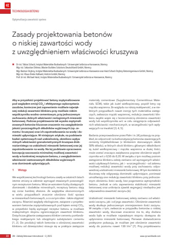 TECHNOLOGIA BETONU22 ZBI %u2013 Zak%u0142ady Betonowe International %u2013 5 | 2025 www.cpi-worldwide.comAby w przysz%u0142o%u015bci projektowa%u0107 betony zoptymalizowane pod wzgl%u0119dem emisji CO2 i efektywnego wykorzystania zasob%u00f3w, konieczne jest zapewnienie mo%u017cliwie najwi%u0119kszej redukcji zawarto%u015bci klinkieru przy mo%u017cliwie niskim wsp%u00f3%u0142czynniku wodno-cementowym, przy jednoczesnym zachowaniu dobrych w%u0142a%u015bciwo%u015bci reologicznych mieszanki betonowej. Podczas projektowania tak wysoko zoptymalizowanych beton%u00f3w kluczowe znaczenie ma uwzgl%u0119dnienie jako%u015bci poszczeg%u00f3lnych sk%u0142adnik%u00f3w wyj%u015bciowych (np. cementu i kruszywa) oraz ich zapotrzebowania na wod%u0119 i domieszki up%u0142ynniaj%u0105ce. W niniejszym artykule, na podstawie bada%u0144 systemowych nad urabialno%u015bci%u0105, okre%u015blono wp%u0142yw r%u00f3%u017cnych w%u0142a%u015bciwo%u015bci granulometrycznych kruszywa drobnoziarnistego na urabialno%u015b%u0107 mieszanki betonowej oraz jej zapotrzebowanie na wod%u0119. Na tej podstawie opracowano koncepcj%u0119 szacowania minimalnej mo%u017cliwej zawarto%u015bci wody w konkretnej recepturze betonu, z uwzgl%u0119dnieniem w%u0142a%u015bciwo%u015bci zastosowanych sk%u0142adnik%u00f3w wyj%u015bciowych oraz domieszek up%u0142ynniaj%u0105cych.1 Wst%u0119pWe wsp%u00f3%u0142czesnej technologii betonu zasz%u0142y w ostatnich latach istotne zmiany w zakresie wymaga%u0144 stawianych poszczeg%u00f3lnym recepturom betonu. Wraz ze wzrostem liczby dost%u0119pnych domieszek i dodatk%u00f3w mineralnych, receptury betonu staj%u0105 si%u0119 coraz bardziej z%u0142o%u017cone. Ze wzgl%u0119d%u00f3w ekonomicznych w wielu przypadkach znacznie obni%u017cono ilo%u015b%u0107 spoiwa w mieszankach betonowych, a co za tym idzie %u2013 tak%u017ce obj%u0119to%u015b%u0107 zaczynu. R%u00f3wnie%u017c wzgl%u0119dy ekologiczne, zwi%u0105zane z projektowaniem beton%u00f3w zoptymalizowanych pod k%u0105tem emisji CO2, w przysz%u0142o%u015bci b%u0119d%u0105 wymaga%u0107 receptur betonu w mo%u017cliwie maksymalnym stopniu ograniczaj%u0105cym zawarto%u015b%u0107 klinkieru. Dotychczas g%u0142%u00f3wnie zast%u0119powano klinkier cementu portlandzkiego reaktywnymi lub oboj%u0119tnymi substytutami cementu [1, 2]. Do produkcji takich beton%u00f3w o obni%u017conej zawarto%u015bci klinkieru od dziesi%u0119cioleci stosuje si%u0119 w praktyce zast%u0119pcze materia%u0142y cementowe (Supplementary Cementitious Materials, SCM), takie jak %u017cu%u017cel wielkopiecowy, popi%u00f3%u0142 lotny czy m%u0105czka wapienna. Ze wzgl%u0119du na ni%u017csz%u0105 reaktywno%u015b%u0107, a w niekt%u00f3rych przypadkach nawet inercj%u0119 tych materia%u0142%u00f3w zast%u0119pczych, zw%u0142aszcza m%u0105czki wapiennej, redukcja zawarto%u015bci klinkieru zwykle wi%u0105%u017ce si%u0119 z konieczno%u015bci%u0105 obni%u017cenia zawarto%u015bci wody lub wsp%u00f3%u0142czynnika w/c w celu osi%u0105gni%u0119cia odpowiednich w%u0142a%u015bciwo%u015bci mechanicznych, w szczeg%u00f3lno%u015bci tych wp%u0142ywaj%u0105cych na trwa%u0142o%u015b%u0107 [3, 4, 5].Badania przeprowadzone przez Palm i in. [4] pokazuj%u0105 na przyk%u0142ad, %u017ce odporno%u015b%u0107 na karbonatyzacj%u0119 beton%u00f3w zawieraj%u0105cych cementy tr%u00f3jsk%u0142adnikowe (z klinkierem stanowi%u0105cym oko%u0142o 50% sk%u0142adu), w kt%u00f3rych obok klinkieru g%u0142%u00f3wnymi sk%u0142adnikami s%u0105 %u017cu%u017cel wielkopiecowy i m%u0105czka wapienna w du%u017cej ilo%u015bci, mo%u017ce zosta%u0107 znacz%u0105co zwi%u0119kszona poprzez obni%u017cenie wsp%u00f3%u0142czynnika w/c z 0,50 do 0,35. W zwi%u0105zku z tym mo%u017cliwy poziom zast%u0105pienia klinkieru zale%u017cy zar%u00f3wno od wymaganych w%u0142a%u015bciwo%u015bci u%u017cytkowych betonu, jak i %u2013 w szczeg%u00f3lno%u015bci %u2013 od zakresu mo%u017cliwej redukcji zawarto%u015bci wody przy zachowaniu odpowiedniej urabialno%u015bci mieszanki betonowej. W tym kontek%u015bcie kluczow%u0105 rol%u0119 odgrywaj%u0105 domieszki up%u0142ynniaj%u0105ce, poniewa%u017c umo%u017cliwiaj%u0105 one redukcj%u0119 zawarto%u015bci klinkieru przy jednoczesnym obni%u017ceniu ilo%u015bci wody, bez pogorszenia wytrzyma%u0142o%u015bci betonu. Jednak w celu zapewnienia stabilno%u015bci mieszanki betonowej oraz unikni%u0119cia zjawisk segregacji niezb%u0119dna jest odpowiednia zawarto%u015b%u0107 zaczynu [6].Urabialno%u015b%u0107 mieszanki betonowej zale%u017cy zar%u00f3wno od w%u0142a%u015bciwo%u015bci zaczynu, jak i od jego zawarto%u015bci. Obni%u017cenie zawarto%u015bci wody skutkuje jednoczesnym zmniejszeniem ilo%u015bci zaczynu. W zwi%u0105zku z tym, zw%u0142aszcza w przypadku beton%u00f3w o niskiej zawarto%u015bci wody, kluczowe znaczenie ma to, aby dodana woda by%u0142a w mo%u017cliwie najwi%u0119kszym stopniu dost%u0119pna do up%u0142ynnienia mieszanki betonowej. Pierwsze do%u015bwiadczenia praktyczne pokazuj%u0105, %u017ce mo%u017cliwe jest obni%u017cenie zawarto%u015bci wody do poziomu nawet 130 l/m3 [7]. Przy projektowaniu Zasady projektowania beton%u00f3w o niskiej zawarto%u015bci wody z uwzgl%u0119dnieniem w%u0142a%u015bciwo%u015bci kruszywaOptymalizacja zawarto%u015bci spoiwan%u0009 Dr in%u017c.Tobias Schack, Instytut Materia%u0142%u00f3w Budowlanych / Uniwersytet Leibniza w Hanowerze, Niemcy%u0009 Mgr in%u017c. Sebastian Dittmar, Master Builders Solutions Deutschland GmbH, Niemcy%u0009 Mgr Bastian Strybny, Instytut Materia%u0142%u00f3w Budowlanych / Uniwersytet Leibniza w Hanowerze oraz Haist Schack Strybny Betoningenieure GmbH, Niemcy%u0009 Mgr in%u017c. Klaus-Dieter Kallweit, Holcim GmbH, Niemcy%u0009 Prof. dr in%u017c. Michael Haist, Instytut Materia%u0142%u00f3w Budowlanych / Uniwersytet Leibniza w Hanowerze, Niemcy
