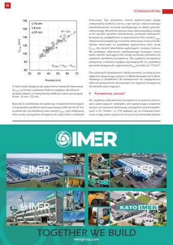 TECHNOLOGIA BETONUwww.cpi-worldwide.com%u0009 ZBI %u2013 Zak%u0142ady Betonowe International %u2013 5 | 2025 27Rysunek 3 przedstawia konsystencj%u0119 mieszanek betonowych o maksymalnej wielko%u015bci ziarna wynosz%u0105cej od 8 mm do 32 mm w zale%u017cno%u015bci od okre%u015blonej ilo%u015bci wody Vw,flow, czyli efektywnej ilo%u015bci wody rzeczywi%u015bcie dost%u0119pnej do up%u0142ynnienia mieszanki betonowej. Tym sposobem mo%u017cna wyeliminowa%u0107 wp%u0142yw maksymalnej wielko%u015bci ziarna, a tym samym zr%u00f3%u017cnicowanego zapotrzebowania na wod%u0119 wynikaj%u0105cego ze sk%u0142adu granulometrycznego. Wcze%u015bniej opisany du%u017cy rozrzut wynik%u00f3w zostaje w ten spos%u00f3b wyra%u017anie zredukowany, poniewa%u017c w%u0142a%u015bciwo%u015bci kruszywa s%u0105 uwzgl%u0119dnione w wyznaczonej ilo%u015bci wody Vw,flow. Otrzyman%u0105 konsystencj%u0119 mieszanki betonowej mo%u017cna bardzo dobrze oszacowa%u0107 na podstawie wyznaczonej ilo%u015bci wody Vw,flow dla r%u00f3%u017cnych sk%u0142adnik%u00f3w wyj%u015bciowych i receptur betonu. Na podstawie w%u0142a%u015bciwo%u015bci zastosowanego kruszywa mo%u017cna zatem okre%u015bli%u0107 wymagan%u0105 ilo%u015b%u0107 wody zarobowej potrzebn%u0105 do uzyskania okre%u015blonej konsystencji. Dla uzyskania konsystencji plastycznej o %u015brednicy rozp%u0142ywu wynosz%u0105cej 45 cm, potrzebna jest woda dost%u0119pna do up%u0142ynnienia (Vw,flow) w ilo%u015bci ok. 115 l/m3.Przy opisanych rozwa%u017caniach nale%u017cy pami%u0119ta%u0107, %u017ce dotycz%u0105 one wy%u0142%u0105cznie klasycznego systemu 3-sk%u0142adnikowego lub 4-sk%u0142adnikowego (z dodatkiem). W rozwa%u017caniach nie uwzgl%u0119dniono obecnie powszechnie stosowanych do regulacji konsystencji domieszek up%u0142ynniaj%u0105cych. 4 Konsystencja %u201ezerowa%u201cDo uzyskania odpowiedniej konsystencji za pomoc%u0105 domieszek up%u0142ynniaj%u0105cych niezb%u0119dna jest wystarczaj%u0105ca zawarto%u015b%u0107 zaczynu w mieszance betonowej, szczeg%u00f3lnie przy konsystencjach %u2265 F3. Thielen i in. [14] wykazali ju%u017c, %u017ce mieszanki betonowe mog%u0105 zosta%u0107 up%u0142ynnione za pomoc%u0105 domieszek jedynie 3. Ilo%u015b%u0107 wody dost%u0119pna do up%u0142ynnienia mieszanki betonowej (Vw,flow) w funkcji uzyskanej %u015brednicy rozp%u0142ywu dla r%u00f3%u017cnych receptur betonu o maksymalnej wielko%u015bci ziarna wynosz%u0105cej 8 mm, 16 mm i 32 mm.VW,flow [l/m3]Rozp%u0142yw [cm]