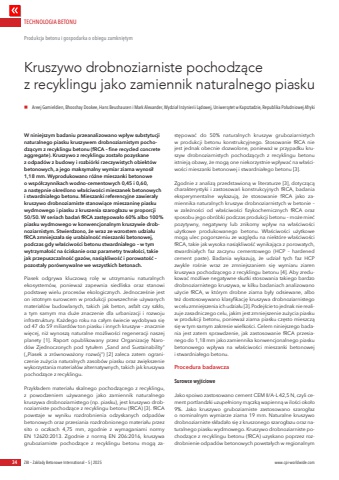 TECHNOLOGIA BETONU34 ZBI %u2013 Zak%u0142ady Betonowe International %u2013 5 | 2025 www.cpi-worldwide.comW niniejszym badaniu przeanalizowano wp%u0142yw substytucji naturalnego piasku kruszywem drobnoziarnistym pochodz%u0105cym z recyklingu betonu (fRCA %u2013 fine recycled concrete aggregate). Kruszywo z recyklingu zosta%u0142o pozyskane z odpad%u00f3w z budowy i rozbi%u00f3rki rzeczywistych obiekt%u00f3w betonowych, a jego maksymalny wymiar ziarna wynosi%u0142 1,18 mm. Wyprodukowano r%u00f3%u017cne mieszanki betonowe o wsp%u00f3%u0142czynnikach wodno-cementowych 0,45 i 0,60, a nast%u0119pnie okre%u015blono w%u0142a%u015bciwo%u015bci mieszanek betonowych i stwardnia%u0142ego betonu. Mieszanki referencyjne zawiera%u0142y kruszywo drobnoziarniste stanowi%u0105ce mieszanin%u0119 piasku wydmowego i piasku z kruszenia szarog%u0142azu w proporcji 50/50. W seriach bada%u0144 fRCA zast%u0119powa%u0142o 60% albo 100% piasku wydmowego w konwencjonalnym kruszywie drobnoziarnistym. Stwierdzono, %u017ce wraz ze wzrostem udzia%u0142u fRCA zmniejsza%u0142a si%u0119 urabialno%u015b%u0107 mieszanki betonowej, podczas gdy w%u0142a%u015bciwo%u015bci betonu stwardnia%u0142ego %u2013 w tym wytrzyma%u0142o%u015b%u0107 na %u015bciskanie oraz parametry trwa%u0142o%u015bci, takie jak przepuszczalno%u015b%u0107 gaz%u00f3w, nasi%u0105kliwo%u015b%u0107 i porowato%u015b%u0107 %u2013 pozosta%u0142y por%u00f3wnywalne we wszystkich betonach.Piasek odgrywa kluczow%u0105 rol%u0119 w utrzymaniu naturalnych ekosystem%u00f3w, poniewa%u017c zapewnia siedliska oraz stanowi podstaw%u0119 wielu proces%u00f3w ekologicznych. Jednocze%u015bnie jest on istotnym surowcem w produkcji powszechnie u%u017cywanych materia%u0142%u00f3w budowlanych, takich jak beton, asfalt czy szk%u0142o, a tym samym ma du%u017ce znaczenie dla urbanizacji i rozwoju infrastruktury. Ka%u017cdego roku na ca%u0142ym %u015bwiecie wydobywa si%u0119 od 47 do 59 miliard%u00f3w ton piasku i innych kruszyw %u2013 znacznie wi%u0119cej, ni%u017c wynosz%u0105 naturalne mo%u017cliwo%u015bci regeneracji naszej planety [1]. Raport opublikowany przez Organizacj%u0119 Narod%u00f3w Zjednoczonych pod tytu%u0142em %u201eSand and Sustainability%u201d (%u201ePiasek a zr%u00f3wnowa%u017cony rozw%u00f3j%u201d) [2] zaleca zatem ograniczenie zu%u017cycia naturalnych zasob%u00f3w piasku oraz zwi%u0119kszenie wykorzystania materia%u0142%u00f3w alternatywnych, takich jak kruszywa pochodz%u0105ce z recyklingu.Przyk%u0142adem materia%u0142u skalnego pochodz%u0105cego z recyklingu, z powodzeniem u%u017cywanego jako zamiennik naturalnego kruszywa drobnoziarnistego (np. piasku), jest kruszywo drobnoziarniste pochodz%u0105ce z recyklingu betonu (fRCA) [3]. fRCA powstaje w wyniku rozdrobnienia odzyskanych odpad%u00f3w betonowych oraz przesiania rozdrobnionego materia%u0142u przez sito o oczkach 4,75 mm, zgodnie z wymaganiami normy EN 12620:2013. Zgodnie z norm%u0105 EN 206:2016, kruszywa gruboziarniste pochodz%u0105ce z recyklingu betonu mog%u0105 zast%u0119powa%u0107 do 50% naturalnych kruszyw gruboziarnistych w produkcji betonu konstrukcyjnego. Stosowanie fRCA nie jest jednak obecnie dozwolone, poniewa%u017c w przypadku kruszyw drobnoziarnistych pochodz%u0105cych z recyklingu betonu istniej%u0105 obawy, %u017ce mog%u0105 one niekorzystnie wp%u0142ywa%u0107 na w%u0142a%u015bciwo%u015bci mieszanki betonowej i stwardnia%u0142ego betonu [3]. Zgodnie z analiz%u0105 przedstawion%u0105 w literaturze [3], dotycz%u0105c%u0105 charakterystyki i zastosowa%u0144 konstrukcyjnych fRCA, badania eksperymentalne wykazuj%u0105, %u017ce stosowanie fRCA jako zamiennika naturalnych kruszyw drobnoziarnistych w betonie %u2013 w zale%u017cno%u015bci od w%u0142a%u015bciwo%u015bci fizykochemicznych fRCA oraz sposobu jego obr%u00f3bki podczas produkcji betonu %u2013 mo%u017ce mie%u0107 pozytywny, negatywny lub znikomy wp%u0142yw na w%u0142a%u015bciwo%u015bci u%u017cytkowe produkowanego betonu. W%u0142a%u015bciwo%u015bci u%u017cytkowe mog%u0105 ulec pogorszeniu ze wzgl%u0119du na niekt%u00f3re w%u0142a%u015bciwo%u015bci fRCA, takie jak wysoka nasi%u0105kliwo%u015b%u0107 wynikaj%u0105ca z porowatych, stwardnia%u0142ych faz zaczynu cementowego (HCP %u2013 hardened cement paste). Badania wykazuj%u0105, %u017ce udzia%u0142 tych faz HCP zwykle ro%u015bnie wraz ze zmniejszaniem si%u0119 wymiaru ziaren kruszywa pochodz%u0105cego z recyklingu betonu [4]. Aby zredukowa%u0107 mo%u017cliwe negatywne skutki stosowania takiego bardzo drobnoziarnistego kruszywa, w kilku badaniach analizowano u%u017cycie fRCA, w kt%u00f3rym drobne ziarna by%u0142y odsiewane, albo te%u017c dostosowywano klasyfikacj%u0119 kruszywa drobnoziarnistego w celu zmniejszenia ich udzia%u0142u [3]. Podej%u015bcie to jednak nie realizuje zasadniczego celu, jakim jest zmniejszenie zu%u017cycia piasku w produkcji betonu, poniewa%u017c ziarna piasku cz%u0119sto mieszcz%u0105 si%u0119 w tym samym zakresie wielko%u015bci. Celem niniejszego badania jest zatem sprawdzenie, jak zastosowanie fRCA przesianego do 1,18 mm jako zamiennika konwencjonalnego piasku betonowego wp%u0142ywa na w%u0142a%u015bciwo%u015bci mieszanki betonowej i stwardnia%u0142ego betonu.Procedura badawczaSurowce wyj%u015bcioweJako spoiwo zastosowano cement CEM II/A-L 42,5 N, czyli cement portlandzki uzupe%u0142niony m%u0105czk%u0105 wapienn%u0105 w ilo%u015bci oko%u0142o 9%. Jako kruszywo gruboziarniste zastosowano szarog%u0142az o nominalnym wymiarze ziarna 19 mm. Naturalne kruszywo drobnoziarniste sk%u0142ada%u0142o si%u0119 z kruszonego szarog%u0142azu oraz naturalnego piasku wydmowego. Kruszywo drobnoziarniste pochodz%u0105ce z recyklingu betonu (fRCA) uzyskano poprzez rozdrobnienie odpad%u00f3w betonowych powsta%u0142ych w regionalnym Kruszywo drobnoziarniste pochodz%u0105ce z recyklingu jako zamiennik naturalnego piaskuProdukcja betonu i gospodarka o obiegu zamkni%u0119tymn%u0009 Areej Gamieldien, Bhooshay Dookee, Hans Beushausen i Mark Alexander,Wydzia%u0142 In%u017cynierii L%u0105dowej, Un