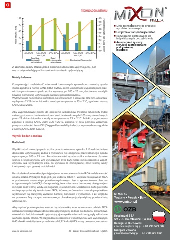 TECHNOLOGIA BETONUwww.cpi-worldwide.com%u0009 ZBI %u2013 Zak%u0142ady Betonowe International %u2013 5 | 2025Metody badawczeKonsystencj%u0119 i urabialno%u015b%u0107 mieszanek betonowych sprawdzono metod%u0105 opadu sto%u017cka zgodnie z norm%u0105 SANS 5862-1:2006. Je%u017celi urabialno%u015b%u0107 wypada%u0142a poza przewidzianym zakresem opadu sto%u017cka wynosz%u0105cym 100 %u00b1 25 mm, dodawano zmodyfikowan%u0105 domieszk%u0119 up%u0142ynniaj%u0105c%u0105 na bazie polikarboksylanu.Wytrzyma%u0142o%u015b%u0107 na %u015bciskanie okre%u015blono na sze%u015bcianach o kraw%u0119dzi 100 mm, utwardzanych przez 7 i 28 dni w zbiorniku z wod%u0105 w temperaturze 23 %u00b1 2 %u00b0C, zgodnie z norm%u0105 SANS 5863:2006.Aby wyprodukowa%u0107 pr%u00f3bki do okre%u015blenia wska%u017anik%u00f3w trwa%u0142o%u015bci (Durability Index values), pobrano rdzenie wiertnicze z sze%u015bcian%u00f3w o kraw%u0119dzi 100 mm, utwardzanych przez 28 dni w zbiorniku z wod%u0105 w temperaturze 23 %u00b1 2 %u00b0C. Pr%u00f3bki przygotowano zgodnie z norm%u0105 SANS 3001-CO3-1:2015. Badania w celu pomiaru wska%u017anika przepuszczalno%u015bci tlenu OPI (Oxygen Permeability Index) przeprowadzono zgodnie z norm%u0105 SANS 3001-CO3-2.Wyniki bada%u0144 i analizaUrabialno%u015b%u0107Wyniki bada%u0144 metod%u0105 opadu sto%u017cka przedstawiono na rysunku 2. Przed dodaniem domieszki up%u0142ynniaj%u0105cej %u017cadna z mieszanek nie osi%u0105gn%u0119%u0142a przewidzianego opadu wynosz%u0105cego 100 %u00b1 25 mm. Ponadto warto%u015bci opadu sto%u017cka zmierzone dla mieszanek o wsp%u00f3%u0142czynniku w/z wynosz%u0105cym 0,45 by%u0142y ni%u017csze ni%u017c mieszanek o wsp%u00f3%u0142czynniku w/z wynosz%u0105cym 0,60, co wynika%u0142o ze zmniejszonej ilo%u015bci wolnej wody i zwi%u0105zanej z tym gorszej urabialno%u015bci.Bez dodatku domieszki up%u0142ynniaj%u0105cej wraz ze wzrostem udzia%u0142u fRCA mala%u0142a warto%u015b%u0107 opadu sto%u017cka. Przyczyn%u0105 tego jest, jak wida%u0107 w tabeli 1, wi%u0119ksza nasi%u0105kliwo%u015b%u0107 fRCA w por%u00f3wnaniu z naturalnym piaskiem wydmowym. Jest to spowodowane obecno%u015bci%u0105 porowatych faz HCP, kt%u00f3re sprawiaj%u0105, %u017ce w mieszance betonowej dost%u0119pna jest mniejsza ilo%u015b%u0107 wolnej wody, co pogarsza jej urabialno%u015b%u0107. Dodatkowo do tego efektu mo%u017ce przyczynia%u0107 si%u0119 kszta%u0142t ziaren fRCA, kt%u00f3re w por%u00f3wnaniu z naturalnym piaskiem wydmowym s%u0105 zazwyczaj wyra%u017anie bardziej kanciaste i wyd%u0142u%u017cone, a ze wzgl%u0119du na porowate fazy zaczynu cementowego charakteryzuj%u0105 si%u0119 wi%u0119ksz%u0105 powierzchni%u0105 w%u0142a%u015bciw%u0105 [3].Aby uzyska%u0107 por%u00f3wnywalne warto%u015bci opadu sto%u017cka, wraz ze wzrostem udzia%u0142u fRCA nale%u017ca%u0142o zwi%u0119kszy%u0107 dawk%u0119 domieszki up%u0142ynniaj%u0105cej. Jednak po dodaniu stosunkowo niewielkich ilo%u015bci domieszki up%u0142ynniaj%u0105cej wszystkie mieszanki osi%u0105gn%u0119%u0142y zak%u0142adane warto%u015bci opadu sto%u017cka. W przypadku mieszanek o wsp%u00f3%u0142czynniku w/c wynosz%u0105cym 0,45 dawki mie%u015bci%u0142y si%u0119 w przedziale od 0,31% do 0,87% masy cementu, natomiast Opad sto%u017cka (mm) Dawka domieszki up%u0142ynniaj%u0105cej (%)Opad bezdomieszkiup%u0142ynniaj%u0105cejw/c 0,45 w/c 0,60Opadz domieszk%u0105up%u0142ynniaj%u0105c%u0105Domieszka (% cementu)2. Warto%u015bci opadu sto%u017cka (przed dodaniem domieszki up%u0142ynniaj%u0105cej i po) wraz z odpowiadaj%u0105cymi im dawkami domieszki up%u0142ynniaj%u0105cej.