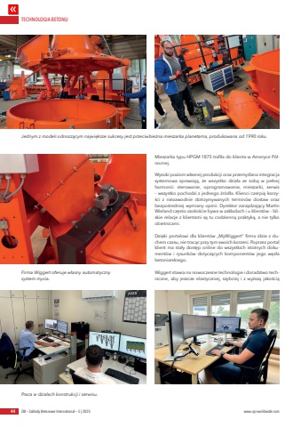 TECHNOLOGIA BETONU44 ZBI %u2013 Zak%u0142ady Betonowe International %u2013 5 | 2025 www.cpi-worldwide.comJednym z modeli odnosz%u0105cym najwi%u0119ksze sukcesy jest przeciwbie%u017cna mieszarka planetarna, produkowana od 1990 roku.Firma Wiggert oferuje w%u0142asny automatyczny system mycia.Praca w dzia%u0142ach konstrukcji i serwisu.Mieszarka typu HPGM 1875 trafi%u0142a do klienta w Ameryce P%u00f3%u0142nocnej.Wysoki poziom w%u0142asnej produkcji oraz przemy%u015blana integracja systemowa sprawiaj%u0105, %u017ce wszystko dzia%u0142a ze sob%u0105 w pe%u0142nej harmonii: sterowanie, oprogramowanie, mieszarki, serwis %u2013 wszystko pochodzi z jednego %u017ar%u00f3d%u0142a. Klienci czerpi%u0105 korzy%u015bci z niezawodnie dotrzymywanych termin%u00f3w dostaw oraz bezpo%u015bredniej wymiany opinii. Dyrektor zarz%u0105dzaj%u0105cy Martin Wieland cz%u0119sto osobi%u015bcie bywa w zak%u0142adach i u klient%u00f3w %u2013 bliskie relacje z klientami s%u0105 tu codzienn%u0105 praktyk%u0105, a nie tylko obietnicami.Dzi%u0119ki portalowi dla klient%u00f3w %u201eMyWiggert%u201d firma idzie z duchem czasu, nie trac%u0105c przy tym swoich korzeni. Poprzez portal klient ma sta%u0142y dost%u0119p online do wszystkich istotnych dokument%u00f3w i rysunk%u00f3w dotycz%u0105cych komponent%u00f3w jego w%u0119z%u0142a betoniarskiego.Wiggert stawia na nowoczesne technologie i doradztwo techniczne, aby jeszcze elastyczniej, szybciej i z wy%u017csz%u0105 jako%u015bci%u0105