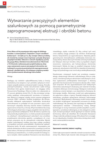 50 ZBI %u2013 Zak%u0142ady Betonowe International %u2013 5 | 2025 www.cpi-worldwide.comFirma Wasa od lat przywi%u0105zuje du%u017c%u0105 wag%u0119 do bliskiego kontaktu z uniwersytetami, instytutami i innymi o%u015brodkami badawczymi %u2013 nie tylko po to, aby rozwija%u0107 w%u0142asne produkty, ale r%u00f3wnie%u017c by czerpa%u0107 nowe inspiracje i pomys%u0142y dotycz%u0105ce przysz%u0142ych trend%u00f3w. Obecnie w ramach wsp%u00f3%u0142pracy pomi%u0119dzy grup%u0105 Wasa, Steinbeis-Innovationszentrum FiberCrete a TU Chemnitz realizowany jest projekt badawczy dotycz%u0105cy wytwarzania wysoce precyzyjnych element%u00f3w szalunkowych za pomoc%u0105 parametrycznie zaprogramowanej ekstruzji i obr%u00f3bki betonu. W niniejszym artykule przedstawiono podsumowanie aktualnego stanu bada%u0144.Wst%u0119pNasilaj%u0105cy si%u0119 niedob%u00f3r wykwalifikowanej kadry w bran%u017cy budowlanej oraz zwi%u0105zana z tym potrzeba cyfryzacji to tera%u017aniejsze i przysz%u0142e zadania w obszarze bada%u0144 i rozwoju. Ponadto przemys%u0142 budowlany i bran%u017ca nieruchomo%u015bci nadal emituj%u0105 rekordowe ilo%u015bci gaz%u00f3w cieplarnianych, nie osi%u0105gaj%u0105c cel%u00f3w Porozumienia Paryskiego. Obecnie sektor ten odpowiada za 37 procent globalnej emisji CO2 [1]. Aby zmniejszy%u0107 emisje, nale%u017cy zwi%u0119kszy%u0107 zr%u00f3wnowa%u017cono%u015b%u0107 proces%u00f3w w budownictwie. Mo%u017cna to osi%u0105gn%u0105%u0107 mi%u0119dzy innymi poprzez zast%u0105pienie cementu CEM I spoiwem bardziej przyjaznym dla klimatu. Ponadto efektywne wykorzystanie materia%u0142%u00f3w, konstrukcje ukierunkowane na przep%u0142yw si%u0142 oraz ponowne u%u017cycie przetworzonych odpad%u00f3w stanowi%u0105 r%u00f3wnie%u017c istotne mo%u017cliwo%u015bci ograniczenia emisji CO2 w bran%u017cy. W tym kontek%u015bcie kluczow%u0105 technologi%u0105 budownictwa mog%u0105 w przysz%u0142o%u015bci sta%u0107 si%u0119 technologie przyrostowe (addytywne). Druk 3D betonu wyr%u00f3%u017cnia si%u0119 du%u017c%u0105 swobod%u0105 projektowania, co z kolei pozwala zaoszcz%u0119dzi%u0107 na unikalnych i skomplikowanych szalunkach oraz umo%u017cliwia projektowanie element%u00f3w zgodnie z przep%u0142ywem si%u0142, a tym samym przyczynia si%u0119 do oszcz%u0119dno%u015bci materia%u0142%u00f3w. Wysoki stopie%u0144 automatyzacji mo%u017cliwy przy tego rodzaju produkcji w przysz%u0142o%u015bci pomo%u017ce przeciwdzia%u0142a%u0107 niedoborowi wykwalifikowanej kadry. W wielu zastosowaniach niepo%u017c%u0105dana jest jednak warstwowa struktura powierzchni powstaj%u0105ca podczas druku betonu. W obecnym stanie bada%u0144 drukowany beton jest frezowany po stwardnieniu, co z kolei prowadzi do du%u017cego zu%u017cycia narz%u0119dzi, niskich pr%u0119dko%u015bci frezowania oraz stosunkowo niewielkiego ubytku materia%u0142u [2]. Aby unikn%u0105%u0107 tych wad, coraz wi%u0119ksz%u0105 uwag%u0119 po%u015bwi%u0119ca si%u0119 obr%u00f3bce drukowanego betonu bezpo%u015brednio po wyprodukowaniu. Wysokiej jako%u015bci geometrycznie skomplikowane prefabrykaty betonowe stanowi%u0105 istotny obszar obecnych trend%u00f3w w bran%u017cy budowlanej [3]. Kolejnym obecnym trendem, kt%u00f3ry w przysz%u0142o%u015bci ulegnie znacznemu rozszerzeniu, jest funkcjonalizacja element%u00f3w betonowych. Nale%u017cy do tego na przyk%u0142ad integracja funkcji grzewczej, wbudowanie diod LED do o%u015bwietlenia bezpo%u015bredniego lub po%u015bredniego oraz inne funkcje zelektryfikowane [4].Przedmiotem niniejszych bada%u0144 jest produkcja nowatorskiego, elastycznego elementu szalunkowego, kt%u00f3ry w po%u0142%u0105czeniu z konwencjonalnymi elementami szalunkowymi umo%u017cliwia wytwarzanie prefabrykat%u00f3w betonowych o z%u0142o%u017conej geometrii bez konieczno%u015bci formowania skos%u00f3w albo z lokalnymi wci%u0119ciami. W celu wyprodukowania tych elastycznych element%u00f3w szalunkowych drukowany jest materia%u0142 mineralny o kszta%u0142cie zbli%u017conym do ko%u0144cowego. Nast%u0119pnie materia%u0142 jest obrabiany w stanie %u015bwie%u017cym, a po stwardnieniu frezowany do ko%u0144cowego kszta%u0142tu. Betonowy model jest wykorzystywany do wykonania odlewu z %u017cywicy. Powsta%u0142y elastyczny element szalunkowy umo%u017cliwia wytworzenie elementu betonowego z wci%u0119ciami. Wydrukowany i sfrezowany model mo%u017cna nast%u0119pnie podda%u0107 recyklingowi i wprowadzi%u0107 ponownie do obiegu materia%u0142owego. Na pierwszy plan wysuwaj%u0105 si%u0119 efektywno%u015b%u0107 wykorzystania zasob%u00f3w i zr%u00f3wnowa%u017cony rozw%u00f3j, dlatego technologia ta ma by%u0107 stosowana przede wszystkim w prototypowaniu i produkcji ma%u0142oseryjnej, w celu zast%u0105pienia ustalonych, konwencjonalnych metod zgodnych ze stanem wiedzy technicznej, takich jak szkodliwe dla %u015brodowiska frezowanie z litego materia%u0142u polistyrenowego. W budowie form, ze wzgl%u0119du na indywidualny charakter element%u00f3w, istniej%u0105 du%u017ce mo%u017cliwo%u015bci zaoszcz%u0119dzenia zasob%u00f3w.Materia%u0142 i metodyOpracowanie materia%u0142u, badania i recyklingCelem by%u0142o opracowanie materia%u0142u na bazie surowc%u00f3w o niskiej emisji CO2. Wa%u017cna by%u0142a r%u00f3wnie%u017c niska abrazyjno%u015b%u0107 materia%u0142u, Wytwarzanie precyzyjnych element%u00f3w szalunkowych za pomoc%u0105 parametrycznie zaprogramowanej ekstruzji i obr%u00f3bki betonuWasa AG, 64293 Darmstadt, Niemcyn Dr Arno Schimpf, Wasa AG, Niemcy%u0009 Mgr in%u017c. Marvin Absto%u00df, In%u017c. Henrik Funke, Steinbeis-Innovationszentrum FiberCrete, Niemcy%u0009 Prof. dr hab. in%u017c. Sandra Gelbrich,TU Chemnitz, Niemcy