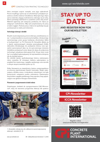 www.cpi-worldwide.com%u0009 ZBI %u2013 Zak%u0142ady Betonowe International %u2013 5 | 2025kt%u00f3ra zmniejsza zu%u017cycie narz%u0119dzi, oraz jego op%u0142acalno%u015b%u0107. Proces recyklingu opiera si%u0119 na turbulentnym przep%u0142ywie powietrza w strefie mielenia TurboRotora. Wewn%u0105trz tego m%u0142yna ziarna materia%u0142u ulegaj%u0105 rozdrobnieniu zderzaj%u0105c si%u0119 ze sob%u0105. Ziarna pozostaj%u0105 zawieszone w powietrzu przez ca%u0142y proces. Materia%u0142 wyj%u015bciowy jest zazwyczaj podawany do m%u0142yna po wst%u0119pnym rozdrobnieniu. M%u0142yn jest przystosowany do pracy w trybie ci%u0105g%u0142ym. Podczas pracy z m%u0142yna nie wydostaje si%u0119 py%u0142, poniewa%u017c jest on stale pod ci%u015bnieniem. Technologia ekstruzji i obr%u00f3bkiW pe%u0142ni zautomatyzowany proces ekstruzji, przedstawiony na rys. 1, przeprowadzono za pomoc%u0105 kompleksu robotycznego opracowanego przez grup%u0119 badawcz%u0105 %u201eKonstrukcje lekkie w budownictwie%u201d na TU Chemnitz [5]. Kompleks sk%u0142ada si%u0119 z dw%u00f3ch sze%u015bcioosiowych robot%u00f3w przemys%u0142owych KUKA, ekstrudera %u015blimakowego do podawania betonu oraz specjalnie opracowanych dysz, np. do wymuszonego mieszania dodatk%u00f3w podawanych przez dysz%u0119 lub dyszy do po%u0142%u0105czonej technologii natryskowo-ekstruzyjnej [5,6]. Drugi robot mo%u017ce by%u0107 na przyk%u0142ad wykorzystywany do wprowadzania zbrojenia lub do obr%u00f3bki betonu.Do obr%u00f3bki %u015bwie%u017co wydrukowanego betonu zastosowano r%u00f3%u017cne narz%u0119dzia. W niniejszym badaniu wykorzystano na przyk%u0142ad frez trzpieniowy z w%u0119glika spiekanego oraz szczotki o r%u00f3%u017cnym stopniu twardo%u015bci (patrz rys. 2).Pr%u00f3by frezowania po stwardnieniu betonu przeprowadzono za pomoc%u0105 pi%u0119cioosiowej frezarki bramowej. Dzi%u0119ki zastosowaniu silnik%u00f3w serwo z enkoderami absolutnymi nie by%u0142o konieczno%u015bci ustawiania punktu odniesienia. Zastosowano frezy kuliste z w%u0119glika spiekanego, frezy zgrubne, frezy wyka%u0144czaj%u0105ce oraz g%u0142owice frezuj%u0105ce diamentowe.Planowanie i programowanie %u015bcie%u017cek robotaGrasshopper, dodatek do oprogramowania CAD Rhinoceros%u00ae, s%u0142u%u017cy do tworzenia program%u00f3w ekstruzji dla systemu 1. Kompleks robotyczny do ca%u0142kowicie zautomatyzowanej ekstruzji i obr%u00f3bki [2, 3].www.cpi-worldwide.comRegister online: www.cpi-worldwide.com/registrationCPi-NewsletterICCX-NewsletterRegisternowCONCRETE PLANTINTERNATIONALTRADE JOURNALS FOR THE CONCRETE INDUSTRYSTAY UP TO DATEAND REGISTER NOW FOR OUR NEWSLETTER!