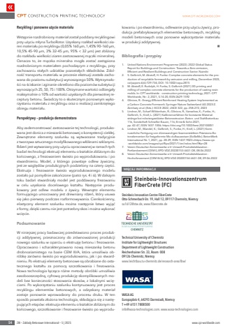 54 ZBI %u2013 Zak%u0142ady Betonowe International %u2013 5 | 2025 www.cpi-worldwide.comRecykling i ponowne u%u017cycie materia%u0142uWst%u0119pnie rozdrobniony materia%u0142 zosta%u0142 poddany recyklingowi przy u%u017cyciu m%u0142yna TurboRotor. Uzyskany rozk%u0142ad wielko%u015bci ziaren materia%u0142u po recyklingu (0,05% 160 %u00b5m, 1,45% 90%u2013160 %u00b5m, 10,5% 45%u201390 %u00b5m, 3% 32%u201345 %u00b5m, 95% < 32 %u00b5m) jest zbli%u017cony do rozk%u0142adu wielko%u015bci ziaren zastosowanej m%u0105czki mineralnej. Oznacza to, %u017ce m%u0105czka mineralna mog%u0142a zosta%u0107 zast%u0105piona rozdrobnionym materia%u0142em pochodz%u0105cym z recyklingu, przy zachowaniu sta%u0142ych udzia%u0142%u00f3w pozosta%u0142ych sk%u0142adnik%u00f3w. Zdolno%u015b%u0107 transportu materia%u0142u w procesie ekstruzji zosta%u0142a zachowana do poziomu substytucji wynosz%u0105cego 50%. Wytrzyma%u0142o%u015bci na %u015bciskanie i zginanie okre%u015blono dla poziom%u00f3w substytucji wynosz%u0105cych 25, 50, 75 i 100%. Otrzymane warto%u015bci odbiega%u0142y maksymalnie o 10% od warto%u015bci uzyskanych dla pierwotnej receptury betonu. %u015awiadczy to o skutecznym ponownym wykorzystaniu materia%u0142u z recyklingu oraz o realizacji zamkni%u0119tego obiegu materia%u0142u.Perspektywy %u2013 produkcja demonstratoraAby zademonstrowa%u0107 zastosowanie tej technologii, produkowana jest donica z mieszanki betonowej o konsystencji ciek%u0142ej. Zewn%u0119trzne elementy szalunku s%u0105 wytwarzane tradycyjnie z tworzywa sztucznego modyfikowanego w%u0142%u00f3knami szklanymi. Rdze%u0144 jest wytwarzany przy u%u017cyciu opracowanej w ramach tych bada%u0144 technologii ekstruzji elementu o kszta%u0142cie zbli%u017conym do ko%u0144cowego, z frezowaniem %u015bwie%u017co po wyprodukowaniu i po stwardnieniu. Model, z kt%u00f3rego powstaje odlew %u017cywiczny, jest ze wzgl%u0119d%u00f3w produkcyjnych podzielony na cztery cz%u0119%u015bci. Ekstruzja i frezowanie %u015bwie%u017co wyprodukowanego modelu zosta%u0142o ju%u017c pomy%u015blnie zako%u0144czone (patrz rys. 4 i 6). W dalszym toku bada%u0144 stwardnia%u0142y model jest poddawany frezowaniu w celu uzyskania docelowego kszta%u0142tu. Nast%u0119pnie produkowany jest odlew modelu z %u017cywicy. Wewn%u0105trz elementu formuj%u0105cego umocowany jest drewniany rdze%u0144, kt%u00f3ry usuwa si%u0119 jako pierwszy podczas rozformowywania. Cienko%u015bcienny, elastyczny element szalunku mo%u017cna nast%u0119pnie %u0142atwo wyj%u0105%u0107 z formy, dzi%u0119ki czemu nie jest potrzebny skos i mo%u017cna wykona%u0107 wci%u0119cie.PodsumowanieW niniejszej pracy badawczej przedstawiono proces produkcji addytywnej, przeznaczony do zr%u00f3wnowa%u017conej produkcji nowego szalunku w oparciu o ekstruzj%u0119 betonu i frezowanie. Opracowano i scharakteryzowano now%u0105 mieszank%u0119 betonu drobnoziarnistego na bazie CEM III/A, kt%u00f3ra umo%u017cliwia obr%u00f3bk%u0119 zar%u00f3wno %u015bwie%u017co po wyprodukowaniu, jak i po stwardnieniu. Po ekstruzji elementy betonowe s%u0105 obrabiane do ostatecznego kszta%u0142tu za pomoc%u0105 szczotkowania i frezowania. Nowa technologia %u0142%u0105cz%u0105ca r%u00f3%u017cne metody obr%u00f3bki umo%u017cliwia zasobooszcz%u0119dn%u0105, cyfrow%u0105 produkcj%u0119 skomplikowanych modeli bez konieczno%u015bci stosowania skos%u00f3w, z lokalnymi wci%u0119ciami. Po wykorzystaniu szalunku kontynuowany jest proces recyklingu element%u00f3w betonowych, a odzyskany materia%u0142 zostaje ponownie wprowadzony do procesu druku. W ten spos%u00f3b powsta%u0142a z%u0142o%u017cona technologia, sk%u0142adaj%u0105ca si%u0119 z nast%u0119puj%u0105cych etap%u00f3 ekstruzja elementu o kszta%u0142cie zbli%u017conym do ko%u0144cowego, szczotkowanie i frezowanie %u015bwie%u017co po wyprodukowaniu i po stwardnieniu, odlewanie przy u%u017cyciu %u017cywicy, produkcja prefabrykowanych element%u00f3w betonowych, recykling modeli betonowych oraz ponowne wykorzystanie materia%u0142u w produkcji addytywnej.nBibliografia i przypisy1. United Nations Environment Programme (2022). 2022 Global Status Report for Buildings and Construction: Towards a Zero%u2011emission, Efficient and Resilient Buildings and Construction Sector. Nairobi2. S. Gelbrich, M. Absto%u00df, H. Funke: Complex concrete elements for the production of recyclable formwork by extrusion and milling, December 2023, ce/papers 6(6):729-734, DOI: 10.1002/cepa.2815 3. M. Absto%u00df, E. Rudolph, H. Funke, S. Gelbrich (2021) 3D printing and milling of complex concrete elements for the production of casting resin molds. In: CPT worldwide - construction printing technology, 2021. CPT Worldwide, Nr.: 2, 2021, S.14-20, ISSN 2629-15924. Gliniorz, R.: Energy-Efficient Reinforced Heating System Implemented as a Carbon Concrete Formwork. Springer Nature Switzerland AG 2023 Z. Zembaty et al. (Eds.): ECCE 2022, LNCE 322, pp. 258%u2013272, 20235. Lindner, M.; Scharf-Wildenhain, R.; Gliniorz, R.; Vanselow, K.; Funke, H.; Gelbrich, S.; Kroll, L. (2021) Kalibrierverfahren f%u00fcr konstante Materialstr%u00e4nge bei robotergest%u00fctzter Betonextrusion. Beton- und Stahlbetonbau 116, Sonderheft Schneller Bauen, 116, Ernst & Sohn 2021, pp. 42-47, ISSN 1437-1006. https://doi.org/10.1002/best.2021000516. Lindner, M.; Mandel, K.; Gelbrich, S.; Funke, H.; Kroll, L. (2021) Kontinuierliche Fertigung von d%u00fcnnwandigen faserverst%u00e4rkten Pr%u00e4zisions-Betonelementen f%u00fcr freigeformte Mo-dulbauweisen (KoBeMo). BetonWerk International Nr. 1, 2021, pp. 28-29, ISSN 1437-9023.chttps://www.cpi--worldwide.com/images/cpi/flips/2021/1/en/index.html?#p=28 7. Verein Deutscher Zementwerke e.V: Umwelt-Produktdeklaration - Portlandzement (CEM I), EPD-VDZ-20220153-IAG1-DE, 08.06.2022 8. Verein Deutscher Zementwerke e.V: Umwelt-Produktdeklaration - Hochofenzement (CEM III/A), EPD-VDZ-20220154-IAG1-DE, 09.06.2022WI%u0118CEJ INFORMACJISteinbeis Innovation Centre FiberCreteOtto-Schmerbach-Str. 19, Hall 12, 09117 Chemnitz, Niemcysu1612@s