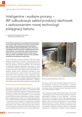 KOSTKA BRUKOWA I DROBNOWYMIAROWE ELEMENTY BETONOWE62 ZBI %u2013 Zak%u0142ady Betonowe International %u2013 5 | 2025 www.cpi-worldwide.comPonad 40 lat do%u015bwiadczenia w produkcji dach%u00f3wek betonowych zosta%u0142o nagle wystawione na pr%u00f3b%u0119 w styczniu 2023 roku, kiedy to na terenie du%u0144skiej firmy I%u00b7B%u00b7F (A/S Ikast Betonvarefabrik) wybuch%u0142 katastrofalny po%u017car. Po%u017car zniszczy%u0142 zak%u0142ad produkcji dach%u00f3wek w siedzibie g%u0142%u00f3wnej firmy w Ikast (Dania), co spowodowa%u0142o nag%u0142e wstrzymanie produkcji. Na szcz%u0119%u015bcie nie by%u0142o powa%u017cnie rannych; jedynie jeden pracownik odni%u00f3s%u0142 lekkie obra%u017cenia. Ale z popio%u0142%u00f3w narodzi%u0142a si%u0119 kompleksowa transformacja.Cz%u0119%u015b%u0107 mechaniczna produkcji dach%u00f3wek w IBF by%u0142a zawsze wynikiem wewn%u0119trznych innowacji. Z wewn%u0119trznego dzia%u0142u produkcji maszyn %u2013 przy wsparciu bogatej wiedzy technicznej w%u0142a%u015bcicieli, Mogensa i Prebena Rosenkilde %u2013 IBF ewoluowa%u0142a w wiod%u0105cego dostawc%u0119 dach%u00f3wek betonowych w Danii i Polsce. Cho%u0107 budynek produkcyjny i maszyny zosta%u0142y nieodwracalnie zniszczone, po%u017car uda%u0142o si%u0119 opanowa%u0107, dzi%u0119ki czemu s%u0105siednie dziewi%u0119%u0107 kom%u00f3r dojrzewania pozosta%u0142o w du%u017cej mierze nienaruszonych. Jeszcze w trakcie prac rozbi%u00f3rkowych kierownictwo firmy rozpocz%u0119%u0142o proces reorganizacji, kt%u00f3ry mia%u0142 na celu pe%u0142n%u0105 modernizacj%u0119 produkcji dach%u00f3wek. Dzi%u0119ki silnemu wsparciu ze strony polskich zak%u0142ad%u00f3w produkcyjnych du%u0144scy klienci nie odczuli skutk%u00f3w przebudowy %u2013 niezawodno%u015b%u0107 dostaw nadal odpowiada%u0142a wysokiemu standardowi IBF.Modernizacja procesu piel%u0119gnacji betonuPostanowiono nie tylko odbudowa%u0107 zak%u0142ad, ale przy okazji wprowadzi%u0107 inteligentniejszy system. Po dok%u0142adnej analizie firma IBF zdecydowa%u0142a si%u0119 przestawi%u0107 istniej%u0105cy system kom%u00f3r dojrzewania z klasycznej konfiguracji Last-In-First-Out (LIFO) na konfiguracj%u0119 First-In-First-Out (FIFO). Ta zmiana oznacza%u0142a znacznie wi%u0119cej ni%u017c tylko zmodyfikowany przep%u0142yw materia%u0142u: By%u0142 to strategiczny krok maj%u0105cy na celu optymalizacj%u0119 wydajno%u015bci produkcji, %u015bledzenia proces%u00f3w i bezpiecze%u0144stwa pracy %u2013 przy jednoczesnym zwi%u0119kszeniu wytrzyma%u0142o%u015bci produkt%u00f3w i jednorodno%u015bci kolor%u00f3w. W starym systemie LIFO dach%u00f3wki wprowadzane jako ostatnie by%u0142y wyjmowane jako pierwsze, co przy przerwach w produkcji lub zmianach kolejno%u015bci partii cz%u0119sto prowadzi%u0142o do nier%u00f3wnomiernych czas%u00f3w dojrzewania. W nowym systemie FIFO dach%u00f3wki trafiaj%u0105 do kom%u00f3r w tej samej kolejno%u015bci, w jakiej s%u0105 z nich wyjmowane %u2013 co gwarantuje r%u00f3wnomierne czasy dojrzewania, upraszcza planowanie i zmniejsza z%u0142o%u017cono%u015b%u0107 obs%u0142ugi. Rezultat: sta%u0142a jako%u015b%u0107 produkt%u00f3w i wy%u017csza wydajno%u015b%u0107 zak%u0142adu.W celu integracji nowego w%u00f3zka transferowego na linii suchej %u2013 kluczowego dla zautomatyzowanego, p%u0142ynnego transportu stwardnia%u0142ych dach%u00f3wek na lini%u0119 paletyzacji %u2013 konieczne by%u0142o skr%u00f3cenie istniej%u0105cych kom%u00f3r. Aby zrekompensowa%u0107 zmniejszon%u0105 w ten spos%u00f3b pojemno%u015b%u0107, firma IBF rozbudowa%u0142a zak%u0142ad o cztery nowe komory dojrzewania. Finalna instalacja sk%u0142ada si%u0119 obecnie z 13 kom%u00f3r dojrzewania w systemie FIFO, z kt%u00f3rych ka%u017cda wyposa%u017cona jest w dwoje izolowanych drzwi. To podw%u00f3jne rozwi%u0105zanie drzwiowe zapewnia maksymaln%u0105 elastyczno%u015b%u0107 w eksploatacji, oddzielne miejsca za%u0142adunku Inteligentne i wydajne procesy %u2013 IBF odbudowuje zak%u0142ad produkcji dach%u00f3wek z zastosowaniem nowej technologii piel%u0119gnacji betonuKraft Curing Systems GmbH, 49699 Lindern, Niemcyn April Kraft, Kraft Curing Systems GmbH, NiemcyLeif Tipsmark, Tipsmark Trading, DaniaKomory przed przebudow%u0105 w 2023 roku.
