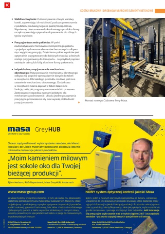 KOSTKA BRUKOWA I DROBNOWYMIAROWE ELEMENTY BETONOWEwww.cpi-worldwide.com%u0009 ZBI %u2013 Zak%u0142ady Betonowe International %u2013 5 | 2025 75%u2022 Stabilne chwytanie: Cuboter pewnie chwyta warstwy kostki, zapewniaj%u0105c ich stabilno%u015b%u0107 podczas przenoszenia z podk%u0142adu produkcyjnego na palet%u0119 transportow%u0105. Wymienne, dostosowane do konkretnego produktu listwy szcz%u0119k zapewniaj%u0105 optymalne dopasowanie do r%u00f3%u017cnych typ%u00f3w wyrob%u00f3w.%u2022 Precyzyjne tworzenie pakiet%u00f3 W pe%u0142ni zautomatyzowane formowanie kompletnego pakietu z pojedynczych warstw element%u00f3w betonowych odbywa si%u0119 z wyj%u0105tkow%u0105 precyzj%u0105. Dzi%u0119ki temu pakiet wyrob%u00f3w jest optymalnie przygotowany do kolejnych etap%u00f3w, w kt%u00f3rych zostaje przygotowany do transportu %u2013 na przyk%u0142ad poprzez owini%u0119cie ta%u015bm%u0105 lub foli%u0105 albo inne formy pakowania.%u2022 Indywidualne pozycjonowanie mechanizmuobrotowego: Pozycjonowanie mechanizmu obrotowego odbywa si%u0119 poprzez wprowadzenie danych do tabeli w recepturze. Dla ka%u017cdego produktu mo%u017cliwe jest inne ustawienie mechanizmu obrotowego. Dodatkowo w recepturze mo%u017cna zapisa%u0107 w tabeli tak%u017ce inne funkcje, takie jak programy centrowania lub przesuwu. Zastosowanie nap%u0119d%u00f3w z pasami z%u0119batymi dla mechanizmu podnoszenia i uk%u0142adu jezdnego zapewnia precyzyjne przenoszenie si%u0142y oraz wysok%u0105 dok%u0142adno%u015b%u0107 pozycjonowania. E Monta%u017c nowego Cubotera firmy Masa.Masa GmbH GreyHUB Andernach Concrete Block, Pavers + Landscaping ProductsMasa-Str. 2 | 56626 Andernach | GermanyANIMIC Marcin Nowakowski ul. Grzybowska 17 lok. 19 26-600 Radom Polska | +48 668 233 800Masa GmbH WhiteHUB Porta Westfalica AAC + Sand-lime BrickOsterkamp 2 | 32457 Porta Westfalica | GermanyW Masa my%u015blimy wy%u0142%u0105cznie o betonie i o tym, jak nada%u0107 mu odpowiedni kszta%u0142t dla potrzeb przemys%u0142u materia%u0142%u00f3w budowlanych. Maszyny, kt%u00f3re projektujemy i produkujemy, s%u0105 wykorzystywane do produkcji pustak%u00f3w, kostki brukowej, galanterii betonowej, bloczk%u00f3w z betonu kom%u00f3rkowego i (zbrojonych) paneli, a tak%u017ce wyrob%u00f3w silikatowych. Innymi s%u0142owy, jeste%u015bmy prawdziwymi specjalistami od betonu z pasj%u0105 do niezawodnych, wysokowydajnych maszyn. Bj%u00f6rn, jeden z naszych sprytnych specjalist%u00f3w od betonu, opracowa%u0142 urz%u0105dzenie do linii produkcyjnych kostki brukowej, kt%u00f3re dostarcza precyzyjnych informacji o jako%u015bci bie%u017c%u0105cej produkcji. Po stronie mokrej system mierzy produkty, identyfi kuje wady, takie jak p%u0119kni%u0119cia, wybrzuszenia lub grudki cementowe, i pomaga zmniejszy%u0107 ilo%u015b%u0107 odpad%u00f3w. Je%u015bli interesuje Ci%u0119 precyzyjne wykrywanie wad w trybie ci%u0105g%u0142ym 24/7 i oszcz%u0119dno%u015b%u0107 zasob%u00f3w %u2013 po prostu zapytaj naszych specjalist%u00f3w od betonu.Chcesz zoptymalizowa%u0107 wykorzystanie zasob%u00f3w, ale kliencikupuj%u0105cy od Ciebie materia%u0142y budowlane akceptuj%u0105 jedynie minimalne tolerancje jako%u015bci produkt%u00f3w.%u201eMoim kamieniem milowym jest sokole oko dla Twojej bie%u017c%u0105cej produkcji%u201d.Bj%u00f6rn Herborn, R%u2009&%u2009D Department, Masa GreyHUB, Andernachwww.masa-group.com NOWY system optycznej kontroli jako%u015bci Masama-0000805