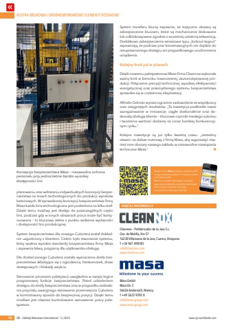 KOSTKA BRUKOWA I DROBNOWYMIAROWE ELEMENTY BETONOWE78 ZBI %u2013 Zak%u0142ady Betonowe International %u2013 5 | 2025 www.cpi-worldwide.complanowaniu oraz wdra%u017caniu indywidualnych koncepcji bezpiecze%u0144stwa na liniach technologicznych do produkcji wyrob%u00f3w betonowych. W sprawdzonej koncepcji bezpiecze%u0144stwa firmy Masa ka%u017cda linia technologiczna jest podzielona na kilka stref. Dzi%u0119ki temu mo%u017cliwy jest dost%u0119p do poszczeg%u00f3lnych cz%u0119%u015bci linii, podczas gdy w innych obszarach praca mo%u017ce by%u0107 kontynuowana %u2013 to kluczowa zaleta z punktu widzenia wydajno%u015bci i dost%u0119pno%u015bci linii produkcyjnej.System bezpiecze%u0144stwa dla nowego Cubotera zosta%u0142 dok%u0142adnie uzgodniony z klientem. Celem by%u0142o stworzenie systemu, kt%u00f3ry spe%u0142nia wysokie standardy bezpiecze%u0144stwa firmy Masa i zapewnia %u0142atw%u0105, przyjazn%u0105 dla u%u017cytkownika obs%u0142ug%u0119.Dla dostarczonego Cubotera zosta%u0142a wyznaczona strefa bezpiecze%u0144stwa sk%u0142adaj%u0105ca si%u0119 z ogrodzenia, fotokom%u00f3rek, drzwi dost%u0119powych i blokady wej%u015bcia.Sterowanie procesem paletyzacji uwzgl%u0119dnia w swojej logice programowej funkcje bezpiecze%u0144stwa. Przed udzieleniem dost%u0119pu do strefy bezpiecze%u0144stwa oraz w przypadku zadzia%u0142ania przycisku awaryjnego sterowanie przemieszcza Cubotera w kontrolowany spos%u00f3b do bezpiecznej pozycji. Dzi%u0119ki temu mo%u017cliwe jest r%u00f3wnie%u017c kontrolowane wznowienie pracy paletyzatora.System transferu kluczy zapewnia, %u017ce krytyczne obszary s%u0105 zabezpieczone kluczami, kt%u00f3re s%u0105 mechanicznie blokowane lub odblokowywane zgodnie z wcze%u015bniej ustalon%u0105 sekwencj%u0105. Dodatkowo zabezpieczenia serwisowe typu %u201elockout-tagout%u201d zapewniaj%u0105, %u017ce podczas prac konserwacyjnych nie dojdzie do nieuprawnionego dost%u0119pu ani przypadkowego uruchomienia urz%u0105dzenia. Kolejny krok ju%u017c w planachDzi%u0119ki nowemu paletyzatorowi Masa firma Cleannox wykona%u0142a wa%u017cny krok w kierunku nowoczesnej, zautomatyzowanej produkcji. Po%u0142%u0105czenie precyzji technicznej, wysokiej efektywno%u015bci energetycznej oraz przemy%u015blanego systemu bezpiecze%u0144stwa sprawdza si%u0119 w codziennej eksploatacji.Alfredo Cebri%u00e1n wyra%u017ca ogromne zadowolenie ze wsp%u00f3%u0142pracy oraz osi%u0105gni%u0119tych rezultat%u00f3 %u201eTa inwestycja podkre%u015bla nasze zaanga%u017cowanie w innowacje, ci%u0105g%u0142e doskonalenie oraz doskona%u0142%u0105 obs%u0142ug%u0119 klienta %u2014 kluczowe czynniki trwa%u0142ego sukcesu i tworzenia warto%u015bci dodanej na coraz bardziej konkurencyjnym rynku.%u201dKolejne inwestycje s%u0105 ju%u017c tylko kwesti%u0105 czasu: %u201eJeste%u015bmy otwarci na dalsze rozmowy z firm%u0105 Masa, aby wyposa%u017cy%u0107 r%u00f3wnie%u017c inne obszary naszego zak%u0142adu w niezawodne rozwi%u0105zania techniczne Masa.%u201d nWI%u0118CEJ INFORMACJICleannox %u2013 Prefabricados de La Jara S.L.Ctra. de Motilla, Km 57 16230 Villanueva de la Jara, Cuenca, HiszpaniaT +34 967 498185info@cleannox.comwww.cleannox.comMasa GmbHMasa-Str. 256626 Andernach, NiemcyT +49 2632 9292 0info@masa-group.comwww.masa-group.comKoncepcja bezpiecze%u0144stwa Masa %u2013 niezawodna ochrona personelu przy jednocze%u015bnie bardzo wysokiej dost%u0119pno%u015bci linii.Dzi%u0119ki firmie Masa wszyscy czytelnicy ZBI mog%u0105 bezp%u0142atnie pobra%u0107 niniejszy artyku%u0142 w formacie pdf. Mo%u017cna to zrobi%u0107 wchodz%u0105c na stron%u0119www.cpi-worldwide.com/channels/masa kt%u00f3r%u0105 mo%u017cna r%u00f3wnie%u017c otworzy%u0107 w smartfonie skanuj%u0105c kod QR.