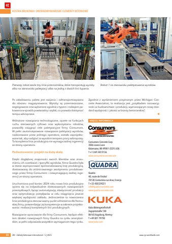 KOSTKA BRUKOWA I DROBNOWYMIAROWE ELEMENTY BETONOWE84 ZBI %u2013 Zak%u0142ady Betonowe International %u2013 5 | 2025 www.cpi-worldwide.comPo za%u0142adowaniu paleta jest owijania i odtransportowywana do obszaru magazynowania. Wyroby s%u0105 przemieszczane, segregowane oraz wybierane zgodnie z typem i rodzajem pakowania w spos%u00f3b powtarzalny i szybki, co pozwala dotrzyma%u0107 tempa wibroprasie.Wdro%u017cone rozwi%u0105zania technologiczne, oparte na funkcjach ruchu sterowanych cyfrowo oraz wykorzystaniu robot%u00f3w, pozwoli%u0142y osi%u0105gn%u0105%u0107 cele paletyzacyjne firmy Consumers. W pe%u0142ni zautomatyzowane rozwi%u0105zanie paletyzacji wyrob%u00f3w, nadzorowane przez jednego operatora, zosta%u0142o zaprojektowane tak, aby nad%u0105%u017ca%u0107 za wysokim tempem pracy wibroprasy. Ta kompletna linia produkcyjna nie wymaga %u017cadnej ingerencji ze strony operatora.Podsumowanie: projekt na du%u017c%u0105 skal%u0119Dzi%u0119ki dog%u0142%u0119bnej znajomo%u015bci swoich klient%u00f3w oraz zrozumieniu ich oczekiwa%u0144 i specyfiki wyrob%u00f3w, firma Quadra by%u0142a w stanie zaproponowa%u0107 spersonalizowan%u0105 lini%u0119 produkcyjn%u0105, dostosowan%u0105 do zr%u00f3%u017cnicowanego asortymentu produkowanego przez firm%u0119 Consumers i niewymagaj%u0105c%u0105 %u017cadnej ingerencji ze strony operatora.Uruchomiona pod koniec 2024 roku nowa linia produkcyjna opiera si%u0119 na indywidualnie dostosowanych rozwi%u0105zaniach przemys%u0142owych, %u0142%u0105cz%u0105c automatyzacj%u0119, elastyczno%u015b%u0107 produkcji oraz optymalizacj%u0119 przep%u0142yw%u00f3w w celu osi%u0105gni%u0119cia jeszcze wi%u0119kszej wydajno%u015bci zak%u0142adu. Jednocze%u015bnie ta nowoczesna linia produkcyjna stanowi wa%u017cny punkt odniesienia dla francuskiej firmy, potwierdzaj%u0105c jej kompetencje w zakresie projektowania i realizacji kompletnych linii produkcyjnych.Rozwi%u0105zanie opracowane dla firmy Consumers, b%u0119d%u0105ce efektem dzia%u0142a%u0144 rozwojowych firmy Quadra na rynku ameryka%u0144skim, w pe%u0142ni odpowiada wszystkim wymaganiom tego rynku.Zgodnie z wyr%u00f3%u017cnieniem przyznanym przez Michigan Concrete Association, ta realizacja jest %u201eprzyk%u0142adem innowacyjno%u015bci w budownictwie i produkcji, wyznaczaj%u0105cym nowy standard wydajno%u015bci i jako%u015bci w bran%u017cy betoniarskiej%u201d.nWI%u0118CEJ INFORMACJIConsumers Concrete Corp3506 Lovers LaneKalamazoo, MI 49001-2229, USAT +1 269 342 0136www.consumersconcrete.comQuadra40, route de Findrol74130 Contamine-sur-Arve, FrancjaT +33 450339221info@quadra-concrete.comwww.quadra-concrete.comKuka AktiengesellschaftZugspitzstra%u00dfe 14086165 Augsburg, NiemcyT +49 821 79750www.kuka.comPierwszy robot zasila trzy linie przeno%u015bnik%u00f3w, kt%u00f3re transportuj%u0105 wyroby albo na stanowisko paletyzacji albo na jedn%u0105 z dw%u00f3ch linii %u0142upania.Robot 1 na stanowisku paletyzowania wyrob%u00f3w.
