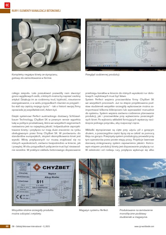 RURY I ELEMENTY KANALIZACJI BETONOWEJ88 ZBI %u2013 Zak%u0142ady Betonowe International %u2013 5 | 2025 www.cpi-worldwide.comca%u0142ego zespo%u0142u. Lata poszukiwa%u0144 pozwoli%u0142y nam stworzy%u0107 grono wyj%u0105tkowych os%u00f3b, o kt%u00f3rych mo%u017cna by napisa%u0107 osobny artyku%u0142. Dzi%u0119kuj%u0119 im za codzienny trud, lojalno%u015b%u0107, nieustanne zaanga%u017cowanie, a w wielu przypadkach r%u00f3wnie%u017c za przyja%u017a%u0144 %u2013 bo stali si%u0119 cz%u0119%u015bci%u0105 mojego %u017cycia.%u201c %u2013 tak o historii swojej firmy opowiada jej wsp%u00f3%u0142w%u0142a%u015bciciel, Adam %u0141y%u015b.Dzi%u0119ki systemowi Perfect austriackiego dostawcy Schl%u00fcsselbauer Technology, Chy%u017ebet SK w pewnym sensie wype%u0142nia luk%u0119 w polityce produktowej, kt%u00f3ra we wszystkich segmentach nastawiona jest na najwy%u017csz%u0105 jako%u015b%u0107. Indywidualnie zaprojektowane kinety i przy%u0142%u0105cza rur maj%u0105 du%u017ce znaczenie na rynku obs%u0142ugiwanym przez firm%u0119 Chy%u017ebet SK. W por%u00f3wnaniu do standard%u00f3w europejskich, stopie%u0144 skomplikowania kinet jest wysoki. Wloty przy%u0142%u0105czanych rur musz%u0105 znajdowa%u0107 si%u0119 na r%u00f3%u017cnych wysoko%u015bciach, zar%u00f3wno bezpo%u015brednio w kinecie, jak i powy%u017cej. W obu przypadkach po%u0142%u0105czenie musi by%u0107 niezawodnie szczelne. W praktyce zak%u0142adu betonowego dopasowanie przebiegu kana%u0142%u00f3w w kinecie do r%u00f3%u017cnych wysoko%u015bci rur dolotowych i wylotowych musi by%u0107 %u0142atwe.System Perfect wspiera pracownik%u00f3w firmy Chy%u017ebet SK we wszystkich procesach. Ju%u017c na etapie projektowania podstaw studzienek wszystkie szczeg%u00f3%u0142y wykonawcze mo%u017cna zaimportowa%u0107 kilkoma klikni%u0119ciami lub wprowadzi%u0107 manualnie do systemu. System wspiera zar%u00f3wno codzienne planowanie produkcji, jak i pracownik%u00f3w przy wytwarzaniu poszczeg%u00f3lnych kinet. Po wybraniu wk%u0142adek formuj%u0105cych wystarczy naci%u015bni%u0119cie jednego przycisku, aby rozpocz%u0105%u0107 ci%u0119cie.Wk%u0142adki styropianowe s%u0105 ci%u0119te przy u%u017cyciu pi%u0142 z gor%u0105cym drutem, a poszczeg%u00f3lne cz%u0119%u015bci %u0142%u0105czy si%u0119 w ca%u0142o%u015b%u0107 za pomoc%u0105 kleju na gor%u0105co. Przejrzysty system produkcyjny prowadzi przy tym operator%u00f3w przez proste etapy pracy. Projekcje laserowe stanowi%u0105 zintegrowany system zapewnienia jako%u015bci. Ko%u0144cowym etapem produkcji kinety jest dopasowanie przy%u0142%u0105czy rur. W zale%u017cno%u015bci od rodzaju rury, przy%u0142%u0105cza wykonuje si%u0119 albo Kompletny negatyw kinety ze styropianu, gotowy do zamontowania w formie.Przegl%u0105d codziennej produkcji.Wszystkie istotne szczeg%u00f3%u0142y produktu mo%u017cna odczyta%u0107 z etykiety.Produkowane na zam%u00f3wienie monolityczne podstawy studzienek w magazynie.Magazyn systemu Perfect.%u00a9 Chy%u017ebet SK %u00a9 Chy%u017ebet SK