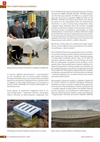 RURY I ELEMENTY KANALIZACJI BETONOWEJ90 ZBI %u2013 Zak%u0142ady Betonowe International %u2013 5 | 2025 www.cpi-worldwide.comza pomoc%u0105 wk%u0142adek styropianowych z zamontowanymi na nich uszczelkami, albo za pomoc%u0105 przej%u015b%u0107 szczelnych. W czystym %u015brodowisku pracy, przy prostych etapach produkcji, wytwarza si%u0119 do dziesi%u0119ciu negatyw%u00f3w kinet na godzin%u0119, kt%u00f3re ze wzgl%u0119du na nisk%u0105 wag%u0119 transportowane s%u0105 manualnie za pomoc%u0105 w%u00f3zka koszowego do maszyny wytwarzaj%u0105cej studzienki betonowe.Formy stalowe s%u0105 uzupe%u0142niane negatywami kinet w r%u00f3%u017cnych konfiguracjach i wype%u0142niane betonem samozag%u0119szczalnym. Elementy s%u0105 rozformowywane nast%u0119pnego dnia. Firma Chy%u017ebet SK produkuje studzienki betonowe o %u015brednicy wewn%u0119trznej DN800, DN1000, DN1200 i DN1500. Najwi%u0119ksze elementy maj%u0105 wysoko%u015b%u0107 do 2000 mm, a grubo%u015b%u0107 %u015bcian waha si%u0119 od 90 mm w przypadku DN800 do 330 mm dla DN1200 i DN1500. Przy du%u017cych grubo%u015bciach %u015bcian stosuje si%u0119 wyci%u0119cia w celu optymalizacji masy. Do manipulowania elementami na placu budowy s%u0142u%u017c%u0105 zintegrowane kotwy z g%u0142%u00f3wk%u0105 kulow%u0105. Wszystkie istotne dla monta%u017cu szczeg%u00f3%u0142y produktu s%u0105 widoczne na etykiecie umieszczonej po zewn%u0119trznej stronie studni. Po wieloletnim wprowadzaniu na rynek indywidualnych monolitycznych podstaw studzienek zarz%u0105d firmy Chy%u017ebet SK cieszy si%u0119, %u017ce dzi%u0119ki systemowi produkcji Perfect firma jest gotowa na kolejny krok rozwojowy zar%u00f3wno pod wzgl%u0119dem ilo%u015bciowym, jak i jako%u015bciowym oraz mo%u017ce wzmocni%u0107 swoj%u0105 pozycj%u0119 na obu rynkach %u2013 polskim i s%u0142owackim.Monika %u0141y%u015b: %u201eTurany sta%u0142y si%u0119 w mi%u0119dzyczasie naszym drugim domem. A teraz zak%u0142ad ze swoim wyposa%u017ceniem jest dos%u0142ownie perfekcyjny %u2013 %u201eNow it%u2019s perfect%u201d.Firma Chy%u017ebet SK starannie przygotowa%u0142a si%u0119 do uruchomienia nowej technologii produkcji. Zesp%u00f3%u0142 pod kierownictwem pani Karoliny %u0141y%u015b, c%u00f3rki Adama i Moniki, odwiedzi%u0142 jednego z producent%u00f3w studzienek Perfect, kt%u00f3ry ju%u017c od kilku lat pomy%u015blnie wytwarza studzienki w tej technologii, aby przez kilka dni obserwowa%u0107 rzeczywisty proces produkcji i w ten spos%u00f3b skr%u00f3ci%u0107 faz%u0119 wdro%u017ceniow%u0105 w w%u0142asnym zak%u0142adzie. Profesjonalne planowanie i realizacja projektu oraz niezale%u017cny od p%u0142ci podzia%u0142 kompetencji s%u0105 cechami charakterystycznymi dla firmy Chy%u017ebet SK. Obok og%u00f3lnej odpowiedzialno%u015bci za zak%u0142ad produkcyjny, odpowiedzialno%u015b%u0107 za dzia%u0142 produkcji studzienek i realizacj%u0119 wi%u0119kszo%u015bci prac w dziale produkcji kinet Perfect spoczywa w r%u0119kach kobiet.We wszystkich obszarach produkcji w zak%u0142adzie Chy%u017ebet SK w Turanach stawiane s%u0105 wysokie wymagania jako%u015bciowe. Niezale%u017cnie od tego, czy chodzi o kostk%u0119 brukow%u0105, galanteri%u0119 betonow%u0105, elementy prefabrykacji mostowej czy kubaturowej - w ka%u017cdym segmencie wida%u0107 d%u0105%u017cenie do perfekcji. R%u00f3wnie%u017c procesy operacyjne s%u0105 konsekwentnie dostosowywane do tego celu. Obok utrzymania czysto%u015bci w halach produkcyjnych i magazynowych, kluczowe jest przede wszystkim w%u0142a%u015bciwe Zesp%u00f3%u0142 dzia%u0142u produkcji kinet Perfect w zak%u0142adzie Chy%u017ebet SK.Prefabrykaty mostowe Chy%u017ebet po zako%u0144czonym monta%u017cu. P%u0142yty z betonu w jako%u015bci betonu architektonicznego.%u00a9 Chy%u017ebet SK %u00a9 Chy%u017ebet SK