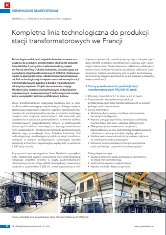 PREFABRYKOWANE ELEMENTY BETONOWE92 ZBI %u2013 Zak%u0142ady Betonowe International %u2013 5 | 2025 www.cpi-worldwide.comTechnologia modu%u0142owa i indywidualnie dopasowane rozwi%u0105zania do produkcji prefabrykat%u00f3w dla klienta Duhalde: firma Moldtech pomy%u015blnie zrealizowa%u0142a du%u017cy projekt we Francji dla firmy Duhalde Industries, specjalizuj%u0105cej si%u0119 w produkcji stacji transformatorowych PAC4UF. Zadanie polega%u0142o na zaprojektowaniu i dostarczeniu zautomatyzowanej linii technologicznej do wytwarzania %u017celbetowych stacji transformatorowych, zgodnej z bardzo rygorystycznymi lokalnymi przepisami. Projekt ten wzmacnia pozycj%u0119 Moldtech jako dostawcy kompleksowych, indywidualnie dopasowanych i zaawansowanych technologicznie rozwi%u0105za%u0144 w europejskim sektorze prefabrykacji betonu.Stacje transformatorowe odgrywaj%u0105 kluczow%u0105 rol%u0119 w infrastrukturze elektroenergetycznej %u015bredniego i niskiego napi%u0119cia, zapewniaj%u0105c bezpieczne, odporne i zgodne z przepisami %u015brodowisko do instalacji transformator%u00f3w, rozdzielnic %u015bredniego napi%u0119cia oraz urz%u0105dze%u0144 pomocniczych. Ich obecno%u015b%u0107 jest powszechna w zak%u0142adach przemys%u0142owych, na terenie dzielnic mieszkaniowych, gospodarstwach rolnych, w elektrowniach s%u0142onecznych i turbinach wiatrowych, co wymaga wszechstronnych, niezawodnych i efektywnych rozwi%u0105za%u0144 konstrukcyjnych. W%u0142a%u015bnie tego poszukiwa%u0142a firma Duhalde Industries: linii technologicznej umo%u017cliwiaj%u0105cej produkcj%u0119 stacji transformatorowych w r%u00f3%u017cnych konfiguracjach, spe%u0142niaj%u0105cej wysokie standardy techniczne i zapewniaj%u0105cej wydajno%u015b%u0107 na poziomie 1 200 stacji rocznie.Aby sprosta%u0107 tym wymaganiom, firma Moldtech zaprojektowa%u0142a i dostarczy%u0142a wysoce nowoczesn%u0105 lini%u0119 technologiczn%u0105, integruj%u0105c wszystkie systemy w ci%u0105g%u0142y, zautomatyzowany i bezpieczny proces. Nowy zak%u0142ad przemys%u0142owy, nowoczesny budynek o powierzchni 5 000 m2, zosta%u0142 wyposa%u017cony w niezb%u0119dne urz%u0105dzenia do produkcji wytrzyma%u0142ych i bezpiecznych stacji SN/NN: modu%u0142%u00f3w przestrzennych, pokryw, p%u0142yt i pozosta%u0142ych element%u00f3w. Dzi%u0119ki w%u0142asnemu zak%u0142adowi prefabrykacji betonu firma Duhalde Industries produkuje ca%u0142kowicie autonomicznie. System produkcyjny jest w pe%u0142ni kontrolowany %u2013 od momentu przyj%u0119cia zam%u00f3wienia a%u017c po dostaw%u0119 w dowolne miejsce we Francji.1. Formy przestrzenne do produkcji stacji transformatorowych PAC4UF (5 sztuk)%u2022 Wymiary: 3,6 m (d%u0142.) x 3,1 m (szer.) x 2,4 m (wys.).%u2022 Zastosowanie: Kompleksowa produkcja prefabrykowanych stacji transformatorowych w ramach jednego cyklu betonowania.%u2022 Cechy techniczne:%u2022 Modu%u0142owa konstrukcja umo%u017cliwia dostosowanie do r%u00f3%u017cnych konfiguracji.%u2022 Wysoka precyzja wymiar%u00f3w, u%u0142atwiaj%u0105ca p%u00f3%u017aniejszy monta%u017c drzwi, krat, ram i uk%u0142ad%u00f3w elektrycznych.%u2022 Efektywny system otwierania i zamykania, zaprojektowany w celu optymalizacji rozszalowywania i skr%u00f3cenia czas%u00f3w przestoj%u00f3w mi%u0119dzy cyklami.%u2022 Solidna, wzmocniona konstrukcja stalowa, odporna na intensywne cykle produkcyjne.%u2022 Elementy bezpiecze%u0144stwa chroni%u0105ce operator%u00f3w podczas obs%u0142ugi i czynno%u015bci konserwacyjnych.Zalety eksploatacyjne:%u2022 Znaczne skr%u00f3cenie czasu produkcji w przeliczeniu na stacj%u0119 transformatorow%u0105.%u2022 Jednorodne wymiary i wyko%u0144czenie.%u2022 Wysoka trwa%u0142o%u015b%u0107 i %u0142atwe utrzymanie. Kompletna linia technologiczna do produkcji stacji transformatorowych we FrancjiMoldtech S.L., 41500 Alcal%u00e1 de Guadaira (Sevilla), HiszpaniaFormy przestrzenne do produkcji stacji transformatorowych PAC4UF.