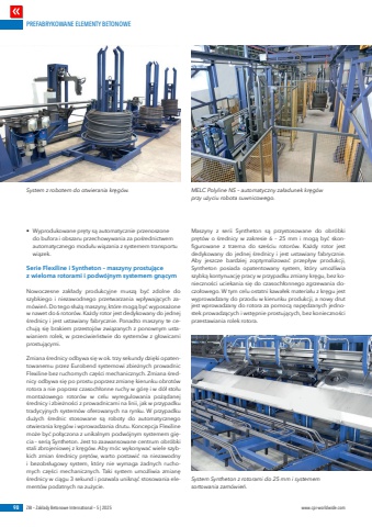 PREFABRYKOWANE ELEMENTY BETONOWE98 ZBI %u2013 Zak%u0142ady Betonowe International %u2013 5 | 2025 www.cpi-worldwide.com%u2022 Wyprodukowane pr%u0119ty s%u0105 automatycznie przenoszone do bufora i obszaru przechowywania za po%u015brednictwem automatycznego modu%u0142u wi%u0105zania z systemem transportu wi%u0105zek.Serie Flexiline i Syntheton %u2013 maszyny prostuj%u0105ce z wieloma rotorami i podw%u00f3jnym systemem gn%u0105cymNowoczesne zak%u0142ady produkcyjne musz%u0105 by%u0107 zdolne do szybkiego i niezawodnego przetwarzania wp%u0142ywaj%u0105cych zam%u00f3wie%u0144. Do tego s%u0142u%u017c%u0105 maszyny, kt%u00f3re mog%u0105 by%u0107 wyposa%u017cone w nawet do 6 rotor%u00f3w. Ka%u017cdy rotor jest dedykowany do jednej %u015brednicy i jest ustawiany fabrycznie. Ponadto maszyny te cechuj%u0105 si%u0119 brakiem przestoj%u00f3w zwi%u0105zanych z ponownym ustawianiem rolek, w przeciwie%u0144stwie do system%u00f3w z g%u0142owicami prostuj%u0105cymi.Zmiana %u015brednicy odbywa si%u0119 w ok. trzy sekundy dzi%u0119ki opatentowanemu przez Eurobend systemowi zbie%u017cnych prowadnic Flexiline bez ruchomych cz%u0119%u015bci mechanicznych. Zmiana %u015brednicy odbywa si%u0119 po prostu poprzez zmian%u0119 kierunku obrot%u00f3w rotora a nie poprzez czasoch%u0142onne ruchy w g%u00f3r%u0119 i w d%u00f3%u0142 sto%u0142u monta%u017cowego rotor%u00f3w w celu wyregulowania po%u017c%u0105danej %u015brednicy i zbie%u017cno%u015bci z prowadnicami na linii, jak w przypadku tradycyjnych system%u00f3w oferowanych na rynku. W przypadku du%u017cych %u015brednic stosowane s%u0105 roboty do automatycznego otwierania kr%u0119g%u00f3w i wprowadzania drutu. Koncepcja Flexiline mo%u017ce by%u0107 po%u0142%u0105czona z unikalnym podw%u00f3jnym systemem gi%u0119cia %u2013 seri%u0105 Syntheton. Jest to zaawansowane centrum obr%u00f3bki stali zbrojeniowej z kr%u0119g%u00f3w. Aby m%u00f3c wykonywa%u0107 wiele szybkich zmian %u015brednicy pr%u0119t%u00f3w, warto postawi%u0107 na niezawodny i bezobs%u0142ugowy system, kt%u00f3ry nie wymaga %u017cadnych ruchomych cz%u0119%u015bci mechanicznych. Taki system umo%u017cliwia zmian%u0119 %u015brednicy w ci%u0105gu 3 sekund i pozwala unikn%u0105%u0107 stosowania element%u00f3w podatnych na zu%u017cycie. Maszyny z serii Syntheton s%u0105 przystosowane do obr%u00f3bki pr%u0119t%u00f3w o %u015brednicy w zakresie 6 %u2013 25 mm i mog%u0105 by%u0107 skonfigurowane z trzema do sze%u015bciu rotor%u00f3w. Ka%u017cdy rotor jest dedykowany do jednej %u015brednicy i jest ustawiany fabrycznie. Aby jeszcze bardziej zoptymalizowa%u0107 przep%u0142yw produkcji, Syntheton posiada opatentowany system, kt%u00f3ry umo%u017cliwia szybk%u0105 kontynuacj%u0119 pracy w przypadku zmiany kr%u0119gu, bez konieczno%u015bci uciekania si%u0119 do czasoch%u0142onnego zgrzewania doczo%u0142owego. W tym celu ostatni kawa%u0142ek materia%u0142u z kr%u0119gu jest wyprowadzany do przodu w kierunku produkcji, a nowy drut jest wprowadzany do rotora za pomoc%u0105 nap%u0119dzanych jednostek prowadz%u0105cych i wst%u0119pnie prostuj%u0105cych, bez konieczno%u015bci przestawiania rolek rotora.System z robotem do otwierania kr%u0119g%u00f3w. MELC Polyline NS %u2013 automatyczny za%u0142adunek kr%u0119g%u00f3w przy u%u017cyciu robota suwnicowego.System Syntheton z rotorami do 25 mm i systemem sortowania zam%u00f3wie%u0144.