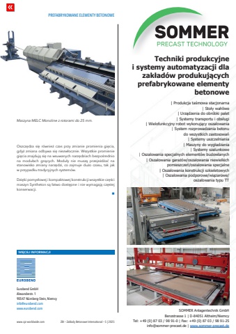 PREFABRYKOWANE ELEMENTY BETONOWEwww.cpi-worldwide.com%u0009 ZBI %u2013 Zak%u0142ady Betonowe International %u2013 5 | 2025Oszcz%u0119dza si%u0119 r%u00f3wnie%u017c czas przy zmianie promienia gi%u0119cia, gdy%u017c zmiana odbywa si%u0119 niezw%u0142ocznie. Wszystkie promienie gi%u0119cia znajduj%u0105 si%u0119 na wsuwanych narz%u0119dziach bezpo%u015brednio na modu%u0142ach gn%u0105cych. Modu%u0142y nie musz%u0105 przeje%u017cd%u017ca%u0107 na stanowisko zmiany narz%u0119dzi, co zajmuje du%u017co czasu, tak jak w przypadku tradycyjnych system%u00f3w.Dzi%u0119ki pomys%u0142owej i kompaktowej konstrukcji wszystkie cz%u0119%u015bci maszyn Syntheton s%u0105 %u0142atwo dost%u0119pne i nie wymagaj%u0105 cz%u0119stej konserwacji.nWI%u0118CEJ INFORMACJIEurobend GmbHAlexanderstr. 190547 N%u00fcrnberg-Stein, Niemcyinfo@eurobend.comwww.eurobend.comMaszyna MELC Monoline z rotorami do 25 mm.SOMMER Anlagentechnik GmbHBenzstrasse 1 | D-84051 Altheim/Niemcy Tel: +49 (0) 87 03 / 98 91-0 | Fax: +49 (0) 87 03 / 98 91-25info@sommer-precast.de | www.sommer-precast.deTechniki produkcyjne i systemy automatyzacji dla zak%u0142ad%u00f3w produkuj%u0105cych prefabrykowane elementy betonowe| Produkcja ta%u015bmowa stacjonarna| Sto%u0142y wahliwe| Urz%u0105dzenia do obr%u00f3bki palet| Systemy transportu i obs%u0142ugi| Wielofunkcyjny robot wykonuj%u0105cy oszalowania| System rozprowadzania betonu do wszystkich zastosowa%u0144| Systemy uszczelniania| Maszyny do wyg%u0142adzania| Systemy szalunkowe| Oszalowania specjalnych element%u00f3w budowlanych| Oszalowania gara%u017c%u00f3w/oszalowania niewielkich pomieszcze%u0144/oszalowania specjalne| Oszalowania konstrukcji szkieletowych| Oszalowania podporowe/wi%u0105zarowe/ oszalowania typu TT