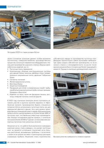 %u0421%u0411%u041e%u0420%u041d%u042b%u0419 %u0411%u0415%u0422%u041e%u041d112 CPI %u2013 Concrete Plant International | Eurasia Edition %u2013 5 | 2025 www.cpi-worldwide.com%u0441%u0432%u043e%u0435%u0433%u043e %u043e%u0441%u043d%u043e%u0432%u0430%u043d%u0438%u044f %u043a%u043e%u043c%u043f%u0430%u043d%u0438%u044f %u0443%u0434%u0435%u043b%u044f%u0435%u0442 %u043e%u0441%u043e%u0431%u043e%u0435 %u0432%u043d%u0438%u043c%u0430%u043d%u0438%u0435 %u043f%u043e%u0441%u0442%u043e%u044f%u043d%u043d%u043e%u043c%u0443 %u0441%u043e%u0432%u0435%u0440%u0448%u0435%u043d%u0441%u0442%u0432%u043e%u0432%u0430%u043d%u0438%u044e %u043f%u0440%u043e%u0438%u0437%u0432%u043e%u0434%u0441%u0442%u0432%u0435%u043d%u043d%u044b%u0445 %u043f%u0440%u043e%u0446%u0435%u0441%u0441%u043e%u0432, %u0438%u0441%u043f%u043e%u043b%u044c%u0437%u0443%u044f %u0441%u043e%u0432%u0440%u0435%u043c%u0435%u043d%u043d%u043e%u0435 %u043e%u0431%u043e%u0440%u0443%u0434%u043e%u0432%u0430%u043d%u0438%u0435 %u0438 %u0442%u0435%u0445%u043d%u0438%u043a%u0443 %u0434%u043b%u044f %u043f%u0440%u043e%u0438%u0437%u0432%u043e%u0434%u0441%u0442%u0432%u0430 %u0448%u0438%u0440%u043e%u043a%u043e%u0433%u043e %u0441%u043f%u0435%u043a%u0442%u0440%u0430 %u0441%u0431%u043e%u0440%u043d%u044b%u0445 %u0436%u0435%u043b%u0435%u0437%u043e%u0431%u0435%u0442%u043e%u043d%u043d%u044b%u0445 %u0438%u0437%u0434%u0435%u043b%u0438%u0439, %u043a%u0430%u043a %u0442%u043e:%u2022 %u041f%u0443%u0441%u0442%u043e%u0442%u043d%u044b%u0435 %u043f%u043b%u0438%u0442%u044b %u043f%u0435%u0440%u0435%u043a%u0440%u044b%u0442%u0438%u044f%u2022 %u041a%u043e%u043c%u043f%u043b%u0435%u043a%u0441%u043d%u044b%u0435 %u0441%u0431%u043e%u0440%u043d%u044b%u0435 %u043a%u043e%u043d%u0441%u0442%u0440%u0443%u043a%u0446%u0438%u043e%u043d%u043d%u044b%u0435 %u0441%u0438%u0441%u0442%u0435%u043c%u044b %u0434%u043b%u044f %u0437%u0434%u0430%u043d%u0438%u0439: %u0431%u0430%u043b%u043a%u0438, %u043a%u043e%u043b%u043e%u043d%u043d%u044b, %u0434%u0432%u043e%u0439%u043d%u044b%u0435 %u0441%u0442%u0435%u043d%u044b, %u043f%u0440%u0435%u0434%u0432%u0430%u0440%u0438%u0442%u0435%u043b%u044c%u043d%u043e %u043d%u0430%u043f%u0440%u044f%u0436%u0435%u043d%u043d%u044b%u0435 %u043f%u043b%u0438%u0442%u044b, %u0434%u0432%u043e%u0439%u043d%u044b%u0435 %u0422-%u043e%u0431%u0440%u0430%u0437%u043d%u044b%u0435 %u0431%u0430%u043b%u043a%u0438%u2022 %u0421%u0435%u0433%u043c%u0435%u043d%u0442%u044b %u0442%u043e%u043d%u043d%u0435%u043b%u0435%u0439%u2022 %u0416%u0435%u043b%u0435%u0437%u043d%u043e%u0434%u043e%u0440%u043e%u0436%u043d%u044b%u0435 %u0448%u043f%u0430%u043b%u044b%u2022 %u041c%u043e%u0441%u0442%u043e%u0432%u044b%u0435 %u0431%u0430%u043b%u043a%u0438%u2022 %u0417%u0430%u0449%u0438%u0442%u043d%u044b%u0435 %u043e%u0433%u0440%u0430%u0436%u0434%u0435%u043d%u0438%u044f%u2022 %u041f%u0440%u043e%u0434%u0443%u043a%u0446%u0438%u044f %u0434%u043b%u044f %u0441%u0435%u0442%u0435%u0439 %u0438 %u043a%u043e%u043c%u043c%u0443%u043d%u0430%u043b%u044c%u043d%u044b%u0445 %u0441%u043b%u0443%u0436%u0431: %u0442%u0440%u0443%u0431%u044b, %u043a%u043e%u0440%u043e%u0431%u0447%u0430%u0442%u044b%u0435 %u0432%u043e%u0434%u043e%u043f%u0440%u043e%u043f%u0443%u0441%u043a%u043d%u044b%u0435 %u0442%u0440%u0443%u0431%u044b, %u043a%u043e%u043b%u044c%u0446%u0430 %u0441 %u0434%u043d%u0438%u0449%u0435%u043c, %u0431%u043e%u0440%u0434%u044e%u0440%u044b %u0438 %u0431%u0440%u0443%u0441%u0447%u0430%u0442%u043a%u0430%u2022 %u0418%u0437%u0434%u0435%u043b%u0438%u044f %u043d%u0430 %u0437%u0430%u043a%u0430%u0437, %u0442%u0430%u043a%u0438%u0435 %u043a%u0430%u043a %u0444%u0430%u0441%u0430%u0434%u043d%u044b%u0435 %u043f%u0430%u043d%u0435%u043b%u0438, %u043b%u0435%u0441%u0442%u043d%u0438%u0446%u044b, %u043f%u043b%u0430%u0432%u0443%u0447%u0438%u0435 %u043f%u043e%u043d%u0442%u043e%u043d%u044b %u0438 %u043c%u043d%u043e%u0433%u043e%u0435 %u0434%u0440%u0443%u0433%u043e%u0435.%u0412 2022 %u0433%u043e%u0434%u0443 %u043a%u043e%u043c%u043f%u0430%u043d%u0438%u044f %u043a%u043e%u043c%u043f%u0430%u043d%u0438%u044f Armos %u043f%u0440%u0438%u043d%u0438%u043c%u0430%u043b%u0430 %u0430%u043a%u0442%u0438%u0432%u043d%u043e%u0435 %u0443%u0447%u0430%u0441%u0442%u0438%u0435 %u0432 %u043a%u0440%u0443%u043f%u043d%u043e%u043c %u043f%u0440%u043e%u0435%u043a%u0442%u0435 %u043d%u0435%u0434%u0430%u043b%u0435%u043a%u043e %u043e%u0442 %u0410%u0444%u0438%u043d. %u0417%u0430%u043a%u0430%u0437%u0447%u0438%u043a %u043f%u0440%u043e%u0435%u043a%u0442%u0430, %u043f%u0440%u043e%u0438%u0437%u0432%u043e%u0434%u0438%u0442%u0435%u043b%u044c %u0431%u0443%u043c%u0430%u0433%u0438, %u0441%u043f%u0435%u0446%u0438%u0430%u043b%u044c%u043d%u043e %u043f%u043e%u043f%u0440%u043e%u0441%u0438%u043b Armos %u0438%u0441%u043f%u043e%u043b%u044c%u0437%u043e%u0432%u0430%u0442%u044c %u043f%u0443%u0441%u0442%u043e%u0442%u043d%u044b%u0435 %u043f%u043b%u0438%u0442%u044b %u043a%u0430%u043a %u0434%u043b%u044f %u043f%u0435%u0440%u0435%u043a%u0440%u044b%u0442%u0438%u0439 %u043e%u0444%u0438%u0441%u043d%u043e%u0433%u043e %u0437%u0434%u0430%u043d%u0438%u044f, %u0442%u0430%u043a %u0438 %u0434%u043b%u044f %u043a%u0440%u043e%u0432%u043b%u0438 %u043f%u0440%u043e%u0438%u0437%u0432%u043e%u0434%u0441%u0442%u0432%u0435%u043d%u043d%u044b%u0445 %u043f%u043e%u043c%u0435%u0449%u0435%u043d%u0438%u0439 %u043d%u043e%u0432%u043e%u0433%u043e %u0437%u0430%u0432%u043e%u0434%u0430. %u0414%u043b%u044f %u0440%u0435%u0430%u043b%u0438%u0437%u0430%u0446%u0438%u0438 %u043f%u0440%u043e%u0435%u043a%u0442%u0430 Armos %u0438%u043c%u043f%u043e%u0440%u0442%u0438%u0440%u043e%u0432%u0430%u043b%u0430 %u0438%u0437 %u0418%u0442%u0430%u043b%u0438%u0438 %u0431%u043e%u043b%u0435%u0435 4000 %u043c%u00b2 %u043f%u0443%u0441%u0442%u043e%u0442%u043d%u044b%u0445 %u043f%u043b%u0438%u0442, %u043f%u043e%u0441%u0442%u0430%u0432%u043b%u0435%u043d%u043d%u044b%u0445 %u0438%u0437%u0432%u0435%u0441%u0442%u043d%u044b%u043c %u043f%u0440%u043e%u0438%u0437%u0432%u043e%u0434%u0438%u0442%u0435%u043b%u0435%u043c. %u0412%u0441%u043a%u043e%u0440%u0435 %u043f%u043e%u0441%u043b%u0435%u0434%u043e%u0432%u0430%u043b%u0438 %u0434%u0440%