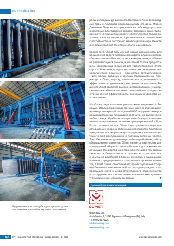 %u0421%u0411%u041e%u0420%u041d%u042b%u0419 %u0411%u0415%u0422%u041e%u041d122 CPI %u2013 Concrete Plant International | Eurasia Edition %u2013 5 | 2025 www.cpi-worldwide.com%u0440%u043e%u043f%u044b %u0438 %u0410%u043c%u0435%u0440%u0438%u043a%u0438 %u0434%u043e %u0411%u043b%u0438%u0436%u043d%u0435%u0433%u043e %u0412%u043e%u0441%u0442%u043e%u043a%u0430 %u0438 %u0410%u0437%u0438%u0438. %u0412 %u043f%u043e%u0441%u043b%u0435%u0434%u043d%u0438%u0435 %u0433%u043e%u0434%u044b %u043a %u0410%u043b%u044c%u0431%u0435%u0440%u0442%u043e %u043f%u0440%u0438%u0441%u043e%u0435%u0434%u0438%u043d%u0438%u043b%u0430%u0441%u044c %u0435%u0433%u043e %u0434%u043e%u0447%u044c, %u041c%u0430%u0440%u0438%u044f %u0414%u0436%u043e%u0432%u0430%u043d%u043d%u0430 %u0422%u0435%u0434%u0435%u0441%u043a%u043e, %u043a%u043e%u0442%u043e%u0440%u0430%u044f %u0432%u0437%u044f%u043b%u0430 %u043d%u0430 %u0441%u0435%u0431%u044f %u0432%u0435%u0434%u0443%u0449%u0443%u044e %u0440%u043e%u043b%u044c %u0432 %u043a%u043e%u043c%u043f%u0430%u043d%u0438%u0438. %u0411%u043b%u0430%u0433%u043e%u0434%u0430%u0440%u044f %u0435%u0435 %u0441%u0432%u0435%u0436%u0435%u043c%u0443 %u0432%u0437%u0433%u043b%u044f%u0434%u0443 %u0438 %u043e%u0440%u0438%u0435%u043d%u0442%u0438%u0440%u043e%u0432%u0430%u043d%u043d%u043e%u0441%u0442%u0438 %u043d%u0430 %u043f%u0440%u0438%u043d%u0446%u0438%u043f%u044b %u044d%u043a%u043e%u043b%u043e%u0433%u0438%u0447%u043d%u043e%u0441%u0442%u0438 Olmet %u043d%u0435 %u0442%u043e%u043b%u044c%u043a%u043e %u0441%u043e%u0445%u0440%u0430%u043d%u044f%u0435%u0442 %u0441%u0432%u043e%u0435 %u043d%u0430%u0441%u043b%u0435%u0434%u0438%u0435, %u043d%u043e %u0438 %u0440%u0430%u0437%u0432%u0438%u0432%u0430%u0435%u0442%u0441%u044f %u0432 %u0441%u043e%u043e%u0442%u0432%u0435%u0442%u0441%u0442%u0432%u0438%u0438 %u0441 %u043f%u043e%u0442%u0440%u0435%u0431%u043d%u043e%u0441%u0442%u044f%u043c%u0438 %u043f%u043e%u0441%u0442%u043e%u044f%u043d%u043d%u043e %u043c%u0435%u043d%u044f%u044e%u0449%u0435%u0433%u043e%u0441%u044f %u043c%u0438%u0440%u0430. %u0412%u043c%u0435%u0441%u0442%u0435 %u043e%u043d%u0438 %u043e%u043b%u0438%u0446%u0435%u0442%u0432%u043e%u0440%u044f%u044e%u0442 %u0441%u043e%u0447%u0435%u0442%u0430%u043d%u0438%u0435 %u043e%u043f%u044b%u0442%u0430 %u0438 %u0438%u043d%u043d%u043e%u0432%u0430%u0446%u0438%u0439.%u041a%u0440%u043e%u043c%u0435 %u0442%u043e%u0433%u043e, Olmet Italy %u0438%u0437%u0443%u0447%u0430%u0435%u0442 %u043d%u043e%u0432%u044b%u0435 %u0432%u043e%u0437%u043c%u043e%u0436%u043d%u043e%u0441%u0442%u0438 %u0434%u043b%u044f %u0440%u0430%u0441%u0448%u0438%u0440%u0435%u043d%u0438%u044f %u0441%u0432%u043e%u0435%u0433%u043e %u0433%u043b%u043e%u0431%u0430%u043b%u044c%u043d%u043e%u0433%u043e %u043e%u0445%u0432%u0430%u0442%u0430. %u0421%u043f%u0440%u043e%u0441 %u0432 %u0441%u0435%u043a%u0442%u043e%u0440%u0435 %u0441%u0431%u043e%u0440%u043d%u043e%u0433%u043e %u0436%u0435%u043b%u0435%u0437%u043e%u0431%u0435%u0442%u043e%u043d%u0430 %u0440%u0430%u0441%u0442%u0435%u0442 %u0441 %u043a%u0430%u0436%u0434%u044b%u043c %u0434%u043d%u0435%u043c, %u043e%u0441%u043e%u0431%u0435%u043d%u043d%u043e %u043d%u0430 %u0440%u0430%u0437%u0432%u0438%u0432%u0430%u044e%u0449%u0438%u0445%u0441%u044f %u0440%u044b%u043d%u043a%u0430%u0445, %u0438 %u043a%u043e%u043c%u043f%u0430%u043d%u0438%u044f %u0433%u043e%u0442%u043e%u0432%u0430 %u043f%u0440%u0435%u0434%u043e%u0441%u0442%u0430%u0432%u0438%u0442%u044c %u043d%u0435%u043e%u0431%u0445%u043e%u0434%u0438%u043c%u044b%u0435 %u0440%u0435%u0448%u0435%u043d%u0438%u044f %u0434%u043b%u044f %u0443%u0434%u043e%u0432%u043b%u0435%u0442%u0432%u043e%u0440%u0435%u043d%u0438%u044f %u044d%u0442%u043e%u0433%u043e %u0441%u043f%u0440%u043e%u0441%u0430. %u041a%u043e%u043c%u043f%u0430%u043d%u0438%u044f %u043f%u0440%u0435%u0434%u043b%u0430%u0433%u0430%u0435%u0442 %u043a%u043b%u0438%u0435%u043d%u0442%u0430%u043c %u043f%u0435%u0440%u0435%u0434%u043e%u0432%u044b%u0435 %u0442%u0435%u0445%u043d%u043e%u043b%u043e%u0433%u0438%u0447%u0435%u0441%u043a%u0438%u0435 %u0440%u0435%u0448%u0435%u043d%u0438%u044f %u2212 %u043f%u043e%u043b%u043d%u043e%u0441%u0442%u044c%u044e %u0430%u0432%u0442%u043e%u043c%u0430%u0442%u0438%u0447%u0435%u0441%u043a%u0438%u0435 %u2212 %u0434%u043b%u044f %u043c%u0430%u043b%u044b%u0445, %u0441%u0440%u0435%u0434%u043d%u0438%u0445 %u0438 %u043a%u0440%u0443%u043f%u043d%u044b%u0445 %u043f%u0440%u043e%u043c%u044b%u0448%u043b%u0435%u043d%u043d%u044b%u0445 %u043f%u0440%u043e%u0438%u0437%u0432%u043e%u0434%u0441%u0442%u0432. %u041e%u043f%u044b%u0442, %u043d%u043e%u0443-%u0445%u0430%u0443, %u043a%u043e%u043c%u043f%u0435%u0442%u0435%u043d%u0442%u043d%u043e%u0441%u0442%u044c, %u0443%u0432%u043b%u0435%u0447%u0435%u043d%u043d%u043e%u0441%u0442%u044c, %u044d%u0444%u0444%u0435%u043a%u0442%u0438%u0432%u043d%u043e%u0441%u0442%u044c, %u0434%u0438%u043d%u0430%u043c%u0438%u0437%u043c %u2013 %u0432%u043e%u0442 %u0446%u0435%u043d%u043d%u043e%u0441%u0442%u0438 %u043a%u043e%u043c%u043f%u0430%u043d%u0438%u0438. %u0420%u0435%u0448%u0435%u043d%u0438%u044f Olmet %u044f%u0432%u043b%u044f%u044e%u0442%u0441%u044f %u0432%u044b%u0441%u043e%u043a%u043e %u043d%u0430%u0441%u0442%u0440%u0430%u0438%u0432%u0430%u0435%u043c%u044b%u043c%u0438, %u0443%u043d%u0438%u0432%u0435%u0440%u0441%u0430%u043b%u044c%u043d%u044b%u043c%u0438 %u0438 %u0433%u0438%u0431%u043a%u0438%u043c%u0438 %u0438 %u043e%u0442%u0432%u0435%u0447%u0430%u044e%u0442 %u0432%u044b%u0441%u043e%u0447%u0430%u0439%u0448%u0438%u043c %u0441%u0442%u0430%u043d%u0434%u0430%u0440%u0442%u0430%u043c %u0441 %u0442%u043e%u0447%u043a%u0438 %u0437%u0440%u0435%u043d%u0438%u044f %u044d%u0444%u0444%u0435%u043a%u0442%u0438%u0432%u043d%u043e%u0441%u0442%u0438, %u044d%u043a%u043e%u043d%u043e%u043c%u0438%u0438 %u0438 %u0443%u0434%u043e%u0431%u0441%u0442%u0432%u0430 %u0438%u0441%u043f%u043e%u043b%u044c%u0437%u043e%u0432%u0430%u043d%u0438%u044f.%u0428%u0442%u0430%u0431-%u043a%u0432%u0430%u0440%u0442%u0438%u0440%u0430 %u043a%u043e%u043c%u043f%u0430%u043d%u0438%u0438 %u0440%u0430%u0441%u043f%u043e%u043b%u043e%u0436%u0435%u043d%u0430 %u043d%u0435%
