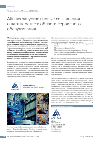 %u041d%u041e%u0412%u041e%u0421%u0422%u041816 CPI %u2013 Concrete Plant International | Eurasia Edition %u2013 5 | 2025 www.cpi-worldwide.comAfinitas, %u0432%u0435%u0434%u0443%u0449%u0430%u044f %u043c%u0438%u0440%u043e%u0432%u0430%u044f %u043a%u043e%u043c%u043f%u0430%u043d%u0438%u044f %u0432 %u043e%u0431%u043b%u0430%u0441%u0442%u0438 %u043f%u0440%u043e%u0438%u0437%u0432%u043e%u0434%u0441%u0442%u0432%u0430 %u0438 %u043f%u043e%u0441%u0442%u0430%u0432%u043a%u0438 %u043e%u0431%u043e%u0440%u0443%u0434%u043e%u0432%u0430%u043d%u0438%u044f %u0438 %u0443%u0441%u043b%u0443%u0433 %u0434%u043b%u044f %u0440%u0430%u0441%u0448%u0438%u0440%u0435%u043d%u0438%u044f %u0438%u043d%u0444%u0440%u0430%u0441%u0442%u0440%u0443%u043a%u0442%u0443%u0440%u044b, %u0441 %u0433%u043e%u0440%u0434%u043e%u0441%u0442%u044c%u044e %u043e%u0431%u044a%u044f%u0432%u043b%u044f%u0435%u0442 %u043e %u0437%u0430%u043f%u0443%u0441%u043a%u0435 %u0441%u0432%u043e%u0438%u0445 %u043f%u0440%u043e%u0433%u0440%u0430%u043c%u043c %u043f%u0430%u0440%u0442%u043d%u0435%u0440%u0441%u0442%u0432%u0430 %u0432 %u043e%u0431%u043b%u0430%u0441%u0442%u0438 %u0441%u0435%u0440%u0432%u0438%u0441%u043d%u043e%u0433%u043e %u043e%u0431%u0441%u043b%u0443%u0436%u0438%u0432%u0430%u043d%u0438%u044f %u0438 %u043f%u043b%u0430%u043d%u0438%u0440%u043e%u0432%u0430%u043d%u0438%u044f %u043f%u043e%u0441%u0442%u0430%u0432%u043e%u043a %u0437%u0430%u043f%u0430%u0441%u043d%u044b%u0445 %u0447%u0430%u0441%u0442%u0435%u0439. %u041d%u043e%u0432%u043e%u0432%u0432%u0435%u0434%u0435%u043d%u0438%u044f %u043f%u0440%u0438%u0437%u0432%u0430%u043d%u044b %u043f%u043e%u043c%u043e%u0447%u044c %u043f%u0440%u043e%u0438%u0437%u0432%u043e%u0434%u0438%u0442%u0435%u043b%u044f%u043c %u0442%u0440%u0443%u0431 %u0438 %u0441%u0431%u043e%u0440%u043d%u043e%u0433%u043e %u0436%u0435%u043b%u0435%u0437%u043e%u0431%u0435%u0442%u043e%u043d%u0430 %u0441%u043e%u043a%u0440%u0430%u0442%u0438%u0442%u044c %u0432%u0440%u0435%u043c%u044f %u043f%u0440%u043e%u0441%u0442%u043e%u044f, %u043f%u043e%u0432%u044b%u0441%u0438%u0442%u044c %u043e%u043f%u0435%u0440%u0430%u0446%u0438%u043e%u043d%u043d%u0443%u044e %u044d%u0444%u0444%u0435%u043a%u0442%u0438%u0432%u043d%u043e%u0441%u0442%u044c %u0438 %u043f%u0440%u043e%u0434%u043b%u0438%u0442%u044c %u0441%u0440%u043e%u043a %u0441%u043b%u0443%u0436%u0431%u044b %u0441%u0432%u043e%u0435%u0433%u043e %u043e%u0431%u043e%u0440%u0443%u0434%u043e%u0432%u0430%u043d%u0438%u044f %u0437%u0430 %u0441%u0447%u0435%u0442 %u043f%u0440%u0435%u0432%u0435%u043d%u0442%u0438%u0432%u043d%u043e%u0433%u043e %u0442%u0435%u0445%u043d%u0438%u0447%u0435%u0441%u043a%u043e%u0433%u043e %u043e%u0431%u0441%u043b%u0443%u0436%u0438%u0432%u0430%u043d%u0438%u044f %u0438 %u0441%u0442%u0440%u0430%u0442%u0435%u0433%u0438%u0447%u0435%u0441%u043a%u043e%u0433%u043e %u043f%u043b%u0430%u043d%u0438%u0440%u043e%u0432%u0430%u043d%u0438%u044f %u043f%u043e%u0441%u0442%u0430%u0432%u043e%u043a %u0437%u0430%u043f%u0430%u0441%u043d%u044b%u0445 %u0447%u0430%u0441%u0442%u0435%u0439.%u0412 %u0441%u043e%u0432%u0440%u0435%u043c%u0435%u043d%u043d%u044b%u0445 %u0443%u0441%u043b%u043e%u0432%u0438%u044f%u0445 %u0431%u044b%u0441%u0442%u0440%u043e %u043c%u0435%u043d%u044f%u044e%u0449%u0435%u0439%u0441%u044f %u043f%u0440%u043e%u0438%u0437%u0432%u043e%u0434%u0441%u0442%u0432%u0435%u043d%u043d%u043e%u0439 %u0441%u0440%u0435%u0434%u044b %u0434%u0430%u0436%u0435 %u043d%u0435%u0431%u043e%u043b%u044c%u0448%u0438%u0435 %u0441%u0431%u043e%u0438 %u0432 %u0440%u0430%u0431%u043e%u0442%u0435 %u043e%u0431%u043e%u0440%u0443%u0434%u043e%u0432%u0430%u043d%u0438%u044f %u043c%u043e%u0433%u0443%u0442 %u043f%u0440%u0438%u0432%u0435%u0441%u0442%u0438 %u043a %u0434%u043e%u0440%u043e%u0433%u043e%u0441%u0442%u043e%u044f%u0449%u0438%u043c %u0437%u0430%u0434%u0435%u0440%u0436%u043a%u0430%u043c. %u041d%u043e%u0432%u044b%u0435 %u043f%u0440%u043e%u0433%u0440%u0430%u043c%u043c%u044b %u0441%u0435%u0440%u0432%u0438%u0441%u043d%u043e%u0433%u043e %u043e%u0431%u0441%u043b%u0443%u0436%u0438%u0432%u0430%u043d%u0438%u044f %u0438 %u043f%u043e%u0441%u0442%u0430%u0432%u043a%u0438 %u0437%u0430%u043f%u0447%u0430%u0441%u0442%u0435%u0439 Afinitas Alliance %u2212 %u044d%u0442%u043e %u043a%u043e%u043c%u043f%u043b%u0435%u043a%u0441%u043d%u0430%u044f %u043f%u0440%u0435%u0432%u0435%u043d%u0442%u0438%u0432%u043d%u0430%u044f %u0441%u0442%u0440%u0430%u0442%u0435%u0433%u0438%u044f, %u0433%u0430%u0440%u0430%u043d%u0442%u0438%u0440%u0443%u044e%u0449%u0430%u044f %u043a%u043b%u0438%u0435%u043d%u0442%u0430%u043c %u043f%u043e%u0434%u0434%u0435%u0440%u0436%u043a%u0443, %u043e%u0431%u0443%u0447%u0435%u043d%u0438%u0435 %u0438 %u0440%u0435%u0441%u0443%u0440%u0441%u044b, %u043d%u0435%u043e%u0431%u0445%u043e%u0434%u0438%u043c%u044b%u0435 %u0434%u043b%u044f %u0443%u043f%u0440%u0435%u0436%u0434%u0435%u043d%u0438%u044f %u043f%u043e%u0442%u0435%u043d%u0446%u0438%u0430%u043b%u044c%u043d%u044b%u0445 %u043f%u0440%u043e%u0438%u0437%u0432%u043e%u0434%u0441%u0442%u0432%u0435%u043d%u043d%u044b%u0445 %u043f%u0440%u043e%u0431%u043b%u0435%u043c.%u041f%u0440%u043e%u0433%u0440%u0430%u043c%u043c%u044b %u0441%u0435%u0440%u0432%u0438%u0441%u043d%u043e%u0433%u043e %u043f%u0430%u0440%u0442%u043d%u0435%u0440%u0441%u0442%u0432%u0430 Alliance %u043f%u0440%u0435%u0434%u043b%u0430%u0433%u0430%u044e%u0442 %u043c%u043d%u043e%u0433%u043e%u043b%u0435%u0442%u043d%u0438%u0435 %u0441%u0435%u0440%u0432%u0438%u0441%u043d%u044b%u0435 %u0441%u043e%u0433%u043b%u0430%u0448%u0435%u043d%u0438%u044f, %u0430%u0434%u0430%u043f%u0442%u0438%u0440%u043e%u0432%u0430%u043d%u043d%u044b%u0435 %u043a %u043f%u043e%u0442%u0440%u0435%u0431%u043d%u043e%u0441%u0442%u044f%u043c %u043a%u0430%u0436%u0434%u043e%u0433%u043e %u0437%u0430%u0432%u043e%u0434%u0430, %u0432 %u0442%u043e%u043c %u0447%u0438%u0441%u043b%u0435:%u2022 %u041f%u0440%u043e%u0444%u0438%u043b%u0430%u043a%u0442%u0438%u0447%u0435%u0441%u043a%u043e%u0435 %u043e%u0431%u0441%u043b%u0443%u0436%u0438%u0432%u0430%u043d%u0438%u0435 %u043e%u0431%u043e%u0440%u0443%u0434%u043e%u0432%u0430%u043d%u0438%u044f Afinitas%u2022 