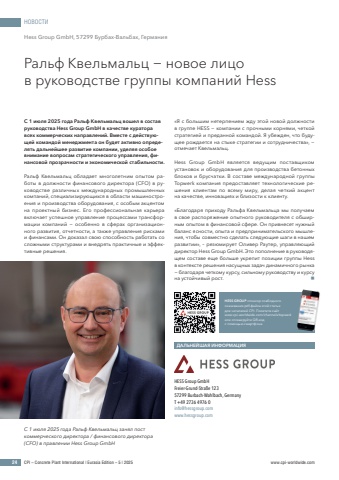 %u041d%u041e%u0412%u041e%u0421%u0422%u041824 CPI %u2013 Concrete Plant International | Eurasia Edition %u2013 5 | 2025 www.cpi-worldwide.com%u0421 1 %u0438%u044e%u043b%u044f 2025 %u0433%u043e%u0434%u0430 %u0420%u0430%u043b%u044c%u0444 %u041a%u0432%u0435%u043b%u044c%u043c%u0430%u043b%u044c%u0446 %u0432%u043e%u0448%u0435%u043b %u0432 %u0441%u043e%u0441%u0442%u0430%u0432 %u0440%u0443%u043a%u043e%u0432%u043e%u0434%u0441%u0442%u0432%u0430 Hess Group GmbH %u0432 %u043a%u0430%u0447%u0435%u0441%u0442%u0432%u0435 %u043a%u0443%u0440%u0430%u0442%u043e%u0440%u0430 %u0432%u0441%u0435%u0445 %u043a%u043e%u043c%u043c%u0435%u0440%u0447%u0435%u0441%u043a%u0438%u0445 %u043d%u0430%u043f%u0440%u0430%u0432%u043b%u0435%u043d%u0438%u0439. %u0412%u043c%u0435%u0441%u0442%u0435 %u0441 %u0434%u0435%u0439%u0441%u0442%u0432%u0443%u044e%u0449%u0435%u0439 %u043a%u043e%u043c%u0430%u043d%u0434%u043e%u0439 %u043c%u0435%u043d%u0435%u0434%u0436%u043c%u0435%u043d%u0442%u0430 %u043e%u043d %u0431%u0443%u0434%u0435%u0442 %u0430%u043a%u0442%u0438%u0432%u043d%u043e %u043e%u043f%u0440%u0435%u0434%u0435%u043b%u044f%u0442%u044c %u0434%u0430%u043b%u044c%u043d%u0435%u0439%u0448%u0435%u0435 %u0440%u0430%u0437%u0432%u0438%u0442%u0438%u0435 %u043a%u043e%u043c%u043f%u0430%u043d%u0438%u0438, %u0443%u0434%u0435%u043b%u044f%u044f %u043e%u0441%u043e%u0431%u043e%u0435 %u0432%u043d%u0438%u043c%u0430%u043d%u0438%u0435 %u0432%u043e%u043f%u0440%u043e%u0441%u0430%u043c %u0441%u0442%u0440%u0430%u0442%u0435%u0433%u0438%u0447%u0435%u0441%u043a%u043e%u0433%u043e %u0443%u043f%u0440%u0430%u0432%u043b%u0435%u043d%u0438%u044f, %u0444%u0438%u043d%u0430%u043d%u0441%u043e%u0432%u043e%u0439 %u043f%u0440%u043e%u0437%u0440%u0430%u0447%u043d%u043e%u0441%u0442%u0438 %u0438 %u044d%u043a%u043e%u043d%u043e%u043c%u0438%u0447%u0435%u0441%u043a%u043e%u0439 %u0441%u0442%u0430%u0431%u0438%u043b%u044c%u043d%u043e%u0441%u0442%u0438. %u0420%u0430%u043b%u044c%u0444 %u041a%u0432%u0435%u043b%u044c%u043c%u0430%u043b%u044c%u0446 %u043e%u0431%u043b%u0430%u0434%u0430%u0435%u0442 %u043c%u043d%u043e%u0433%u043e%u043b%u0435%u0442%u043d%u0438%u043c %u043e%u043f%u044b%u0442%u043e%u043c %u0440%u0430%u0431%u043e%u0442%u044b %u0432 %u0434%u043e%u043b%u0436%u043d%u043e%u0441%u0442%u0438 %u0444%u0438%u043d%u0430%u043d%u0441%u043e%u0432%u043e%u0433%u043e %u0434%u0438%u0440%u0435%u043a%u0442%u043e%u0440%u0430 (CFO) %u0432 %u0440%u0443%u043a%u043e%u0432%u043e%u0434%u0441%u0442%u0432%u0435 %u0440%u0430%u0437%u043b%u0438%u0447%u043d%u044b%u0445 %u043c%u0435%u0436%u0434%u0443%u043d%u0430%u0440%u043e%u0434%u043d%u044b%u0445 %u043f%u0440%u043e%u043c%u044b%u0448%u043b%u0435%u043d%u043d%u044b%u0445 %u043a%u043e%u043c%u043f%u0430%u043d%u0438%u0439, %u0441%u043f%u0435%u0446%u0438%u0430%u043b%u0438%u0437%u0438%u0440%u0443%u044e%u0449%u0438%u0445%u0441%u044f %u0432 %u043e%u0431%u043b%u0430%u0441%u0442%u0438 %u043c%u0430%u0448%u0438%u043d%u043e%u0441%u0442%u0440%u043e%u0435%u043d%u0438%u044f %u0438 %u043f%u0440%u043e%u0438%u0437%u0432%u043e%u0434%u0441%u0442%u0432%u0430 %u043e%u0431%u043e%u0440%u0443%u0434%u043e%u0432%u0430%u043d%u0438%u044f, %u0441 %u043e%u0441%u043e%u0431%u044b%u043c %u0430%u043a%u0446%u0435%u043d%u0442%u043e%u043c %u043d%u0430 %u043f%u0440%u043e%u0435%u043a%u0442%u043d%u044b%u0439 %u0431%u0438%u0437%u043d%u0435%u0441. %u0415%u0433%u043e %u043f%u0440%u043e%u0444%u0435%u0441%u0441%u0438%u043e%u043d%u0430%u043b%u044c%u043d%u0430%u044f %u043a%u0430%u0440%u044c%u0435%u0440%u0430 %u0432%u043a%u043b%u044e%u0447%u0430%u0435%u0442 %u0443%u0441%u043f%u0435%u0448%u043d%u043e%u0435 %u0443%u043f%u0440%u0430%u0432%u043b%u0435%u043d%u0438%u0435 %u043f%u0440%u043e%u0446%u0435%u0441%u0441%u0430%u043c%u0438 %u0442%u0440%u0430%u043d%u0441%u0444%u043e%u0440%u043c%u0430%u0446%u0438%u0438 %u043a%u043e%u043c%u043f%u0430%u043d%u0438%u0439 %u2212 %u043e%u0441%u043e%u0431%u0435%u043d%u043d%u043e %u0432 %u0441%u0444%u0435%u0440%u0430%u0445 %u043e%u0440%u0433%u0430%u043d%u0438%u0437%u0430%u0446%u0438%u043e%u043d%u043d%u043e%u0433%u043e %u0440%u0430%u0437%u0432%u0438%u0442%u0438%u044f, %u043e%u0442%u0447%u0435%u0442%u043d%u043e%u0441%u0442%u0438, %u0430 %u0442%u0430%u043a%u0436%u0435 %u0443%u043f%u0440%u0430%u0432%u043b%u0435%u043d%u0438%u044f %u0440%u0438%u0441%u043a%u0430%u043c%u0438 %u0438 %u0444%u0438%u043d%u0430%u043d%u0441%u0430%u043c%u0438. %u041e%u043d %u0434%u043e%u043a%u0430%u0437%u0430%u043b %u0441%u0432%u043e%u044e %u0441%u043f%u043e%u0441%u043e%u0431%u043d%u043e%u0441%u0442%u044c %u0440%u0430%u0431%u043e%u0442%u0430%u0442%u044c %u0441%u043e %u0441%u043b%u043e%u0436%u043d%u044b%u043c%u0438 %u0441%u0442%u0440%u0443%u043a%u0442%u0443%u0440%u0430%u043c%u0438 %u0438 %u0432%u043d%u0435%u0434%u0440%u044f%u0442%u044c %u043f%u0440%u0430%u043a%u0442%u0438%u0447%u043d%u044b%u0435 %u0438 %u044d%u0444%u0444%u0435%u043a%u0442%u0438%u0432%u043d%u044b%u0435 %u0440%u0435%u0448%u0435%u043d%u0438%u044f.%u00ab%u042f %u0441 %u0431%u043e%u043b%u044c%u0448%u0438%u043c %u043d%u0435%u0442%u0435%u0440%u043f%u0435%u043d%u0438%u0435%u043c %u0436%u0434%u0443 %u044d%u0442%u043e%u0439 %u043d%u043e%u0432%u043e%u0439 %u0434%u043e%u043b%u0436%u043d%u043e%u0441%u0442%u0438 %u0432 %u0433%u0440%u0443%u043f%u043f%u0435 HESS %u2212 %u043a%u043e%u043c%u043f%u0430%u043d%u0438%u0438 %u0441 %u043f%u0440%u043e%u0447%u043d%u044b%u043c%u0438 %u043a%u043e%u0440%u043d%u044f%u043c%u0438, %u0447%u0435%u0442%u043a%u043e%u0439 %u0441%u0442%u0440%u0430%u0442%u0435%u0433%u0438%u0435%u0439 %u0438 %u043f%u0440%u0435%u0434%u0430%u043d%u043d%u043e%u0439 %u043a%u043e%u043c%u0430%u043d%u0434%u043e%u0439. %u042f %u0443%u0431%u0435%u0436%u0434%u0435%u043d, %u0447%u0442%u043e %u0431%u0443%u0434%u0443%u0449%u0435%u0435 %u0440%u043e%u0436%u0434%u0430%u0435%u0442%u0441%u044f %u043d%u0430 %u0441%u0442%u044b%u043a%u0435 %u0441%u0442%u0440%u0430%u0442%u0435%u0433%u0438%u0438 %u0438 %u0441%u043e%u0442%u0440%u0443%u0434%u043d%u0438%u0447%u0435%u0441%u0442%u0432%u0430%u00bb, %u2212 %u043e%u0442%u043c%u0435%u0447%u0430%u0435%u0442 %u041a%u0432%u0435%u043b%u044c%u043c%u0430%