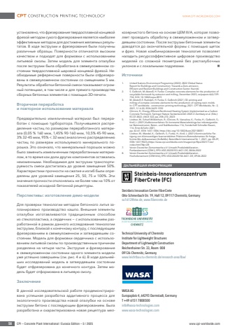58 CPI %u2013 Concrete Plant International | Eurasia Edition %u2013 5 | 2025 www.cpi-worldwide.com%u0443%u0441%u0442%u0430%u043d%u043e%u0432%u043b%u0435%u043d%u043e, %u0447%u0442%u043e %u0444%u0440%u0435%u0437%u0435%u0440%u043e%u0432%u0430%u043d%u0438%u0435 %u0442%u0432%u0435%u0440%u0434%u043e%u0441%u043f%u043b%u0430%u0432%u043d%u043e%u0439 %u043a%u043e%u043d%u0446%u0435%u0432%u043e%u0439 %u0444%u0440%u0435%u0437%u043e%u0439 %u043c%u0435%u0442%u043e%u0434%u043e%u043c %u0441%u0443%u0445%u043e%u0433%u043e %u0444%u0440%u0435%u0437%u0435%u0440%u043e%u0432%u0430%u043d%u0438%u044f %u044f%u0432%u043b%u044f%u0435%u0442%u0441%u044f %u043d%u0430%u0438%u0431%u043e%u043b%u0435%u0435 %u044d%u0444%u0444%u0435%u043a%u0442%u0438%u0432%u043d%u044b%u043c %u043c%u0435%u0442%u043e%u0434%u043e%u043c %u0434%u043b%u044f %u0434%u043e%u0441%u0442%u0438%u0436%u0435%u043d%u0438%u044f %u0436%u0435%u043b%u0430%u0435%u043c%u044b%u0445 %u0440%u0435%u0437%u0443%u043b%u044c%u0442%u0430%u0442%u043e%u0432. %u0412 %u0445%u043e%u0434%u0435 %u044d%u043a%u0441%u0442%u0440%u0443%u0437%u0438%u0438 %u0438 %u0444%u0440%u0435%u0437%u0435%u0440%u043e%u0432%u0430%u043d%u0438%u044f %u0431%u044b%u043b%u0438 %u043f%u043e%u043b%u0443%u0447%u0435%u043d%u044b %u0440%u0430%u0437%u043b%u0438%u0447%u043d%u044b%u0435 %u043e%u0431%u0440%u0430%u0437%u0446%u044b. %u041f%u043e%u0432%u0435%u0440%u0445%u043d%u043e%u0441%u0442%u0438 %u043e%u0442%u043b%u0438%u0447%u0430%u044e%u0442%u0441%u044f %u0432%u044b%u0441%u043e%u043a%u0438%u043c %u043a%u0430%u0447%u0435%u0441%u0442%u0432%u043e%u043c %u0438 %u043f%u043e%u0434%u0445%u043e%u0434%u044f%u0442 %u0434%u043b%u044f %u0444%u043e%u0440%u043c%u043e%u0432%u043a%u0438 %u0441 %u0438%u0441%u043f%u043e%u043b%u044c%u0437%u043e%u0432%u0430%u043d%u0438%u0435%u043c %u043b%u0438%u0442%u044c%u0435%u0432%u043e%u0439 %u0441%u043c%u043e%u043b%u044b. %u0417%u0430%u0442%u0435%u043c %u043c%u043e%u0434%u0435%u043b%u044c %u0434%u043b%u044f %u044d%u043b%u0435%u043c%u0435%u043d%u0442%u0430 %u043e%u043f%u0430%u043b%u0443%u0431%u043a%u0438 %u043f%u043e%u0441%u043b%u0435 %u044d%u043a%u0441%u0442%u0440%u0443%u0437%u0438%u0438 %u0431%u044b%u043b%u0430 %u043e%u0431%u0440%u0430%u0431%u043e%u0442%u0430%u043d%u0430 %u0432 %u0441%u0432%u0435%u0436%u0435%u0443%u043b%u043e%u0436%u0435%u043d%u043d%u043e%u043c %u0441%u043e%u0441%u0442%u043e%u044f%u043d%u0438%u0438 %u0442%u0432%u0435%u0440%u0434%u043e%u0441%u043f%u043b%u0430%u0432%u043d%u043e%u0439 %u0448%u0430%u0440%u043e%u0432%u043e%u0439 %u043a%u043e%u043d%u0446%u0435%u0432%u043e%u0439 %u0444%u0440%u0435%u0437%u043e%u0439. %u041d%u0435%u043e%u0431%u0445%u043e%u0434%u0438%u043c%u044b%u0435 %u0440%u0435%u0444%u0435%u0440%u0435%u043d%u0441%u043d%u044b%u0435 %u043f%u043e%u0432%u0435%u0440%u0445%u043d%u043e%u0441%u0442%u0438 %u0431%u044b%u043b%u0438 %u043e%u0442%u0444%u0440%u0435%u0437%u0435%u0440%u043e%u0432%u0430%u043d%u044b %u0432 %u0441%u0432%u0435%u0436%u0435%u0443%u043b%u043e%u0436%u0435%u043d%u043d%u043e%u043c %u0441%u043e%u0441%u0442%u043e%u044f%u043d%u0438%u0438 %u0441%u043e %u0441%u043c%u0435%u0449%u0435%u043d%u0438%u0435%u043c 5 %u043c%u043c. %u0420%u0435%u0437%u0443%u043b%u044c%u0442%u0430%u0442%u044b %u043e%u0431%u0440%u0430%u0431%u043e%u0442%u043a%u0438 %u0431%u0435%u0442%u043e%u043d%u043d%u043e%u0439 %u0441%u043c%u0435%u0441%u0438 %u043f%u043e%u043a%u0430%u0437%u044b%u0432%u0430%u044e%u0442 %u043e%u0433%u0440%u043e%u043c%u043d%u044b%u0439 %u043f%u043e%u0442%u0435%u043d%u0446%u0438%u0430%u043b, %u0432 %u0442%u043e%u043c %u0447%u0438%u0441%u043b%u0435 %u0438 %u0434%u043b%u044f %u043f%u0440%u044f%u043c%u043e%u0433%u043e %u043f%u0440%u043e%u0438%u0437%u0432%u043e%u0434%u0441%u0442%u0432%u0430 %u0441%u0431%u043e%u0440%u043d%u044b%u0445 %u0431%u0435%u0442%u043e%u043d%u043d%u044b%u0445 %u044d%u043b%u0435%u043c%u0435%u043d%u0442%u043e%u0432 %u0441 %u043f%u043e%u043c%u043e%u0449%u044c%u044e 3D-%u043f%u0435%u0447%u0430%u0442%u0438. %u0412%u0442%u043e%u0440%u0438%u0447%u043d%u0430%u044f %u043f%u0435%u0440%u0435%u0440%u0430%u0431%u043e%u0442%u043a%u0430 %u0438 %u043f%u043e%u0432%u0442%u043e%u0440%u043d%u043e%u0435 %u0438%u0441%u043f%u043e%u043b%u044c%u0437%u043e%u0432%u0430%u043d%u0438%u0435 %u043c%u0430%u0442%u0435%u0440%u0438%u0430%u043b%u0430%u041f%u0440%u0435%u0434%u0432%u0430%u0440%u0438%u0442%u0435%u043b%u044c%u043d%u043e %u0438%u0437%u043c%u0435%u043b%u044c%u0447%u0435%u043d%u043d%u044b%u0439 %u043c%u0430%u0442%u0435%u0440%u0438%u0430%u043b %u0431%u044b%u043b %u043f%u0435%u0440%u0435%u0440%u0430%u0431%u043e%u0442%u0430%u043d %u0441 %u043f%u043e%u043c%u043e%u0449%u044c%u044e %u0442%u0443%u0440%u0431%u043e%u0440%u043e%u0442%u043e%u0440%u0430. %u041f%u043e%u043b%u0443%u0447%u0438%u0432%u0448%u0435%u0435%u0441%u044f %u0440%u0430%u0441%u043f%u0440%u0435%u0434%u0435%u043b%u0435%u043d%u0438%u0435 %u0447%u0430%u0441%u0442%u0438%u0446 %u043f%u043e %u0440%u0430%u0437%u043c%u0435%u0440%u0430%u043c %u043f%u0435%u0440%u0435%u0440%u0430%u0431%u043e%u0442%u0430%u043d%u043d%u043e%u0433%u043e %u043c%u0430%u0442%u0435%u0440%u0438%u0430%u043b%u0430 (0,05 % 160 %u043c%u043a%u043c, 1,45% 90-160 %u043c%u043a%u043c, 10,5% 45-90 %u043c%u043a%u043c, 3% 32-45 %u043c%u043a%u043c, 95% < 32 %u043c%u043a%u043c) %u0430%u043d%u0430%u043b%u043e%u0433%u0438%u0447%u043d%u043e %u0440%u0430%u0441%u043f%u0440%u0435%u0434%u0435%u043b%u0435%u043d%u0438%u044e %u0447%u0430%u0441%u0442%u0438%u0446 %u043f%u043e %u0440%u0430%u0437%u043c%u0435%u0440%u0430%u043c %u0438%u0441%u043f%u043e%u043b%u044c%u0437%u0443%u0435%u043c%u043e%u0433%u043e %u043c%u0438%u043d%u0435%u0440%u0430%u043b%u044c%u043d%u043e%u0433%u043e %u043f%u043e%u0440%u043e%u0448%u043a%u0430. %u042d%u0442%u043e %u043e%u0437%u043d%u0430%u0447%u0430%u043b%u043e, %u0447%u0442%u043e %u043c%u0438%u043d%u0435%u0440%u0430%u043b%u044c%u043d%u044b%u0439 %u043f%u043e%u0440%u043e%u0448%u043e%u043a %u043c%u043e%u0436%u043d%u043e %u0431%u044b%u043b%u043e %u0437%u0430%u043c%u0435%u043d%u0438%u0442%u044c %u0438%u0437%u043c%u0435%u043b%u044c%u0447%u0435%u043d%u043d%u044b%u043c %u043
