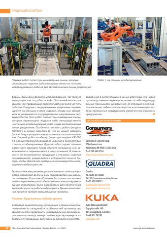 %u041f%u0420%u041e%u0414%u0423%u041a%u0426%u0418%u042f %u0418%u0417 %u0411%u0415%u0422%u041e%u041d%u041080 CPI %u2013 Concrete Plant International | Eurasia Edition %u2013 5 | 2025 www.cpi-worldwide.com%u0444%u043e%u0440%u043c%u044b, %u0440%u0430%u0437%u043c%u0435%u0440%u0430 %u0438 %u0444%u043e%u0440%u043c%u0430%u0442%u0430 %u0448%u0442%u0430%u0431%u0435%u043b%u0438%u0440%u043e%u0432%u0430%u043d%u0438%u044f, %u0447%u0442%u043e %u0442%u0440%u0435%u0431%u0443%u0435%u0442 %u0438%u043d%u0442%u0435%u0433%u0440%u0430%u0446%u0438%u0438 %u0448%u0435%u0441%u0442%u0438 %u0440%u043e%u0431%u043e%u0442%u043e%u0432 Kuka. %u042d%u0442%u043e %u043d%u043e%u0432%u044b%u0439 %u0432%u044b%u0437%u043e%u0432 %u0434%u043b%u044f Quadra, %u0447%u0435%u0439 %u043f%u0440%u0435%u0434%u044b%u0434%u0443%u0449%u0438%u0439 %u043f%u0440%u043e%u0435%u043a%u0442 %u0432 %u0421%u0428%u0410 %u0443%u0436%u0435 %u0432%u043a%u043b%u044e%u0447%u0430%u043b %u043f%u044f%u0442%u044c %u0440%u043e%u0431%u043e%u0442%u043e%u0432. %u041f%u043e%u0434%u0434%u043e%u043d%u044b %u0441 %u0432%u044b%u0434%u0435%u0440%u0436%u0430%u043d%u043d%u044b%u043c%u0438 %u0438%u0437%u0434%u0435%u043b%u0438%u044f%u043c%u0438 %u043f%u0435%u0440%u0435%u043c%u0435%u0449%u0430%u044e%u0442%u0441%u044f %u043d%u0430 %u0441%u0442%u0430%u043d%u0446%u0438%u044e %u0441%u043d%u044f%u0442%u0438%u044f %u0438%u0437%u0434%u0435%u043b%u0438%u0439, %u043e%u0442%u043a%u0443%u0434%u0430 %u043e%u043d%u0438 %u0437%u0430%u0431%u0438%u0440%u0430%u044e%u0442%u0441%u044f %u0438 %u0443%u043a%u043b%u0430%u0434%u044b%u0432%u0430%u044e%u0442%u0441%u044f %u0432 %u043e%u043f%u0440%u0435%u0434%u0435%u043b%u0435%u043d%u043d%u043e%u043c %u043d%u0430%u043f%u0440%u0430%u0432%u043b%u0435%u043d%u0438%u0438 %u043f%u0435%u0440%u0432%u044b%u043c %u0440%u043e%u0431%u043e%u0442%u043e%u043c. %u042d%u0442%u043e%u0442 %u0440%u043e%u0431%u043e%u0442 %u043f%u0438%u0442%u0430%u0435%u0442 %u0442%u0440%u0438 %u043a%u043e%u043d%u0432%u0435%u0439%u0435%u0440%u043d%u044b%u0435 %u043b%u0438%u043d%u0438%u0438, %u043a%u043e%u0442%u043e%u0440%u044b%u0435 %u043f%u0435%u0440%u0435%u043c%u0435%u0449%u0430%u044e%u0442 %u0438%u0437%u0434%u0435%u043b%u0438%u044f %u043b%u0438%u0431%u043e %u043d%u0435%u043f%u043e%u0441%u0440%u0435%u0434%u0441%u0442%u0432%u0435%u043d%u043d%u043e %u043d%u0430 %u0441%u0442%u0430%u043d%u0446%u0438%u044e %u0448%u0442%u0430%u0431%u0435%u043b%u0438%u0440%u043e%u0432%u0430%u043d%u0438%u044f, %u043b%u0438%u0431%u043e %u043d%u0430 %u0434%u0432%u0435 %u0430%u0432%u0442%u043e%u043c%u0430%u0442%u0438%u0447%u0435%u0441%u043a%u0438%u0435 %u043b%u0438%u043d%u0438%u0438 %u0440%u0430%u0437%u0434%u0435%u043b%u0435%u043d%u0438%u044f. %u041e%u0441%u043e%u0431%u0435%u043d%u043d%u043e%u0441%u0442%u044c%u044e %u044d%u0442%u043e%u0433%u043e %u0440%u043e%u0431%u043e%u0442%u0430 (%u043c%u043e%u0434%u0435%u043b%u044c KR1000 %u0441 6 %u043e%u0441%u044f%u043c%u0438) %u044f%u0432%u043b%u044f%u0435%u0442%u0441%u044f %u0442%u043e, %u0447%u0442%u043e %u043e%u043d %u043c%u043e%u0436%u0435%u0442 %u0437%u0430%u0431%u0438%u0440%u0430%u0442%u044c %u0431%u043b%u043e%u043a%u0438 %u0441%u0431%u043e%u043a%u0443 %u0438 %u0443%u043a%u043b%u0430%u0434%u044b%u0432%u0430%u0442%u044c %u0438%u0445 %u043d%u0430 %u043f%u0430%u043b%u043b%u0435%u0442%u044b %u0432 %u043f%u043b%u043e%u0441%u043a%u043e%u043c %u043f%u043e%u043b%u043e%u0436%u0435%u043d%u0438%u0438. %u041f%u0435%u0440%u0432%u044b%u0439 %u0440%u043e%u0431%u043e%u0442-%u0448%u0442%u0430%u0431%u0435%u043b%u0435%u0440 (%u0435%u0449%u0435 %u043e%u0434%u043d%u0430 %u043c%u043e%u0434%u0435%u043b%u044c KR1000 %u0441 6 %u043e%u0441%u044f%u043c%u0438) %u043f%u0435%u0440%u0435%u0433%u0440%u0443%u043f%u043f%u0438%u0440%u043e%u0432%u044b%u0432%u0430%u0435%u0442 %u0438%u0437%u0434%u0435%u043b%u0438%u044f %u0432 %u0441%u043e%u043e%u0442%u0432%u0435%u0442%u0441%u0442%u0432%u0438%u0438 %u0441 %u0442%u0438%u043f%u043e%u043c %u0448%u0442%u0430%u0431%u0435%u043b%u0438%u0440%u043e%u0432%u0430%u043d%u0438%u044f. %u0414%u0440%u0443%u0433%u043e%u0439 %u0440%u043e%u0431%u043e%u0442 %u043f%u043e%u0434%u0430%u0435%u0442 %u043f%u0430%u043b%u043b%u0435%u0442%u044b %u0440%u0430%u0437%u043b%u0438%u0447%u043d%u043e%u0433%u043e %u0444%u043e%u0440%u043c%u0430%u0442%u0430. %u041a%u043e%u0433%u0434%u0430 %u043f%u0430%u043b%u043b%u0435%u0442%u0430 %u0437%u0430%u0433%u0440%u0443%u0436%u0435%u043d%u0430, %u043e%u043d%u0430 %u0437%u0430%u0432%u044f%u0437%u044b%u0432%u0430%u0435%u0442%u0441%u044f %u0438 %u043f%u0435%u0440%u0435%u043c%u0435%u0449%u0430%u0435%u0442%u0441%u044f %u0432 %u0437%u043e%u043d%u0443 %u0445%u0440%u0430%u043d%u0435%u043d%u0438%u044f. %u0412 %u0437%u0430%u0432%u0438%u0441%u0438%u043c%u043e%u0441%u0442%u0438 %u043e%u0442 %u0430%u0441%u0441%u043e%u0440%u0442%u0438%u043c%u0435%u043d%u0442%u0430 %u043f%u0440%u043e%u0434%u0443%u043a%u0446%u0438%u0438 %u0438 %u0443%u043f%u0430%u043a%u043e%u0432%u043a%u0438, %u0438%u0437%u0434%u0435%u043b%u0438%u044f %u043f%u0435%u0440%u0435%u043c%u0435%u0449%u0430%u044e%u0442%u0441%u044f, %u0440%u0430%u0437%u0434%u0435%u043b%u044f%u044e%u0442%u0441%u044f %u0438 %u043e%u0442%u0431%u0438%u0440%u0430%u044e%u0442%u0441%u044f %u0442%u043e%u0447%u043d%u043e %u0438 %u0431%u044b%u0441%u0442%u0440%u043e, %u0447%u0442%u043e%u0431%u044b %u043e%u0431%u0435%u0441%u043f%u0435%u0447%u0438%u0442%u044c %u0442%u0440%u0435%u0431%u0443%u0435%u043c%u0443%u044e %u043f%u0440%u043e%u0438%u0437%u0432%u043e%u0434%u0438%u0442%u0435%u043b%u044c%u043d%u043e%u0441%u0442%u044c, %u0437%u0430%u0434%u0430%u043d%u043d%u0443%u044e %u0432%u0438%u0431%u0440%u043e%u043f%u0440%u0435%u0441%u0441%u043e%u043c. %u0422%u0435%u0445%u043d%u043e%u043b%u043e%u0433%u0438%u0447%u0435%u0441%u043a%u0438%u0435 %u0440%u0435%u0448%u0435%u043d%u0438%u044f, %u0440%u0435%u0430%u043b%u0438%u0437%u043e%u0432%u0430%u043d%u043d%u044b%u0435 %u0441 %u043f%u043e%u043c%u043e%u0449%u044c%u044e %u0440%u043e%u0431%u043e%u0442%u043e%u0432, %u043f%u043e%u0437%u0432%u043e%u043b%u044f%u044e%u0442 %u0434%u043e%u0441%u0442%u0438%u0447%u044c %u043