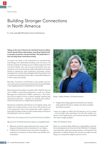NEWS10 CPI %u2013 Concrete Plant International %u2013 5 | 2025 www.cpi-worldwide.comTaking on the role of Director for the North America edition meant representing a demanding, rewarding industry built on people, processes, and partnerships. This publication is how we keep those connections strong.I%u2019ve spent my career at the intersection of manufacturing, technology, and relationship-building. Over the years, I%u2019ve had the privilege of working across multiple segments of the concrete industry: dry cast, precast, prestressed, wet cast, cast stone, and niche specialty markets. My path has included hands-on experience with production processes, project management, and the sales strategies that help plants invest in equipment and systems that make a measurable difference in their output and quality.Recently, I focused on accelerated curing, quality, and process improvements that boost performance and profitability. I value applying technical expertise for real results.My professional foundation includes a BS in Political Science and an MBA in International Business, as well as a Project Management Professional (PMP) certification. That background has taught me how to blend strategic thinking with operational execution %u2014 whether I%u2019m working with multinational manufacturers or independent producers.Beyond my credentials, what drives me is integrity, clarity, and results. Our industry works on trust: trust in the product, trust in the equipment, trust in the people who make it happen. I bring that mindset to both my client relationships and now to this publication and our partners.What You Can Expect from the North America EditionMy vision for the North American edition is straightforward:%u2022 Relevant, practical content tailored to the unique challenges and opportunities of producers in our region.%u2022 A platform for industry voices, from plant managers to engineers to inventors, to share ideas, case studies, and innovations.%u2022 Insights that bridge global trends with local realities, helping North American readers see what%u2019s possible, and what%u2019s practical.I want our pages to reflect the full spectrum of our sector %u2014 not just large-scale operations, but also the smaller producers, niche applications, and inventive solutions that often don%u2019t get enough spotlight.Why This Matters NowWe%u2019re in a moment where efficiency, sustainability, and workforce development are front and center. Whether it%u2019s integrating automation, refining curing processes, or training the next generation of skilled workers, the choices we make now will shape our competitive edge for years to come.Building Stronger Connections in North AmericaDirector%u2019s NoteKristy L. Kieda, Director, CPI North American Kristy L. Kieda, MBA, PMP (she/her); Director, CPi North America