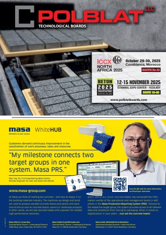 www.polblatboards.comTECHNOLOGICAL BOARDSOctober 29-30, 2025Casablanca, Morocco NORTHAFRICA 2025I.STANBUL EXPO CENTER - YESI.LK%u00d6YBOOTH No 52BOOTH 10-C612-15 NOVEMBER 2025At Masa we think of nothing but concrete %u2013 and how to shape it for the building materials industry. The machines we design and build are used to produce aerated concrete blocks and panels and sandlime bricks as well as concrete blocks, pavers or landscape products. In other words, we are real concrete heads with a passion for reliable, high-performance machines. Bj%u00f6rn, one of our clever concrete heads, has connected the information worlds of the operational and management levels in AAC plants in the Masa Production Reporting System (PRS). Tailored to the respective target group, the system provides access to all relevant data and conditions from mixing to packaging. When it comes to digitalization in your plant %u2013 Just ask the concrete heads!Customers demand continuous improvement in the coordination of work processes, tasks and resources. %u201cMy milestone connects two target groups in one system. Masa PRS.%u201dDipl.-Ing. for Civil Engineering Bj%u00f6rn Gorka,Process Engineer for AAC and Sand-lime BricksScan the QR code for more information and BluePaper downloadMasa GmbH GreyHUB Andernach Concrete Block, Pavers + Landscaping ProductsMasa-Str. 2 | 56626 Andernach | GermanyMasa-USA LLC, Green Bay Concrete Block, Pavers + Landscaping Products2006 Wery Lane | Green Bay, WI 54313 | USAMasa GmbH WhiteHUB Porta WestfalicaAutoclaved Aerated Concrete + Sand-lime BricksOsterkamp 2 | 32457 Porta Westfalica | GermanyAt Masa we think of nothing but concrete %u2013 and how to shape it for Bj%u00f6rn, one of our clever concrete heads, has connected the inforwww.masa-group.comwh-0000026