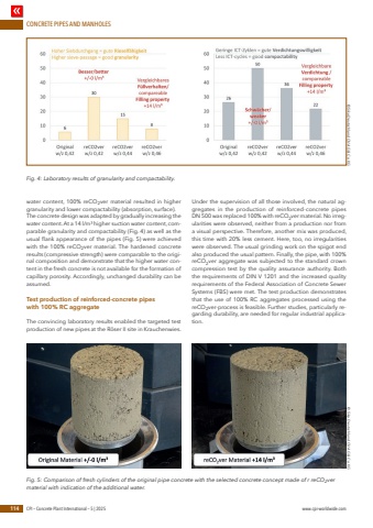CONCRETE PIPES AND MANHOLES114 CPI %u2013 Concrete Plant International %u2013 5 | 2025 www.cpi-worldwide.comwater content, 100% reCO2ver material resulted in higher granularity and lower compactability (absorption, surface).The concrete design was adapted by gradually increasing the water content. At a 14 l/m%u00b3 higher suction water content, comparable granularity and compactability (Fig. 4) as well as the usual flank appearance of the pipes (Fig. 5) were achieved with the 100% reCO2ver material. The hardened concrete results (compressive strength) were comparable to the original composition and demonstrate that the higher water content in the fresh concrete is not available for the formation of capillary porosity. Accordingly, unchanged durability can be assumed.Test production of reinforced-concrete pipes with 100% RC aggregateThe convincing laboratory results enabled the targeted test production of new pipes at the R%u00f6ser II site in Krauchenwies. Under the supervision of all those involved, the natural aggregates in the production of reinforced-concrete pipes DN 500 was replaced 100% with reCO2ver material. No irregularities were observed, neither from a production nor from a visual perspective. Therefore, another mix was produced, this time with 20% less cement. Here, too, no irregularities were observed. The usual grinding work on the spigot end also produced the usual pattern. Finally, the pipe, with 100% reCO2ver aggregate was subjected to the standard crown compression test by the quality assurance authority. Both the requirements of DIN V 1201 and the increased quality requirements of the Federal Association of Concrete Sewer Systems (FBS) were met. The test production demonstrates that the use of 100% RC aggregates processed using the reCO2ver-process is feasible. Further studies, particularly regarding durability, are needed for regular industrial application.Fig. 4: Laboratory results of granularity and compactability.Fig. 5: Comparison of fresh cylinders of the original pipe concrete with the selected concrete concept made of r reCO2ver material with indication of the additional water.%u00a9 Sika Deutschland CH AG & Co KG %u00a9 Sika Deutschland CH AG & Co KG