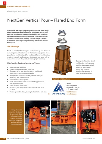 CONCRETE PIPES AND MANHOLES116 CPI %u2013 Concrete Plant International %u2013 5 | 2025 www.cpi-worldwide.comCasting the NextGen flared end forming in the vertical position (patent-pending), allows for quick, easy set-up and strip out, keeping the operator in mind for safe handling. NextGen forming systems provide the same durability as traditional forms while offering a more compact design. In addition, vertical pouring capability maximizes factory floor space.The AdvantageNextGen flared end forming can easily be set-up and stripped out using an overhead crane vs. the traditional, upside-down pour, flared end forming. (The traditional flared end forming requires multiple picks using a fork truck, and sand pile or rubber tires to turn the product in an upright position).With NextGen flared end forming you%u2019ll have:%u2022 Less concrete finishing%u2022 Easier, safer work surface clean up%u2022 Compact, all-in-one forming unit vs traditional, multi-piece components to handle.%u2022 Heavy steel construction designed for strength, durability and performance%u2022 Diameters 12%u201d through 96%u201d%u2022 NextGen roll-back form doors with toggle clamps and alignment pins%u2022 Solid tapered inner core%u2022 Hydraulic jack strip assist sub-base with fork truck pockets%u2022 Throat apron blockout, loosely bolted to the sub-basenNextGen Vertical Pour %u2013 Flared End FormAfinitas, Clayton, MO 63105 USAFURTHER INFORMATIONAfinitas8027 Forsyth BlvdClayton, MO 63105, USAT +1 314 862 8000info@afinitas.comwww.afinitas.comHeavy steel construction designed for strength, durability and performance including hydraulic jack strip assist and Smart Connect system.Casting the NextGen flared end forming in the vertical position (patent-pending), allows for quick, easy set-up and strip out, keeping the operator in mind for safe handling.