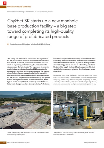 CONCRETE PIPES AND MANHOLES118 CPI %u2013 Concrete Plant International %u2013 5 | 2025 www.cpi-worldwide.comThe Turany site in Slovakia%u2019s Turiec Basin is a key location for the production of manhole components for the Slovakian market. As a result, continuous investment has been made in expanding and improving the production infrastructure over the last decade. The expansion of concrete manhole base production in spring 2025 undoubtedly represents a highlight of this growth strategy. The start-up of the Perfect channel production facility for monolithic concrete manhole bases marks a significant advancement for the product range in terms of both quantity and quality. Before making this landmark investment decision, Adam %u0141y%u015b, co-owner of Chy%u017ebet SK, personally consulted manufacturers in Europe who have been producing Perfect manhole bases very successfully for many years. When it came to working with Schl%u00fcsselbauer, he was not just interested in short-term benefits in terms of product strategy and the manufacturing process, but also in establishing a sustainably beneficial supply chain and forging a partnership that would help his company to further develop its own range of services.For several years now, the Perfect manhole system has been the focus of strategic development at the family-owned company, particularly at the Turany site. Beginning in 2009, Adam %u0141y%u015b established a production facility for paving stones, manhole components, and precast concrete parts in sevChy%u017ebet SK starts up a new manhole base production facility %u2013 a big step toward completing its high-quality range of prefabricated products Schl%u00fcsselbauer Technology GmbH & Co KG, 4673 Gaspoltshofen, Austrian Christian Weinberger, Schl%u00fcsselbauer Technology GmbH & Co KG, AustriaSince the property was acquired in 2009, the site has been continuously developed. The plant for manufacturing the channel negative moulds consists of five hot wire saws.%u00a9 Chy%u017ebet SK