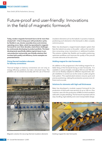 PRECAST CONCRETE ELEMENTS136 CPI %u2013 Concrete Plant International %u2013 5 | 2025 www.cpi-worldwide.comToday, modern magnetic formwork has to do far more than simply hold %u2013 it has to keep pace with production cycles, be flexible in use, shorten assembly times and minimise operating errors. Ratec, which has specialised in magnetic formwork for over three decades, meets these challenges by continuously developing its product portfolio. The latest developments specifically address typical issues in precast production and provide user-friendly solutions that increase both quality and efficiency. Some examples are presented below.Fixing thermal insulation elements for balcony connectionsThermal bridges at balcony connections are not only an energy-efficiency problem, but also a structural issue. This problem can be solved structurally with the use of thermal insulation elements such as the Isokorb. In practice, however, positioning such elements in the formwork is often complex and error-prone.Ratec has developed a magnet-based adapter system that fixes the Isokorb securely on the pallet - without the need for time-consuming screw connections or additional brackets. This solution enables fast, flexible and reusable positioning, optimises workflows and improves the quality of the precast concrete elements at the same time.Holding magnet for stair formworksAn addition to the programme is the holding magnet for reliable fixing of the formwork facing on stair formworks. It is available in various heights, including 150 mm and 180 mm, and can be flexibly adapted to different requirements. Simple installation is carried out via the screw-on plate using the hole pattern. This sophisticated solution ensures quick and precise positioning, making the production process more efficient and accurate.Solutions for elements with high wall thicknessesRatec has developed a modular support formwork for the production of thick wall cross-sections of up to 120 cm. One customer uses it for the production of 840 mm thick sandwich walls with complex detailing. The formwork impresses with its easy handling, high stability and crane-transportable design. Future-proof and user-friendly: Innovations in the field of magnetic formworkRatec GmbH, 68766 Hockenheim, GermanyMagnetic solution for securing thermal insulation elements Holding magnet for stair formworks