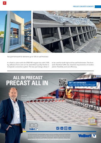 PRECAST CONCRETE ELEMENTSwww.cpi-worldwide.com CPI %u2013 Concrete Plant International %u2013 5 | 2025 137360%u00b0 LIVE EXPERIENCE: Login now for the World of Precast! ALL IN PRECASTPRECAST ALL INAs internationally acknowledged expert we are providing customized machineryand plant engineering solutions for state-of-the-art precast concrete production.Everything you need for a profitable investment. Made in Germany. Since 1925.www.vollert.de | precast@vollert.de | www.youtube.com/vollertprecastDana HookExecutive Sales DirectorNorth AmericaIt is fixed in place with the SPB2100 magnet box with 2100 kg adhesive force and can be assembled quickly thanks to its keyhole connection system. The two-part design allows it to be used for both high and low wall thicknesses. This formwork therefore fulfils two essential requirements of modern plants: Flexibility and cost efficiency.Two-part formwork for elements up to 120 cm wall thickness