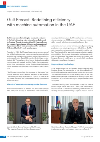 PRECAST CONCRETE ELEMENTS146 CPI %u2013 Concrete Plant International %u2013 5 | 2025 www.cpi-worldwide.comGulf Precast is revolutionizing the construction industry in the UAE with cutting-edge automation and advanced technology. Through its partnership with Progress Group, the company has enhanced efficiency, and elevated quality standards of their mesh production with a brand-new M-System BlueMesh%u00ae mesh welding plant. Founded in 1984, Gulf Precast has grown to become one of the UAE%u2019s leading precast concrete manufacturers, playing a pivotal role in shaping the region%u2019s skyline. With landmark projects such as the Dubai Mall and Abu Dhabi Airport under its belt, Gulf Precast has evolved from a single plant to a big market name with multiple facilities. Today, the company operates three precast plants in Abu Dhabi and two facilities in Dubai, including one dedicated to hollow-core slab production.%u201cGulf Precast is one of the first precaster in the region,%u201d explained Valentijn Blonk, General Manager of Gulf Precast. %u201cWe have significantly expanded our capacity to meet growing market demands and have invested heavily in innovation and automation.%u201dThe role of automation in meeting market demandsThe construction sector in the UAE has rebounded strongly after 2020, with a surge in demand for villa construction, schools, and infrastructure. Gulf Precast has risen to the occasion, producing over 1,000 cubic meters of precast concrete daily - enough to build and erect eight villas per day.Automation has been central to this success. By streamlining production and reducing reliance on skilled labor, Gulf Precast ensures it remains competitive in a rapidly evolving market. %u201cWe always look for ways to improve productivity, quality, and reliability,%u201d Blonk noted. %u201cAutomation has become the future of the industry. The newest machinery we bought from Progress Group is enabling us to maintain high standards while addressing labor shortages.%u201dProgress Group%u2019s technologyA key driver of Gulf Precast%u2019s success is its partnership with Progress Group. The introduction of a M-System BlueMesh%u00ae mesh welding plant has revolutionized production processes. This highly automated machine is working from coil and integrates panel openings automatically according to plan. Furthermore, it reduces waste and significantly enhances quality and speed.%u201cThe mesh welding plant from Progress Group has been a game-changer for us,%u201d said Blonk. %u201cIt%u2019s not just about reducing labor hours; it%u2019s also about minimizing material waste, increasing accuracy, and delivering a superior product. Even in Gulf Precast: Redefining efficiency with machine automation in the UAEProgress Maschinen & Automation AG, 39042 Brixen, ItalyValentijn Blonk, General Manager of Gulf Precast: %u201cOur expanded capacity is driven by automation.%u201dWalid Aoun, Senior Factories Manager: %u201cWith the automation in place we can plan and produce much more efficiently .%u201d