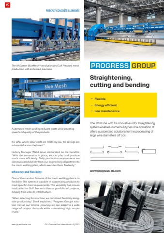 PRECAST CONCRETE ELEMENTSwww.cpi-worldwide.com CPI %u2013 Concrete Plant International %u2013 5 | 2025the UAE, where labor costs are relatively low, the savings are substantial across the board.%u201dFactory Manager Walid Aoun elaborated on the benefits: %u201cWith the automation in place, we can plan and produce much more efficiently. Daily production requirements are communicated directly from our engineering department to the mesh welding plant, which executes them flawlessly.%u201dEfficiency and flexibility One of the standout features of the mesh welding plant is its flexibility. The system is capable of customizing products to meet specific client requirements. This versatility has proven invaluable for Gulf Precast%u2019s diverse portfolio of projects, ranging from villas to infrastructure.%u201cWhen selecting this machine, we prioritized flexibility alongside productivity,%u201d Blonk explained. %u201cProgress Group%u2019s solution met all our criteria, ensuring we can adapt to a wide range of project demands while maintaining high output levels.%u201dThe M-System BlueMesh%u00ae revolutionizes Gulf Precast%u2019s mesh production with enhanced precision.Automated mesh welding reduces waste while boosting speed and quality of the products. Straightening, cutting and bending%u02db Flexible%u02db Energy efficient%u02db Low maintenancewww.progress-m.comThe MSR line with its innovative rotor straightening system enables numerous types of automation. It offers customized solutions for the processing of large wire diameters off coil.