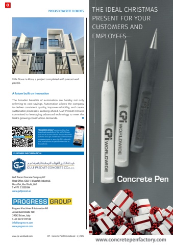 PRECAST CONCRETE ELEMENTSwww.cpi-worldwide.com CPI %u2013 Concrete Plant International %u2013 5 | 2025A future built on innovationThe broader benefits of automation are hereby not only referring to cost savings. Automation allows the company to deliver consistent quality, improve reliability, and create sustainable processes. Looking ahead, Gulf Precast remains committed to leveraging advanced technology to meet the UAE%u2019s growing construction demands. nVilla Nova La Rosa, a project completed with precast wall panels.FURTHER INFORMATIONGulf Precast Concrete Company LLCHead Office, ICAD-1, Musaffah Industrial,Musaffah, Abu Dhabi, UAET +971 2 5502044www.gulfprecast.aeProgress Maschinen & Automation AG Julius-Durst-Stra%u00dfe 10039042 Brixen, ItalyT+39 0472 979100 info@progress-m.com www.progress-m.comPROGRESS GROUP sponsored the free download possibility of the pdf of this article for all readers of CPI. Please check the website www.cpi-worldwide.com/channels/progress-group or scan the QR code with your smartphone to get direct access to this website.THE IDEAL CHRISTMASPRESENT FOR YOUR CUSTOMERS AND EMPLOYEESwww.concretepenfactory.comConcrete Pen