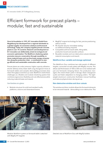PRECAST CONCRETE ELEMENTS150 CPI %u2013 Concrete Plant International %u2013 5 | 2025 www.cpi-worldwide.comSince its foundation in 1991, B.T. innovation GmbH from Magdeburg has developed from a regional wholesaler to a global supplier of connection solutions and formwork technology. Today, the company supplies precast concrete plants in over 70 countries. Research and development at B.T. innovation are deliberately aimed at ecological and economic optimisation: The MultiForm shuttering system promotes resource conservation through reusability, reduces material losses and can thus lower energy consumption along the production chain - a contribution to energy-efficient and sustainable construction with concrete.Precast plants are under pressure: higher capacity utilisation, shorter delivery times, fewer staff. Long changeover times at formwork tables and complex demoulding processes slow down throughput and drive up costs. MultiForm meets these challenges as a flexible and modular shuttering system that combines ergonomics, flexibility and cost-effectiveness while reducing material losses and rework.Core functions at a glance%u2022 Modular structure for solid and sandwich walls, platforms, columns and downstand beams%u2022 MagFly%u00ae magnet technology for fast, precise positioning without screws%u2022 PE chamfer strip for immediate sealing - no additional sealing required%u2022 Compatible with formwork table, tilting table, production board and wooden surfaces%u2022 Reusable modules and non-destructive cutouts minimise material consumption and reworkMultiForm Duo: variable and storage-optimisedThe MultiForm Duo combines two side panels of different heights, connected via web plates with MagFly mounts. This allows wall thicknesses of 100 to 350 mm to be realised with just one formwork clamping fixture. For production managers, this means fewer parts in storage, fewer changeover cycles and faster adaptation to changing orders. The lightweight aluminium construction facilitates manual handling and reduces physical strain during set-up.Non-destructive window and door cutoutsThe window and door module allows the formwork elements to be removed inwards - demoulding is non-destructive. This Efficient formwork for precast plants %u2013 modular, fast and sustainableB.T. innovation GmbH, 39116 Magdeburg, GermanyModular MultiForm system on formwork table is attached with MagFly AP magnetsDetailed view of MultiForm Duo with MagFly holders