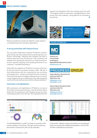 PRECAST CONCRETE ELEMENTS160 CPI %u2013 Concrete Plant International %u2013 5 | 2025 www.cpi-worldwide.comA strong partnership with Progress GroupThe successful collaboration between FP McCann and Progress Group has been instrumental in advancing their production technology. %u201cWorking with Progress has been a positive experience over the last years. Their machinery and software have significantly enhanced our reinforcement production capacity, adapting to the growing demands of our customers,%u201d remarked David Norry. Adam McCann, Engineer at FP McCann and part of the family that has built the successful company, adds, %u201cWe like to build relationships with the companies we buy machinery and software from %u2013 we like to work with them for a long time. That would have been the biggest selling point for me, and of course, Progress Group is a well-known name. We bought the machine first and now have seen that the software elevates it.%u201d Automation and digitalisationWith automation and digitalisation, FP McCann can stay at the forefront of precast production in the UK. Andrew Slaven states that the experience with Progress Group has been consistently positive since the start. He emphasised that the support and integration within the company work very well. %u201cThe biggest benefit of automation and digitalisation is time saving, more than anything %u2013 being efficient as a business is the priority.%u201d nFURTHER INFORMATIONFP McCann Ltd3 Drumard RoadKnockloughrimMagherafelt BT45 8QA, Northern Irelandwww.fpmccann.co.ukProgress Maschinen & Automation AGJulius-Durst-Stra%u00dfe 10039042 Brixen, Italyinfo@progress-m.comwww.progress-m.comProgress Software Development GmbHJulius-Durst-Stra%u00dfe 10039042 Brixen, Italyinfo@progress-psd.comwww.progress-psd.comPROGRESS GROUP sponsored the free download possibility of the pdf of this article for all readers of CPI. Please check the website www.cpi-worldwide.com/channels/progress-group or scan the QR code with your smartphone to get direct access to this website.Precast concrete box culverts are ideal for a wide variety of civil engineering and construction applications.The WorkloadProfiler in profitYC provides an overview of the current utilisation of machines. Through machine learning, the duration of production jobs can be predicted. In the profitYC software, cages and meshes can be designed easily and quickly with predefined templates in 2D and 3D, and then scheduled for production.
