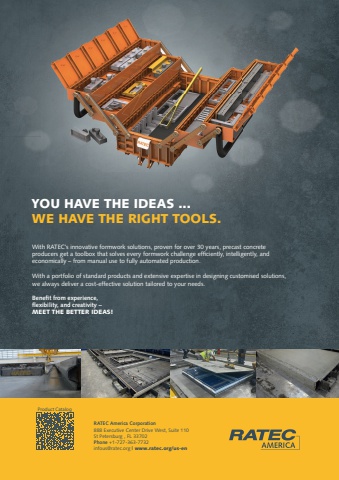 RATEC America Corporation888 Executive Center Drive West, Suite 110St Petersburg , FL 33702Phone +1-727-363-7732infous@ratec.org | www.ratec.org/us-enProduct CatalogWith RATEC%u2019s innovative formwork solutions, proven for over 30 years, precast concrete producers get a toolbox that solves every formwork challenge effi ciently, intelligently, and economically %u2013 from manual use to fully automated production.With a portfolio of standard products and extensive expertise in designing customised solutions, we always deliver a cost-effective solution tailored to your needs.Benefi t from experience,fl exibility, and creativity %u2013MEET THE BETTER IDEAS!YOU HAVE THE IDEAS ...WE HAVE THE RIGHT TOOLS.