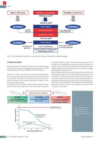 NEWS24 CPI %u2013 Concrete Plant International %u2013 5 | 2025 www.cpi-worldwide.com3) Performance sellingFrom the portfolio of products to the product-market strategy and product sales, the PSA approach strictly adheres to the three questions: 'Where?', 'What?' and 'How?' (Fig. 6).While the \tion-oriented segmentation and parameter identification of the products according to CPTS, the participants must practise the principle of so-called \third part of the training.According to Fig. 7, the argumentation about product parameters should in principle have no or only limited prospects of success. Under normal conditions, the only way to sell is through price. Highlighting improved product features can also be counterproductive, as experienced buyers will raise a wide range of concerns and objections during the lengthy tendering process (see Fig. 7).The principle of 'performance selling' involves more than just offering advantages. This involves solely the generation and visualisation of potential benefits that serve the customer's striving for economic effects and competitive advantages, or guarantee their particular need for security. Participants on this course must understand this difference and adapt their approach to meet the needs of customers throughout their company's value chain.Fig. 6: From the product portfolio via the product-market- to the sales-marketing strategyFig. 7: The sales process: the interaction of product features, advantages and customer benefits%u0007%u0013%u0015%u0017%u000f%u0013%u0012%u0011%u0013%u0001%u0013%u000f%u0001%u0014%u0015%u0013%u0018%u000c%u0017%u0016%u0009%u0010%u000e%u0001%u0007%u0003%u0006%u0003%u0008%u0009%u0010%u000e%u0001%u0008%u0003%u0006%u0003%u0008%u000f%u0018&fl ffl%u001a%u0001%u0011%u0016%u0013%u0013%u0012fl%u0012%u0019ffl%u0016%u000fffl%u0012 %u0012
