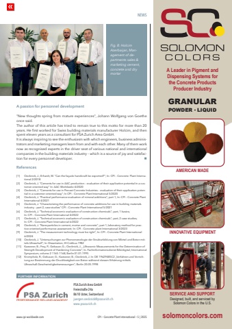 NEWSwww.cpi-worldwide.com CPI %u2013 Concrete Plant International %u2013 5 | 2025A passion for personnel development \w thoughts spring from mature experiences\once said.The author of this article has tried to remain true to this motto for more than 20 years. He first worked for Swiss building materials manufacturer Holcim, and then spent eleven years as a consultant for PSA Zurich Area GmbH.It is always inspiring to see the enthusiasm with which engineers, business administrators and marketing managers learn from and with each other. Many of them work now as recognised experts in the driver seat of various national and international companies in the building materials industry %u2013 which is a source of joy and satisfaction for every personnel developer. nReferences[1] Oecknick, J.; Erhardt, M. %u201cCan the fa%u00e7ade handicraft be exported?%u201d; In: CPI %u2013 Concrete Plant International 2/2018[2] Oecknick, J. %u201cCements for use in AAC production %u2013 evaluation of their application potential in a customer-oriented way%u201d In: AAC Worldwide 4/2020[3] Oecknick, J. %u201cCements for use in Precast Concrete Industries %u2013 evaluation of their application potential in a customer-oriented way%u201d; In CPI %u2013 Concrete Plant International 5/2020[4] Oecknick, J. %u201cPractical performance evaluation of mineral additions%u201d; part 1; In: CPI %u2013 Concrete Plant International 4/2021[5] Oecknick, J. %u201cCharacterizing the performance of concrete additions for use in building materials industry %u2013 part 2, case studies%u201d CPI %u2013 Concrete Plant International 5/2021[6] Oecknick, J. %u201cTechnical-economic evaluation of construction chemicals%u201d; part, 1 basics; In: CPI %u2013 Concrete Plant International 4/2022[7] Oecknick, J. %u201cTechnical-economic evaluation of construction chemicals%u201d; part, 2 case studies; In: CPI %u2013 Concrete Plant International 6/2022[8] Oecknick, J. %u201cNanoparticles in cement, mortar and concrete%u201d; part 1, laboratory method for practice-oriented performance assessment; In: CPI %u2013 Concrete plant International 3/2023[9] Oecknick, J. %u201cThe measurement technology must be right%u201d; In: CPI %u2013 Concrete Plant International 6/2024[10] Oecknick, J. %u201cUntersuchungen zur Phenomenologie der Strukturbildung von M%u00f6rtel und Beton mittels Ultraschall%u201c; In: Dissertation, IH Cottbus 1982 [11] Kaessner, B.; Frey, P.; Gebauer, G.; Oecknick, J., %u201eUltrasonic Measurements for the Determination of Strength Development of Hardening Concrete%u201d; In. Fachinformationsdienst BAUdigital, International Symposium, volume 2 1165-1168, Berlin 01.01.1995 [12] Krompholz, R.; Gebauer, G.; Kaessner, B.; Oecknick, J. In: DE 19629485C2 %u201eVerfahren und Vorrichtung zur Bestimmung der Druckfestigkeit von Beton w%u00e4hrend dessen Erh%u00e4rtung mittels Ultraschall-Geschwindigkeitsmessungen%u201c; Berlin 20.05.1998 FURTHER INFORMATIONPSA Zurich Area GmbHFreiestra%u00dfe 24a8610 Uster, Switzerlandjuergen.oecknick@psazurich.chwww.psazurich.chFig. 8: Holcim Azerbaijan, Management of departments sales & marketing cement, concrete and dry mortarsolomoncolors.comGRANULARPOWDER %u25aa LIQUIDINNOVATIVE EQUIPMENTA Leader in Pigment and Dispensing Systems for the Concrete Products Producer IndustrySERVICE AND SUPPORTDesigned, built, and serviced by Solomon Colors in the U.S.AMERICAN MADE