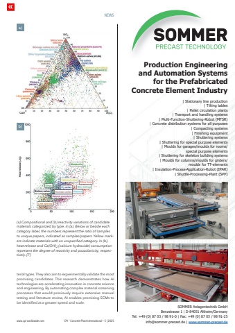 NEWSwww.cpi-worldwide.com CPI %u2013 Concrete Plant International %u2013 5 | 2025terial types. They also aim to experimentally validate the most promising candidates. This research demonstrates how AI technologies are accelerating innovation in concrete science and engineering. By automating complex material screening processes that would previously require extensive manual testing and literature review, AI enables promising SCMs to be identified at a greater speed and scale. (a) Compositional and (b) reactivity variations of candidate materials categorized by type. In (a), Below or beside each category label, the numbers represent the ratio of samples to unique papers, indicated as samples/papers. Yellow markers indicate materials with an unspecified category. In (b), heat release and Ca(OH)2 (calcium hydroxide) consumption represent the degree of reactivity and pozzolanicity, respectively. [7]a)b)SOMMER Anlagentechnik GmbHBenzstrasse 1 | D-84051 Altheim/GermanyTel: +49 (0) 87 03 / 98 91-0 | Fax: +49 (0) 87 03 / 98 91-25info@sommer-precast.de | www.sommer-precast.de| Stationary line production| Tilting tables| Pallet circulation plants| Transport and handling systems| Multi-Function-Shuttering-Robot (MFSR)| Concrete distribution systems for all purposes| Compacting systems| Finishing equipment| Shuttering systems| Shuttering for special purpose elements| Moulds for garages/moulds for rooms/special purpose elements| Shuttering for skeleton building systems| Moulds for columns/moulds for girders/moulds for TT-elements| Insulation-Process-Application-Robot (IPAR)| Shuttle-Processing-Plant (SPP)Production Engineering and Automation Systems for the Prefabricated Concrete Element Industry