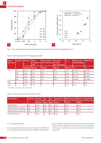 CONCRETE TECHNOLOGY38 CPI %u2013 Concrete Plant International %u2013 5 | 2025 www.cpi-worldwide.com2.2%u0009 Cementitious bindersFour types of cement were used as binders (Z1 = CEM I 42.5 R; Z2 = CEM II/A-M (V-LL) 42.5 R; Z3 = CEM II/C-M (S-LL) 42.5 N; Z4 = CEM III/A 42.5 N). The key properties are summarized in Table 2. The mineralogical compositions are not presented in this paper, as the focus is on the resulting fresh concrete properties.Fig. 1: Grain size distributions (a) and particle shape parameters (b) of the fine aggregates used.a) b)Table 1: Physical properties of the aggregates used. Aggregate typeNotation Density Water absorption 24hFines content (d %u2264 0.125 mm)Fine sand content (d %u2264 0.25 mm)Vw,s Shape index1)(width/length)Sphericity1)[kg/dm%u00b3] [M.-%] [M.-%] [M.-%] [Vol.-%] [%u2013] [%u2013]0/2 S1 2.65 0.78 1.0 8.4 19.2 0.7120 0.9333S2 2.64 0.47 0.8 13.4 16.6 0.7118 0.9219S3 2.69 0.16 0.3 8.6 13.8 0.7273 0.9413S4 2.63 0.52 1.6 28.6 21.5 0.6978 0.91882/8 %u2013 2.58 2.19 %u2013 %u2013 11.3 n.b. n.b.8/16 %u2013 2.57 1.79 %u2013 %u2013 6.5 n.b. n.b.1) The values are shown at d50 (see Fig. 1b). Table 2: Physical properties of the cements used.Cement type Notation Density d10 d50 Setting time Water demand Compr. Strength, 28d[kg/dm%u00b3] [%u00b5m] [%u00b5m] [min.] [M.-%] [MPa]CEM I 42,5 R Z1 3.09 1.0 8.4 115 29.6 56.7CEM II/A-M (V-LL) 42,5 R Z2 3.04 0.8 13.4 110 26.7 53.3CEM II/C-M (S-LL) 42,5 N Z3 3.05 0.3 8.6 160 32.6 54.9CEM III/A 42,5 N Z4 3.02 1.6 28.6 140 29.2 55.5