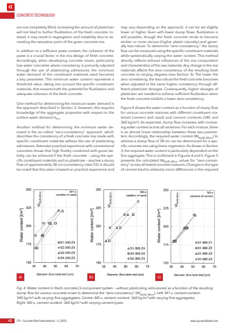 CONCRETE TECHNOLOGY42 CPI %u2013 Concrete Plant International %u2013 5 | 2025 www.cpi-worldwide.comare not completely filled, increasing the amount of plasticizer will not lead to further fluidization of the fresh concrete. Instead, it may result in segregation and instability due to exceeding the saturation point of the given concrete mix.In addition to a sufficient paste content, the cohesion of the paste is a crucial factor in the mix design of fresh concrete. Accordingly, when developing concrete mixes, particularly low-water concretes where consistency is primarily adjusted through the use of plasticizing admixtures, the minimum water demand of the constituent materials used becomes a key parameter. This minimum water content represents a threshold value, taking into account the specific constituent materials, that ensures both the potential for fluidization and adequate cohesion of the fresh concrete.One method for determining the minimum water demand is the approach described in Section 3. However, this requires knowledge of the aggregate properties with respect to the surface water demand Vw,s. Another method for determining the minimum water demand is the so-called \describes the consistency of a fresh concrete mix made with specific constituent materials without the use of plasticizing admixtures. Extensive practical experience with conventional concretes shows that high fluidity combined with good stability can be achieved if the fresh concrete %u2013 using the specific constituent materials and no plasticizer %u2013 reaches a slump flow of approximately 38 cm (consistency class F2). It should be noted that this value is based on practical experience and may vary depending on the approach; it can be set slightly lower or higher. Even with lower slump flows, fluidization is still possible, though the fresh concrete tends to become stickier or more viscous (higher plastic viscosity) and generally less robust. To determine \flow can be measured using the specific constituent materials while systematically varying the water content. This method directly reflects relevant influences of the mix composition and characteristics of the raw materials. Any change in the raw materials affects the zero-consistency of the resulting fresh concrete to varying degrees (see Section 3). The lower the zero-consistency, the less robust the fresh concrete becomes when adjusted to the same higher consistency through different plasticizer dosages. Consequently, higher dosages of plasticizer are needed to achieve sufficient fluidization when the fresh concrete exhibits a lower zero-consistency.Figure 4 shows the water content as a function of slump flow for various concrete mixtures with different constituent materials (cement and sand) and cement contents (340 and 360 kg/m%u00b3). As expected, slump flow increases with increasing water content across all variations. For each mixture, there is an almost linear relationship between these two parameters. Accordingly, the required water content (WNullk,38cm) to achieve a slump flow of 38 cm can be determined for a specific concrete mix using linear regression. As shown in Section 3, the required water content is particularly dependent on the fine aggregate. This is confirmed in Figures 4 and 5. Figure 5 presents the calculated WNullk,38cm values for %u201czero-consistency%u201d across all tested concrete mixtures. Changes in the type of cement lead to relatively minor differences in the required Fig. 4: Water content in fresh concrete (3-component system %u2013 without plasticizing admixtures) as a function of the resulting slump flow for various concrete mixes to determine the %u201czero-consistency%u201d (WNullk,38cm). Left: M1-x, cement content: 340 kg/m%u00b3 with varying fine aggregates; Centre: M2-x, cement content: 360 kg/m%u00b3 with varying fine aggregates; Right: M2-x, cement content: 360 kg/m%u00b3 with varying cement types.a) b) c)