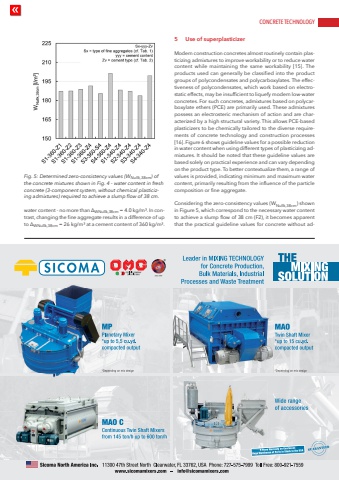 CONCRETE TECHNOLOGYwww.cpi-worldwide.com CPI %u2013 Concrete Plant International %u2013 5 | 2025 43water content - no more than %u0394WNullk,38cm = 4.0 kg/m%u00b3. In contrast, changing the fine aggregate results in a difference of up to %u0394WNullk,38cm = 26 kg/m%u00b3 at a cement content of 360 kg/m%u00b3.5 Use of superplasticizerModern construction concretes almost routinely contain plasticizing admixtures to improve workability or to reduce water content while maintaining the same workability [15]. The products used can generally be classified into the product groups of polycondensates and polycarboxylates. The effectiveness of polycondensates, which work based on electrostatic effects, may be insufficient to liquefy modern low-water concretes. For such concretes, admixtures based on polycarboxylate ethers (PCE) are primarily used. These admixtures possess an electrosteric mechanism of action and are characterized by a high structural variety. This allows PCE-based plasticizers to be chemically tailored to the diverse requirements of concrete technology and construction processes [16]. Figure 6 shows guideline values for a possible reduction in water content when using different types of plasticizing admixtures. It should be noted that these guideline values are based solely on practical experience and can vary depending on the product type. To better contextualize them, a range of values is provided, indicating minimum and maximum water content, primarily resulting from the influence of the particle composition or fine aggregate.Considering the zero-consistency values (WNullk,38cm) shown in Figure 5, which correspond to the necessary water content to achieve a slump flow of 38 cm (F2), it becomes apparent that the practical guideline values for concrete without adFig. 5: Determined zero-consistency values (WNullk,38cm) of the concrete mixtures shown in Fig. 4 - water content in fresh concrete (3-component system, without chemical plasticizing admixtures) required to achieve a slump flow of 38 cm.