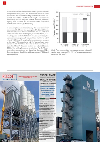 CONCRETE TECHNOLOGYwww.cpi-worldwide.com CPI %u2013 Concrete Plant International %u2013 5 | 2025 45minimum achievable water content for the specific concrete compositions. In Figure 7, the determined minimum water contents for the use of different types of admixtures are presented. It should be noted that reducing the water content also directly reduces the paste content. Therefore, when designing fresh concrete, this reduction must be considered and adjusted accordingly if necessary.In an exemplary experimental study, the water content of concretes with different fine aggregates (S1, S3, and S4) was systematically varied. The initial concrete mix was produced with a cement content of 360 kg/m%u00b3, a w/c ratio of 0.49, and a resulting paste content of 295 l/m%u00b3. In subsequent steps, the water content was gradually reduced from 176 l/m%u00b3 to 162 l/m%u00b3 and 146 l/m%u00b3, while keeping the cement content constant at 360 kg/m%u00b3. This reduction to 162 l/m%u00b3 led to a lower paste content of 280 l/m%u00b3. When the water content was further reduced to 146 l/m%u00b3, the paste content was adjusted back to 280 l/m%u00b3 by adding limestone powder (see Fig. 8). All concrete mixes were adjusted to a slump flow diameter of 52 %u00b1 3 cm (consistency class F4) by adding a standard PCE-based superplasticizer.Fig. 8: Paste content of the investigated concrete mixes with varying water content (176 - 147 l/m%u00b3) at a constant cement content of 360 kg/m%u00b3.1 RECEPTION HOPPER4 HOPPERS OF 70 MC / EACH FOR A TOTAL OF 280 MC8 HOPPERS OF 35 MC / EACH FOR A TOTAL OF 280 MC1 LOADING SYSTEM WITH BUCKET ELEVATOR FOR HOPPERS3 CEMENT SILOS OF 80 TON EACH2 PLANETARY MIXERS MPR SERY HIGH PERFORMANCE 3000/2000 LTMIXER AUTOMATIC WASHING SYSTEM1 AGGREGATE MOBILE WEIGHING BUCKET2 CEMENT SCALES2 WATER SCALES2 ADMIXTURE SCALESCONTROL PANEL IN PROTECTION CABINCAMERAS VIDEO CONTROL1 DIRTY WATER DOSER1 DIRTY WATER TREATMENT SYSTEMAUTOCLAVE WATER SYSTEM WITH STORAGE TANKEXCELLENCEIN CONCRETE BATCHING PLANTSTAILOR MADE BATCHING PLANTSTURNKEY SOLUTIONSTOWER CONCRETE BATCHING PLANT TK TYPE FOR A HIGH PRODUCTION OF QUALITY CONCRETE FOR THE PRODUCTION OF PRECAST ELEMENTSCMYCMMYCY CMYKRocchi logo allargato.pdf 1 11/03/19 17:24