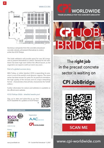 WWW.ICCX.ORGwww.cpi-worldwide.com CPI %u2013 Concrete Plant International %u2013 5 | 2025FURTHER INFORMATIONwww.iccx.orgT%u00dcRKIYE2026PartnerOrganisationThe trade exhibition will provide space for over 60 companies to present themselves to visitors. Demand for the exhibition has been high even before the official launch, so the organisers can expect a sold-out event very soon.Part of a global success storyWith Turkey, or rather Istanbul, ICCX is expanding its presence in one of the world%u2019s most dynamic regions. The event series has been known for years for its practical orientation, the high quality of the lectures and its unique networking format - characteristics that will also characterise the Turkish edition.Further information for visitors and exhibitors is available on the official event website.ICCX T%u00fcrkiye 2026 %u2013 Istanbul awaits you!Stay up to date and subscribe to our free ICCX newsletter for updates on ICCX T%u00fcrkiye.nNumerous companies from the concrete and precast concrete industry will present themselves to visitors at the first ICCX T%u00fcrkiye.www.cpi-worldwide.comThe right job in the precast concrete sector is waiting on SCAN MECPI JobBridgeJOBBRIDGE