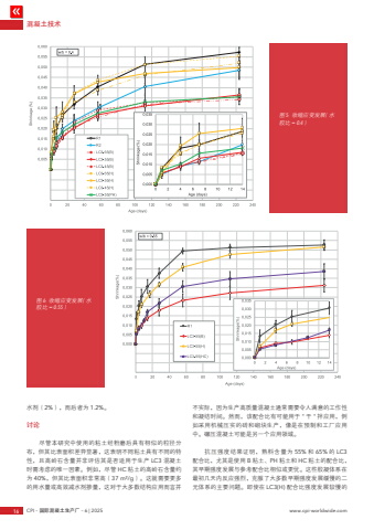 16 CPI %u2013 %u56fd%u9645%u6df7%u51dd%u571f%u751f%u4ea7%u5382 %u2013 6 | 2025 www.cpi-worldwide.com%u6df7%u51dd%u571f%u6280%u672f%u56fe5%uff1a%u6536%u7f29%u5e94%u53d8%u53d1%u5c55%uff08%u6c34%u80f6%u6bd4 = 0.4%uff09%u56fe6%uff1a%u6536%u7f29%u5e94%u53d8%u53d1%u5c55%uff08%u6c34%u80f6%u6bd4 = 0.55%uff09%u6c34%u5242%uff082%%uff09%uff0c%u800c%u540e%u8005%u4e3a 1.2%%u3002%u8ba8%u8bba%u5c3d%u7ba1%u672c%u7814%u7a76%u4e2d%u4f7f%u7528%u7684%u7c98%u571f%u7ecf%u7c89%u78e8%u540e%u5177%u6709%u76f8%u4f3c%u7684%u7c92%u5f84%u5206%u5e03%uff0c%u4f46%u5176%u6bd4%u8868%u9762%u79ef%u5dee%u5f02%u663e%u8457%uff0c%u8fd9%u8868%u660e%u4e0d%u540c%u7c98%u571f%u5177%u6709%u4e0d%u540c%u7684%u7279%u6027%uff0c%u4e14%u9ad8%u5cad%u77f3%u542b%u91cf%u5e76%u975e%u8bc4%u4f30%u5176%u662f%u5426%u9002%u7528%u4e8e%u751f%u4ea7 LC3 %u6df7%u51dd%u571f%u65f6%u9700%u8003%u8651%u7684%u552f%u4e00%u56e0%u7d20%u3002%u4f8b%u5982%uff0c%u5c3d%u7ba1 HC %u7c98%u571f%u7684%u9ad8%u5cad%u77f3%u542b%u91cf%u7ea6%u4e3a 40%%uff0c%u4f46%u5176%u6bd4%u8868%u9762%u79ef%u975e%u5e38%u9ad8%uff0837 m%u00b2/g%uff09%u3002%u8fd9%u5c31%u9700%u8981%u66f4%u591a%u7684%u7528%u6c34%u91cf%u6216%u9ad8%u6548%u51cf%u6c34%u5242%u63ba%u91cf%uff0c%u8fd9%u5bf9%u4e8e%u5927%u591a%u6570%u7ed3%u6784%u5e94%u7528%u800c%u8a00%u5e76%u4e0d%u5b9e%u9645%uff0c%u56e0%u4e3a%u751f%u4ea7%u9ad8%u8d28%u91cf%u6df7%u51dd%u571f%u901a%u5e38%u9700%u8981%u4ee4%u4eba%u6ee1%u610f%u7684%u5de5%u4f5c%u6027%u548c%u51dd%u7ed3%u65f6%u95f4%u3002%u7136%u800c%uff0c%u8be5%u914d%u5408%u6bd4%u6709%u53ef%u80fd%u7528%u4e8e \%u5982%u91c7%u7528%u673a%u68b0%u538b%u5b9e%u7684%u7816%u548c%u780c%u5757%u751f%u4ea7%uff0c%u50cf%u662f%u5728%u9884%u5236%u548c%u5de5%u5382%u5e94%u7528%u4e2d%u3002%u78be%u538b%u6df7%u51dd%u571f%u53ef%u80fd%u662f%u53e6%u4e00%u4e2a%u5e94%u7528%u9886%u57df%u3002%u6297%u538b%u5f3a%u5ea6%u7ed3%u679c%u8bc1%u660e%uff0c%u719f%u6599%u542b%u91cf%u4e3a 55% %u548c 65% %u7684 LC3%u914d%u5408%u6bd4%uff0c%u5c24%u5176%u662f%u4f7f%u7528 B %u7c98%u571f%u3001PH %u7c98%u571f%u548c HC %u7c98%u571f%u7684%u914d%u5408%u6bd4%uff0c%u5176%u65e9%u671f%u5f3a%u5ea6%u53d1%u5c55%u4e0e%u53c2%u8003%u914d%u5408%u6bd4%u76f8%u4f3c%u6216%u66f4%u4f18%u3002%u8fd9%u4e9b%u80f6%u51dd%u4f53%u7cfb%u5728%u6700%u521d%u51e0%u5929%u5185%u53cd%u5e94%u5f3a%u70c8%uff0c%u514b%u670d%u4e86%u5927%u591a%u6570%u65e9%u671f%u5f3a%u5ea6%u53d1%u5c55%u7f13%u6162%u7684%u4e8c%u5143%u4f53%u7cfb%u7684%u4e3b%u8981%u95ee%u9898%u3002%u5373%u4f7f%u5728 LC3(H) %u914d%u5408%u6bd4%u5f3a%u5ea6%u53d1%u5c55%u8f83%u6162%u7684