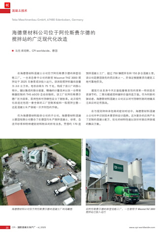 %u00a9Heidelberg Materials %u6df7%u51dd%u571f%u6280%u672f20 CPI %u2013 %u56fd%u9645%u6df7%u51dd%u571f%u751f%u4ea7%u5382 %u2013 6 | 2025 www.cpi-worldwide.comTeka Maschinenbau GmbH, 67480 Edenkoben, Germanyn %u9a6c%u514b%u00b7%u5e93%u73c0%u65af%uff0cCPI worldwide%uff0c%u5fb7%u56fd%u6d77%u5fb7%u5821%u6750%u6599%u516c%u53f8%u4f4d%u4e8e%u963f%u4f26%u65af%u8d39%u5c14%u5fb7%u7684%u6405%u62cc%u7ad9%u7684%u5e7f%u6cdb%u73b0%u4ee3%u5316%u6539%u9020%u6d77%u5fb7%u5821%u6750%u6599%u516c%u53f8%u4f4d%u4e8e%u963f%u4f26%u65af%u8d39%u5c14%u5fb7%u7684%u6df7%u51dd%u571f%u5382%u7684%u9e1f%u77b0%u56fe %u5728%u963f%u4f26%u65af%u8d39%u5c14%u5fb7%u7684%u6797%u767b%u4f2f%u683c%u5de5%u5382%uff0c%u4e00%u53f0%u65b0%u7279%u5361 Mixomat THZ 3000 %u6405%u62cc%u7ad9%u5df2%u6295%u5165%u8fd0%u884c%u5728%u6d77%u5fb7%u5821%u6750%u6599%u6df7%u51dd%u571f%u516c%u53f8%u4f4d%u4e8e%u963f%u4f26%u65af%u8d39%u5c14%u5fb7%u7684%u6797%u767b%u4f2f%u683c%u5de5%u5382%uff0c%u4e00%u53f0%u6765%u81ea%u6cf0%u5361%u516c%u53f8%u7684%u65b0%u578b Mixomat THZ 3000 %u6405%u62cc%u7ad9%u4e8e 2025 %u5e74%u6625%u5b63%u6210%u529f%u6295%u5165%u8fd0%u884c%u3002%u8be5%u6da1%u8f6e%u6405%u62cc%u673a%u8f93%u51fa%u5bb9%u91cf%u4e3a 2.0 %u7acb%u65b9%u7c73%uff0c%u7535%u673a%u529f%u7387%u4e3a 75 %u5343%u74e6%uff0c%u6784%u6210%u4e86%u8be5%u5de5%u5382%u7684%u6838%u5fc3%u90e8%u5206%u3002%u8f85%u4ee5%u96c6%u6210%u7684%u9664%u5c18%u88c5%u7f6e%u3001%u7cbe%u786e%u7684%u8ba1%u91cf%u6280%u672f%u4ee5%u53ca%u4e00%u53f0%u5e26%u53d8%u9891%u5668%u63a7%u5236%u7684 THS 60/20 %u81ea%u52a8%u522e%u677f%u673a%uff0c%u8be5%u5de5%u5382%u5728%u963f%u4f26%u65af%u8d39%u5c14%u5fb7%u5382%u533a%u4e3a%u6548%u7387%u3001%u6613%u7528%u6027%u548c%u53ef%u6301%u7eed%u6027%u8bbe%u7acb%u4e86%u65b0%u6807%u51c6%u3002%u6b64%u6b21%u73b0%u4ee3%u5316%u6539%u9020%u8fd8%u5305%u62ec%u4e00%u5957%u5168%u65b0%u7684%u5de5%u5382%u63a7%u5236%u7cfb%u7edf%u548c%u4e00%u680b%u6405%u62cc%u4e3b%u697c%u2014%u8fd9%u662f%u6df7%u51dd%u571f%u751f%u4ea7%u9886%u57df%u4e00%u6b21%u5f00%u521b%u6027%u7684%u5347%u7ea7%u3002%u4f5c%u4e3a%u6d77%u5fb7%u5821%u6750%u6599%u80a1%u4efd%u516c%u53f8%u7684%u5b50%u516c%u53f8%uff0c%u6d77%u5fb7%u5821%u6750%u6599%u6df7%u51dd%u571f%u5fb7%u56fd%u6709%u9650%u516c%u53f8%u6574%u5408%u4e86%u5728%u5fb7%u56fd%u4e0e%u751f%u4ea7%u9884%u62cc%u6df7%u51dd%u571f%u3001%u7802%u6d46%u3001%u81ea%u6d41%u5e73%u7802%u6d46%u548c%u7279%u79cd%u5efa%u7b51%u6750%u6599%u76f8%u5173%u7684%u6240%u6709%u4e1a%u52a1%u3002%u51ed%u501f%u7ea6 170 %u5ea7%u9884%u62cc%u6df7%u51dd%u571f%u5de5%u5382%u3001%u8d85%u8fc7 750 %u8f86%u6405%u62cc%u8f66%u548c 150 %u591a%u53f0%u6df7%u51dd%u571f%u6cf5%uff0c%u8be5%u516c%u53f8%u662f%u5fb7%u56fd%u9886%u5148%u7684%u4f9b%u5e94%u5546%u4e4b%u4e00%uff0c%u5e76%u4fdd%u8bc1%u6839%u636e%u9700%u6c42%u5411%u5efa%u7b51%u5de5%u5730%u53ef%u9760%u5730%u4f9b%u8d27%u3002%u5efa%u7b51%u884c%u4e1a%u672c%u8eab%u4eca%u5929%u6b63%u9762%u4e34%u7740%u6839%u672c%u6027%u7684%u53d8%u9769%u2014%u7279%u522b%u662f%u5728%u8d44%u6e90%u8282%u7ea6%u3001%u4e8c%u6c27%u5316%u78b3%u51cf%u6392%u548c%u5faa%u73af%u4ef7%u503c%u521b%u9020%u65b9%u9762%u3002%u4f5c%u4e3a%u521b%u65b0%u7684%u9a71%u52a8%u8005%uff0c%u6d77%u5fb7%u5821%u6750%u6599%u6df7%u51dd%u571f%u516c%u53f8%u6b63%u4ee5%u5bf9%u53ef%u6301%u7eed%u521b%u65b0%u7684%u660e%u786e%u5173%u6ce8%u6765%u5e94%u5bf9%u8fd9%u4e9b%u6311%u6218%u3002%u5728%u4e0e%u89c4%u5212%u5e08%u548c%u627f%u5305%u5546%u7684%u5bc6%u5207%u5bf9%u8bdd%u4e2d%uff0c%u6d77%u5fb7%u5821%u6750%u6599%u6df7%u51dd%u571f%u516c%u53f8%u5c3d%u65e9%u8bc6%u522b%u6280%u672f%u8981%u6c42%u548c%u8bbe%u8ba1%u8d8b%u52bf%u3002%u8fd9%u4e3a%u590d%u6742%u7684%u5e94%u7528%u4ea7%u751f%u4e86%u5b9a%u5236%u7684%u6df7%u51dd%u571f%u914d%u65b9%u3001%u4f18%u5316%u7684%u6750%u6599%u6027%u80fd%u4ee5%u53ca%u9488%u5bf9%u65b0%u5e94%u7528%u9886%u57df%u7684%u89e3%u51b3%u65b9%u6848%u3002