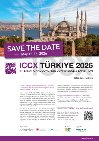 INTERNATIONAL CONCRETE CONFERENCE & EXHIBITIONICCX T%u00dcRKIYE 2026 _ May 13 -14, 2026SAVE THE DATE _Istanbul, T%u00fcrkiyewww.iccx.org OrganisationTrade Journal for the Autoclaved Aerated Concrete IndustryThe ICCX event series (International ConcreteConference & Exhibition) is coming to T%u00fcrkiyefor the fi rst time in 2026! Make a note of 13 and 14 May 2026, when the international concrete and precast industry will gather in the fascinating metropolis of Istanbul for a top-class industry meeting. Whether you are a concrete manufacturer, supplier, planner, construction company or researcher %u2013 ICCX T%u00fcrkiye offers you the ideal environment for gathering information, presenting yourself and making contacts.You can look forward to a two-day specialist programme featuring top-class international and regional speakers. The event will cover cutting-edge topics in prefabrication, building materials technology, and earthquake-proof construction, complemented by a trade exhibition showcasing leading suppliers in the industry. In addition, it offers excellent networking opportunities with experts from T%u00fcrkiye, Europe, the Middle East, and Central Asia, providing a valuable platform for innovation and the development of new business relationships.Constantly updated information for visitors andexhibitors can now be found on the event website.The event is organised by ad-media GmbH incooperation with local and international partners.ICCX T%u00dcRKIYE 2026 %u2013 Istanbul awaits you! Stay up to date by subscribing to our free ICCX newsletter %u2013 we look forward to welcoming you to Istanbul in May 2026.Join us on www.iccx.orgPartner Supporter