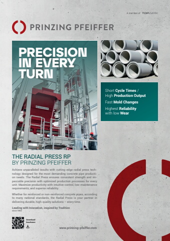 www.prinzing-pfeiffer.comAchieve unparalleled results with cutting-edge radial press technology designed for the most demanding concrete pipe production needs. The Radial Press ensures consistent strength and impeccable precision with optimized production processes for every unit. Maximize productivity with intuitive control, low-maintenance requirements, and superior reliability.Whether for reinforced or non-reinforced concrete pipes, accordingto many national standards, the Radial Press is your partner indelivering durable, high-quality solutions %u2013 every time.Leading with Innovation, inspired by Traditionsince 1862Short Cycle Times /High Production OutputFast Mold ChangesHighest Reliabilitywith low WearThe RAdiAl PRess RP by Prinzing PFeiFFerDownloadbrochuresPrecision in everyTurn